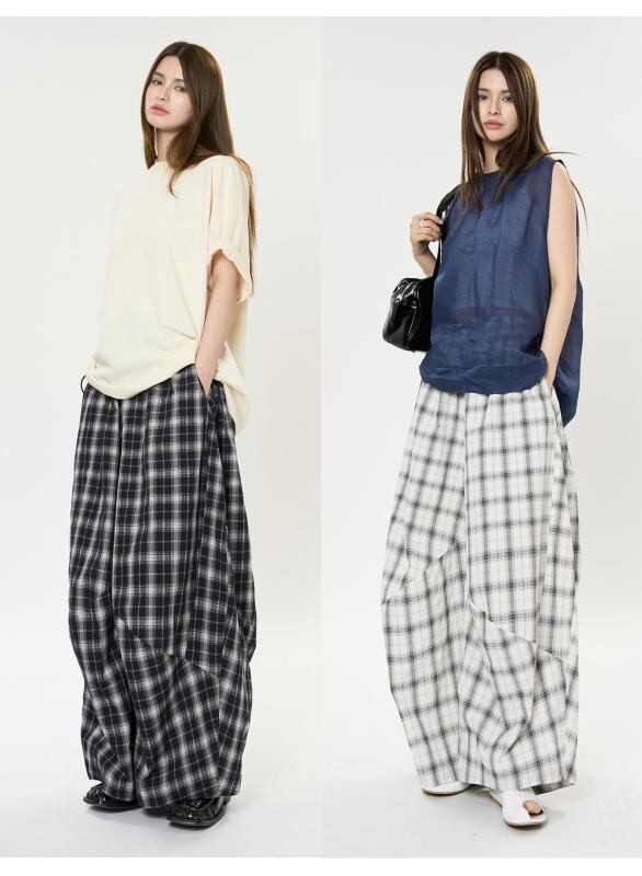 カジュアルパンツ レディース 日系 レトロ チェック柄 切り替えデザイン バルーンシルエット ゆったり ルーズフィット ハイウエスト 細見え 綿 ロングパンツ