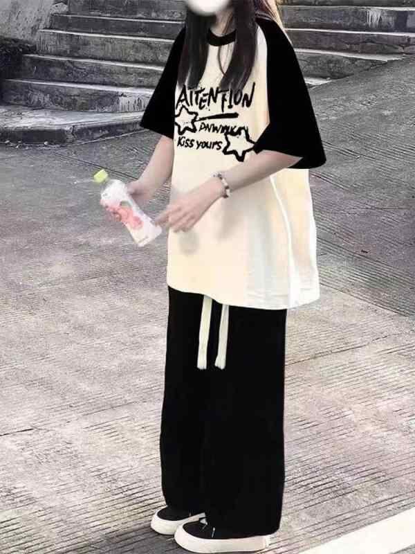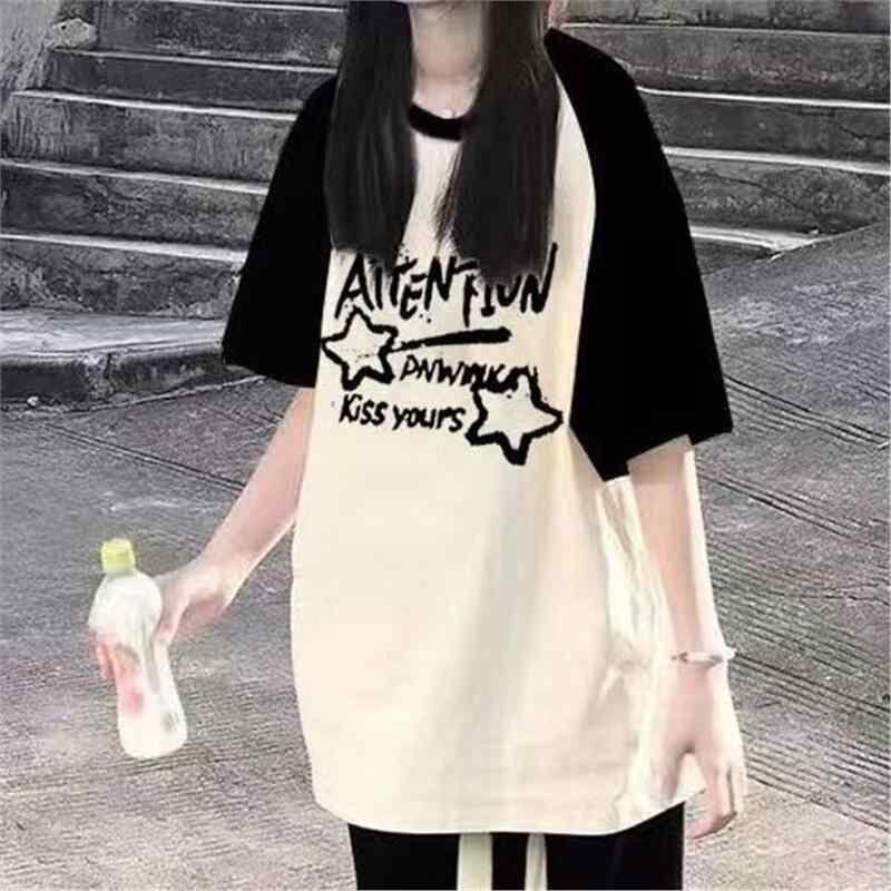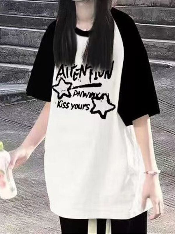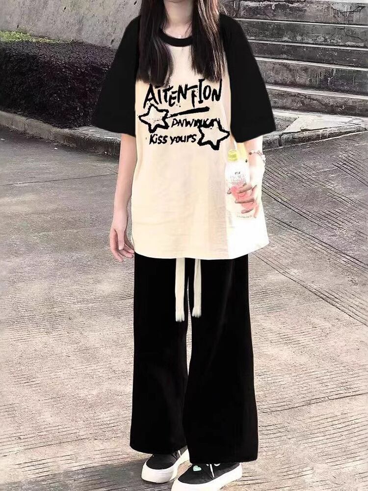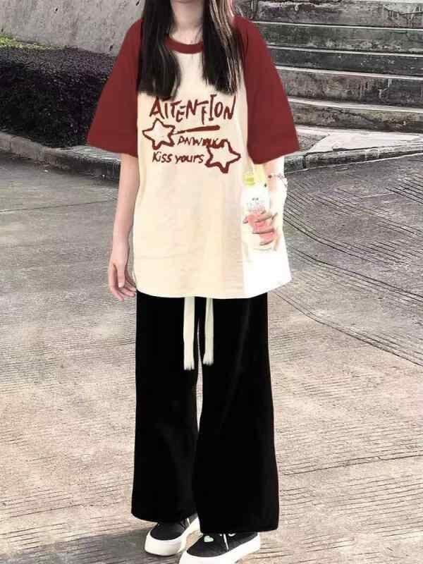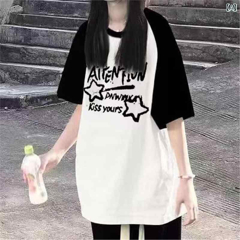Tシャツ ジュニア 女子学生 夏 半袖 塩系 配色 ゆったり カジュアル 綿 原宿系 日韓カジュアル インスタ風 アニメ カートゥーン 柄 プルオーバー ミドル丈 ラウンドネック ブラック ホワイト ワインレッド アプリコット