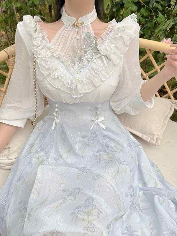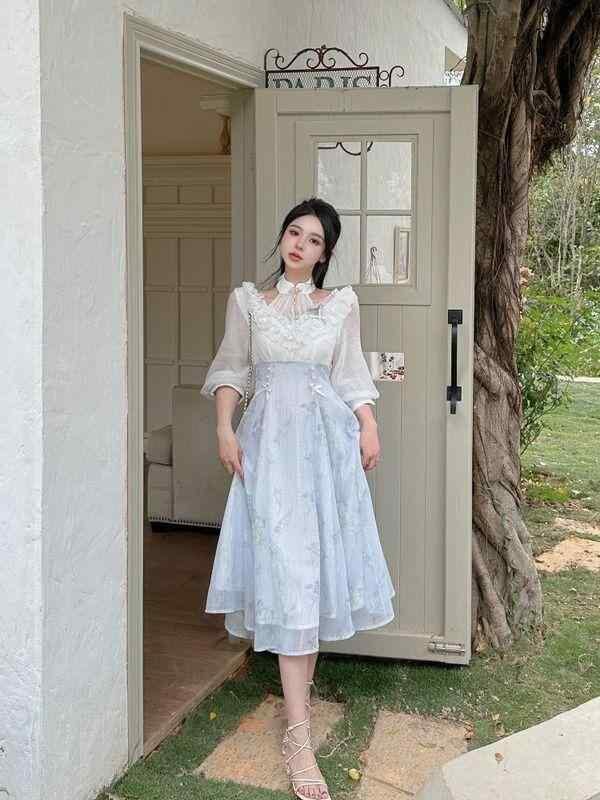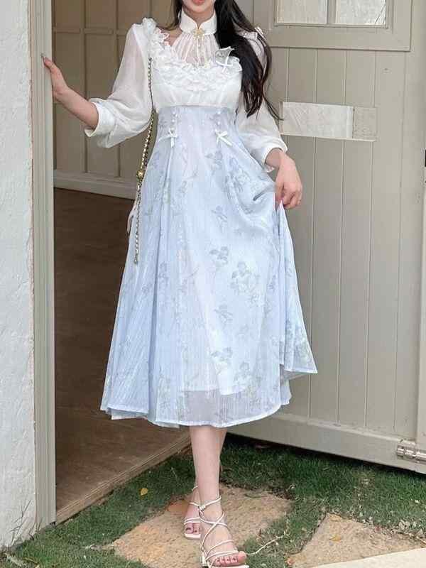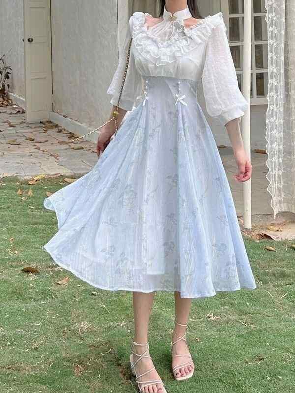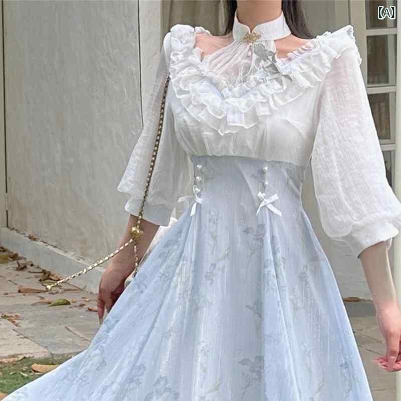 ワンピース レディース 大きいサイズ ゆったり 体型カバー フレンチスタイル プリンセスライン ロリータ風 高級感 ランタンスリーブ 七分袖 フリル襟 ボリュームフレア ミディ丈 日常使い レトロ