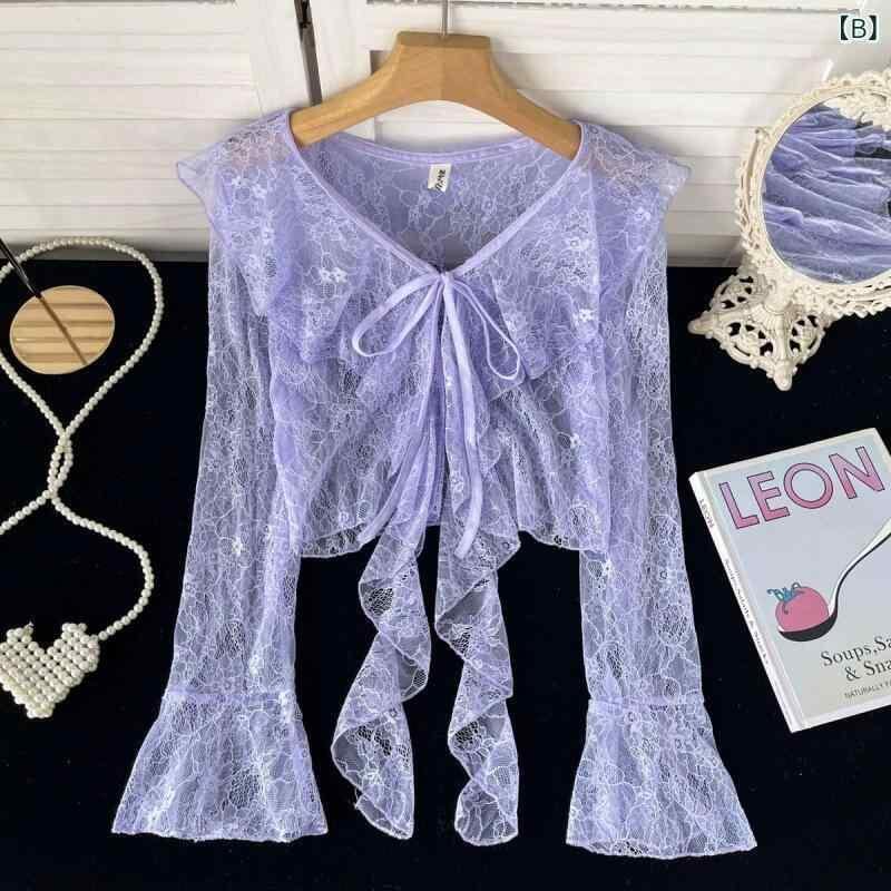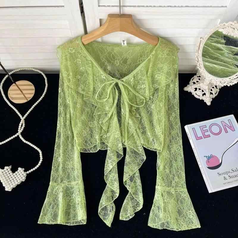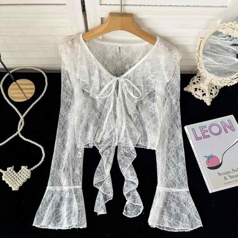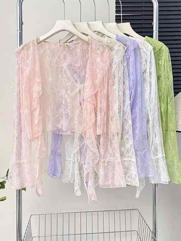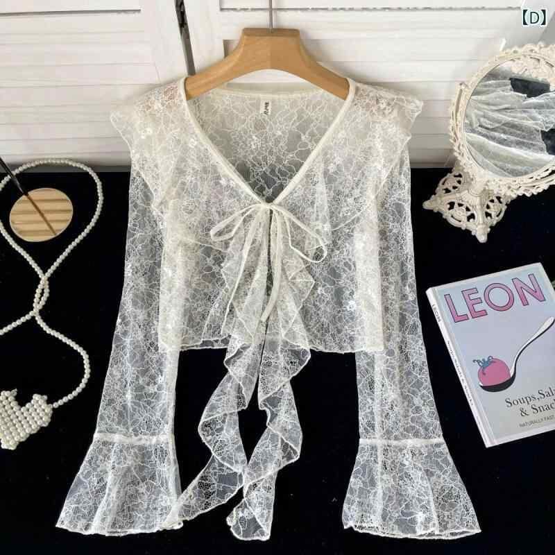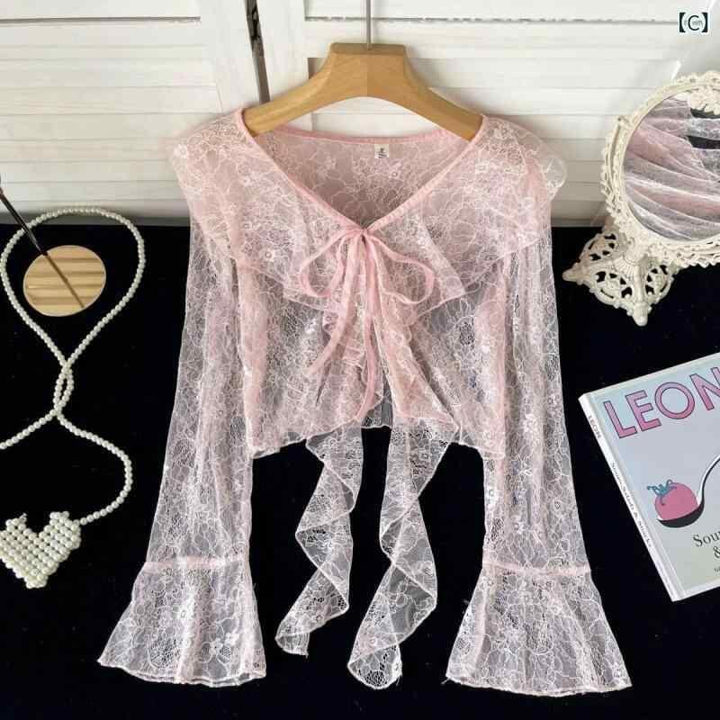 カーディガン レディース ショート丈 薄手 シフォン UVカット レース フリル リボンタイ フレアスリーブ Vネック 長袖 冷房対策 オフィス カジュアル 羽織り トップス