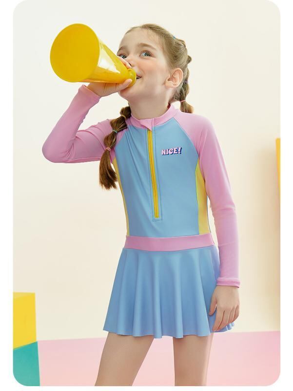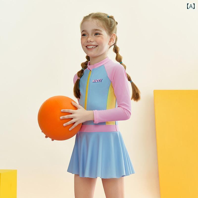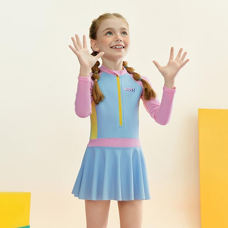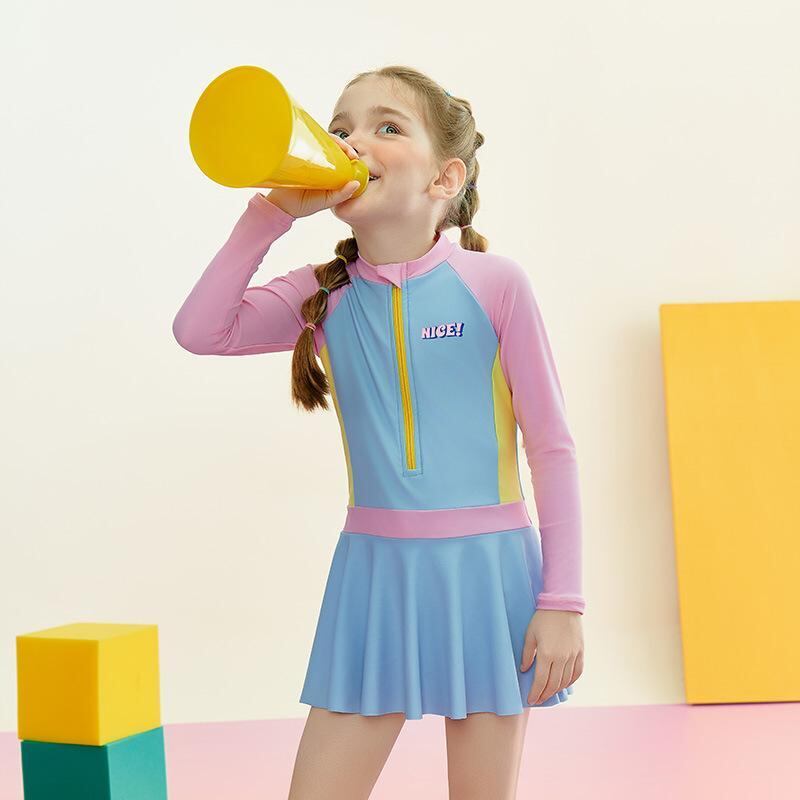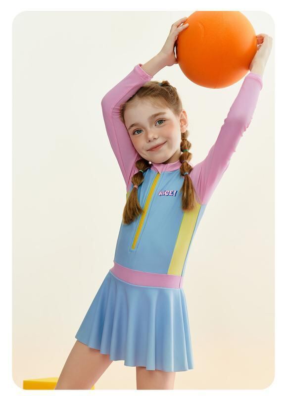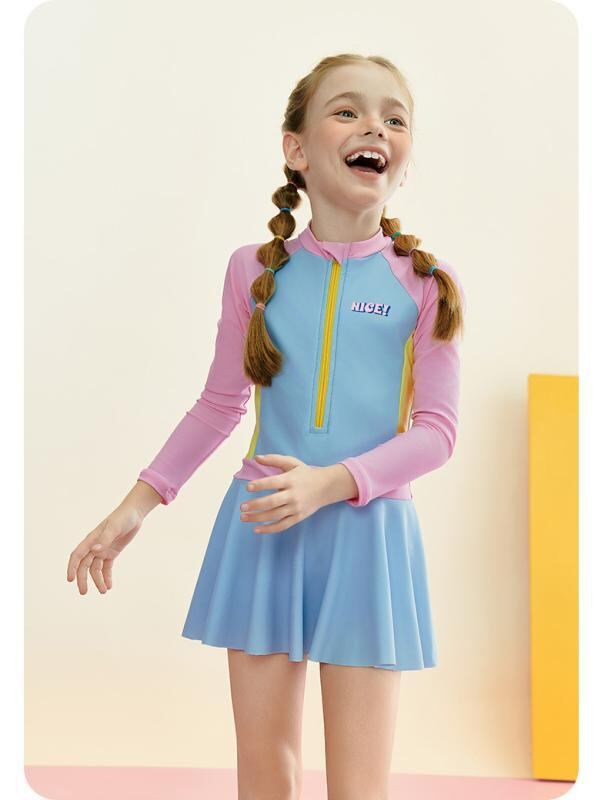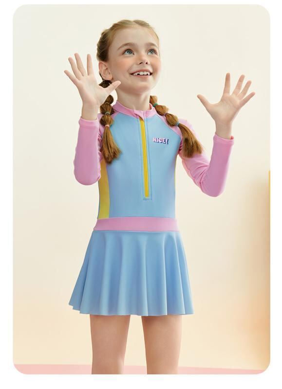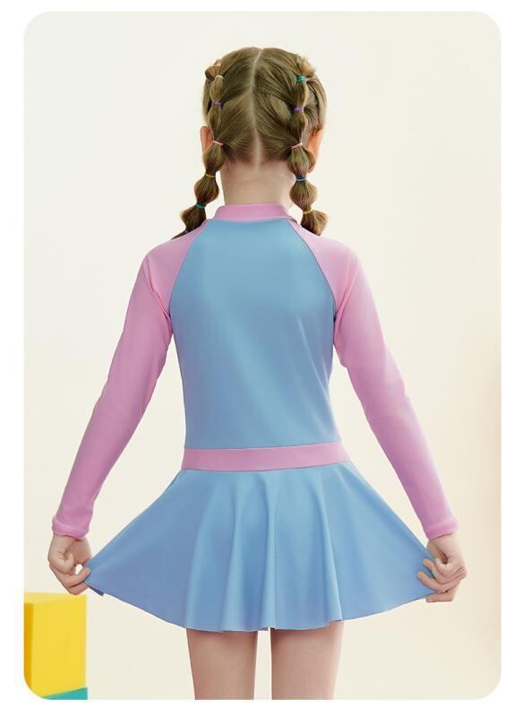 水着 キッズ ジュニア ガールズ 長袖 スカートタイプ ワンピース スポーティー プール 温泉 スイミング 海水浴 レジャー かわいい ナイロン ブルー 体型カバー