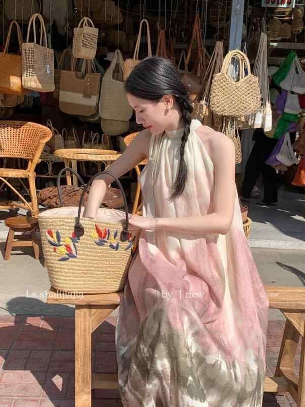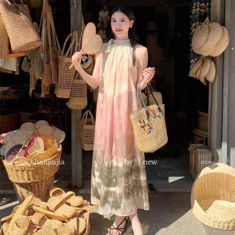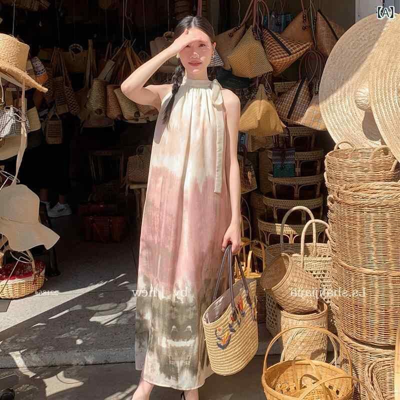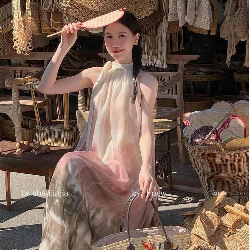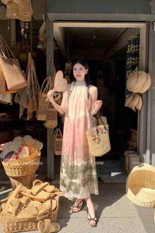 ワンピース レディース フェミニン スウィートテイスト マルチカラー タイダイ柄 ゆったり オフショルダー ロング丈 Aライン 着痩せ効果 上品 エレガント シフォン素材 クルーネック ノースリーブ ピンク