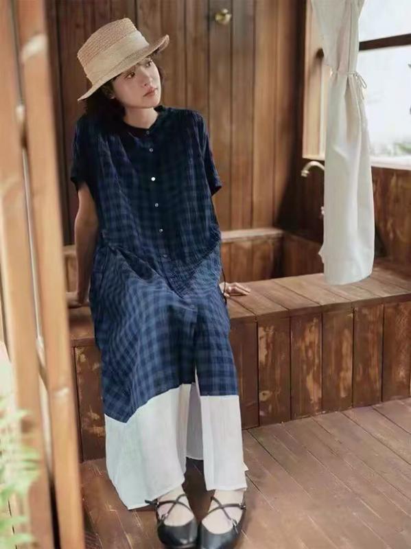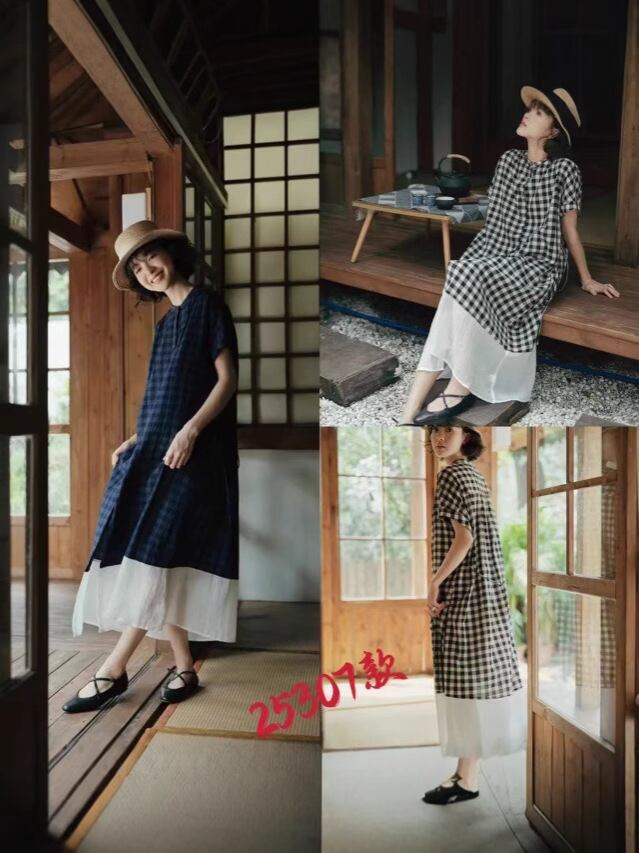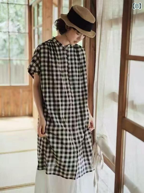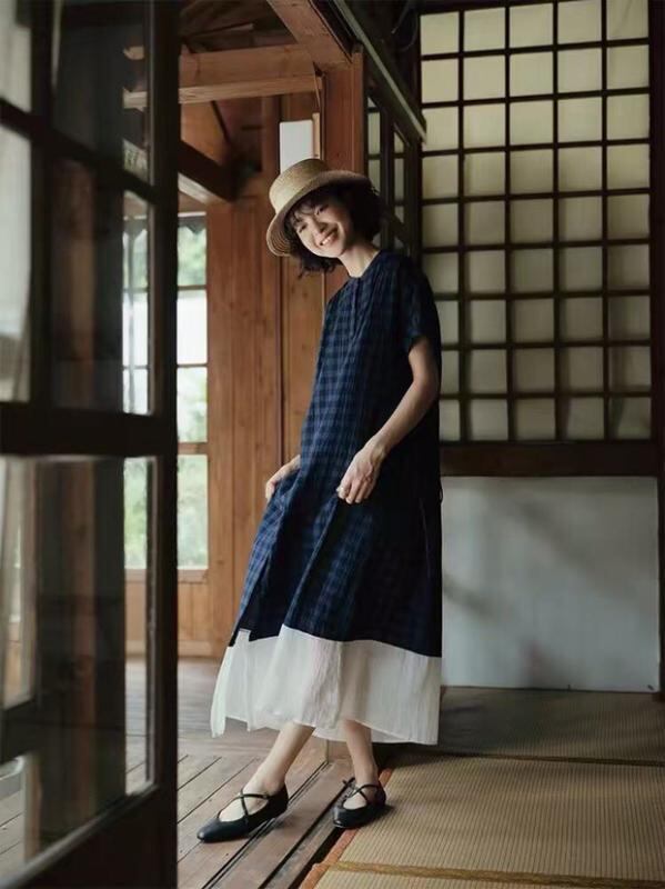 ワンピース レディース 森ガール風 レトロ チェック柄 切り替えデザイン コットンリネン 半袖 丸首 ゆったり ミディ丈 体型カバー カジュアル ナチュラルスタイル ネイビー ブラック