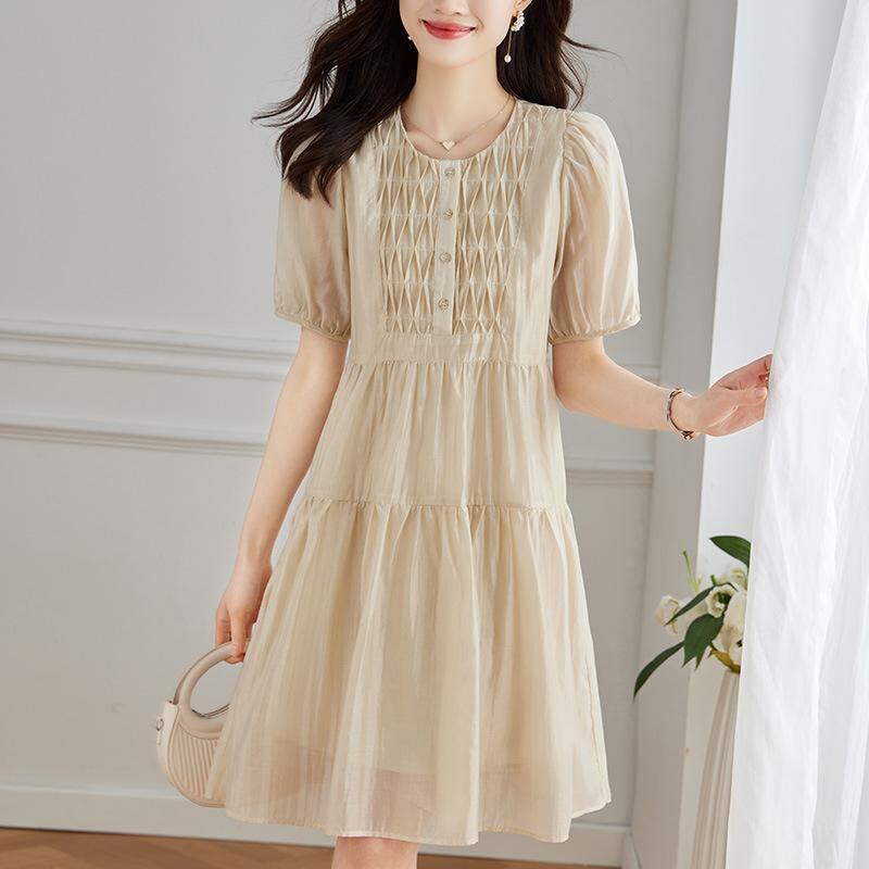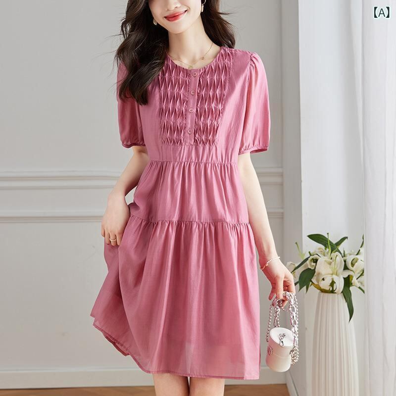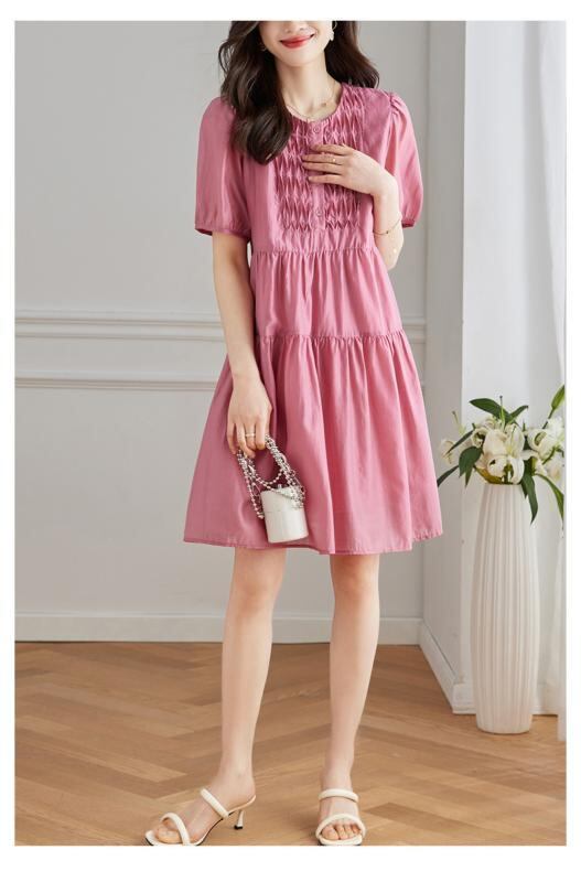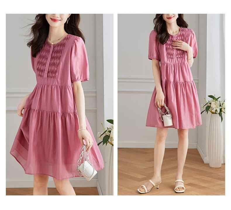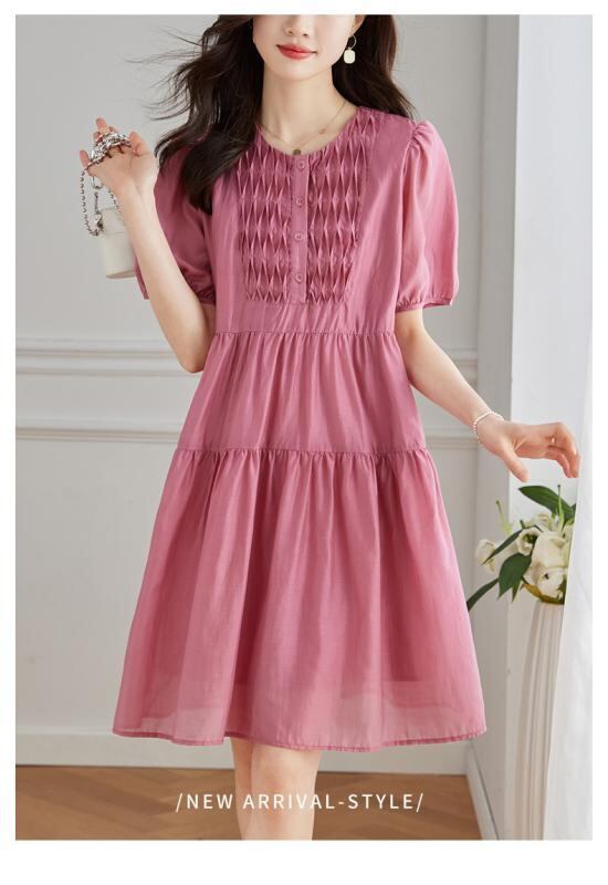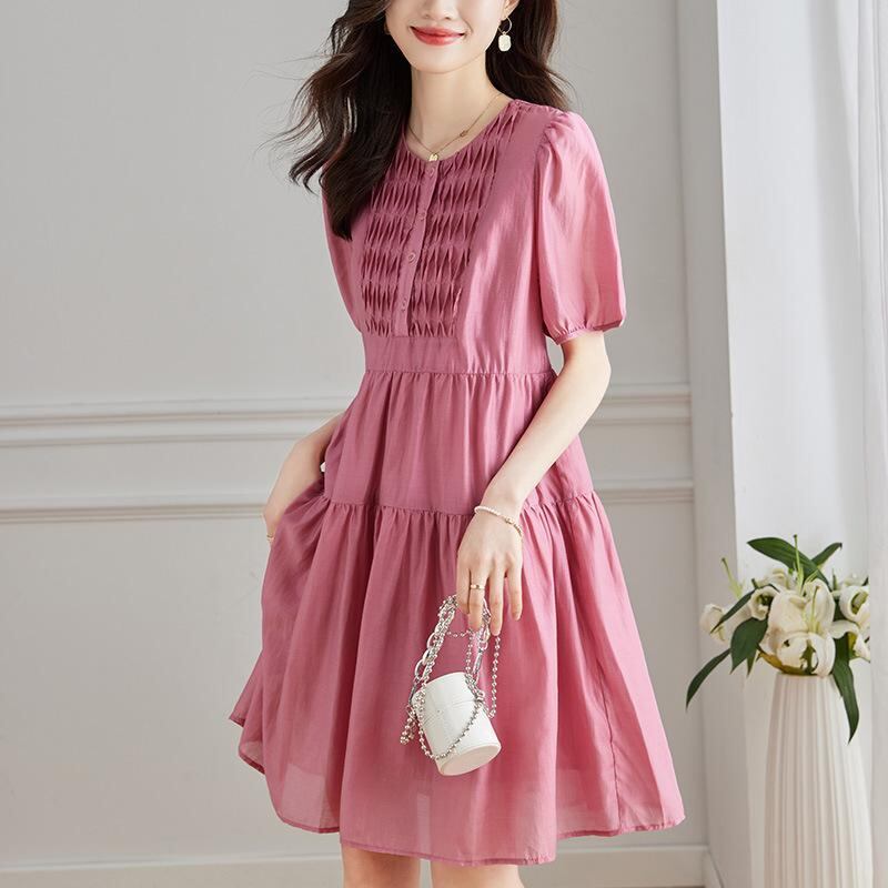 ワンピース レディース テンセル リヨセル素材 ミモレ丈 Aライン ウエストシェイプ 細見え効果 半袖 パフスリーブ クルーネック 無地 ローズレッド 通勤 オフィス 上品 カジュアル