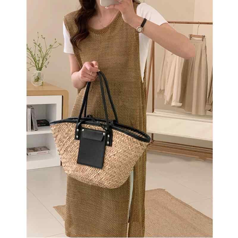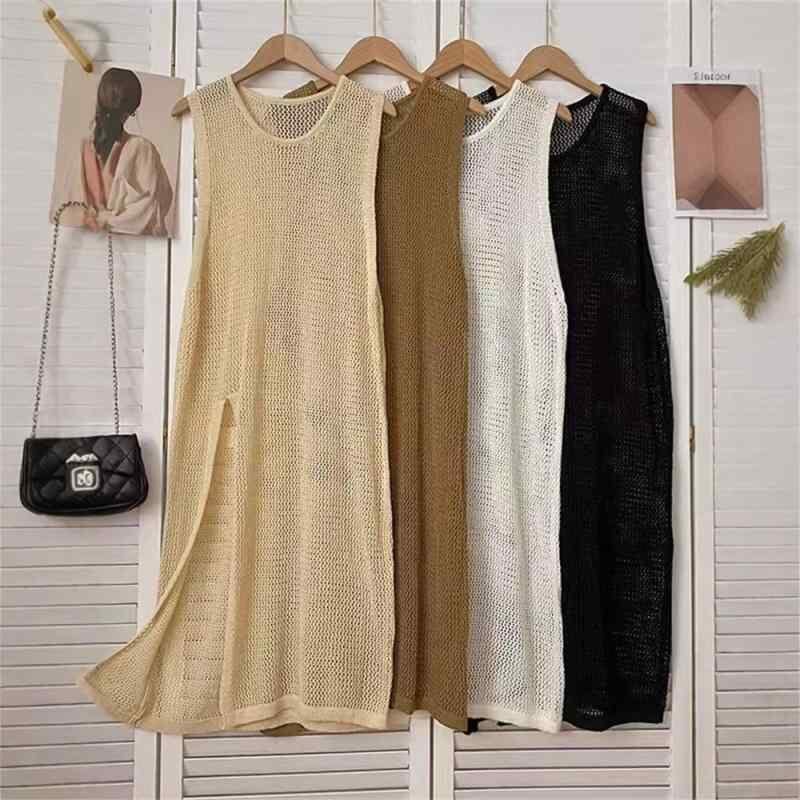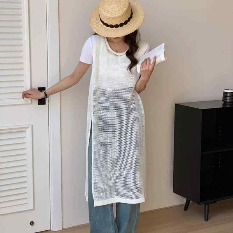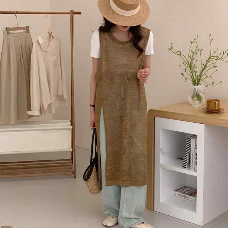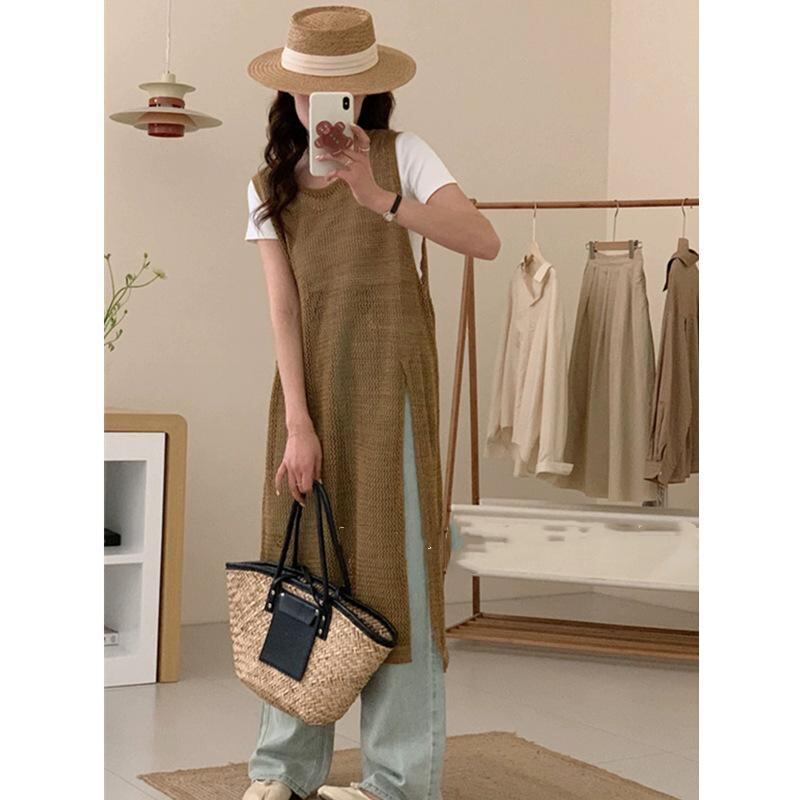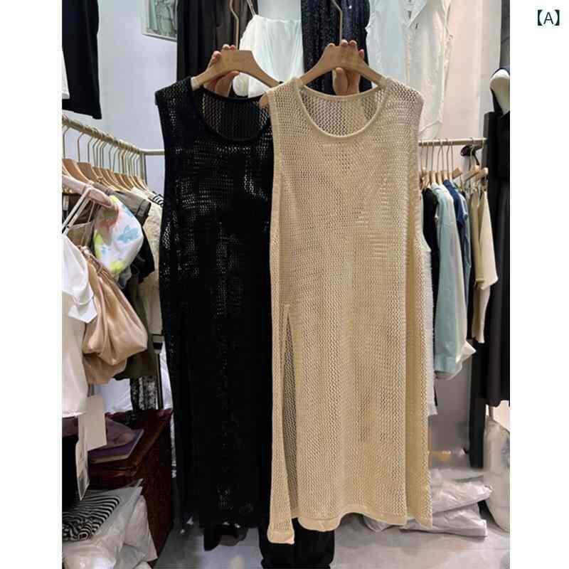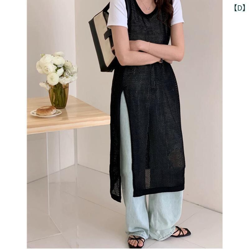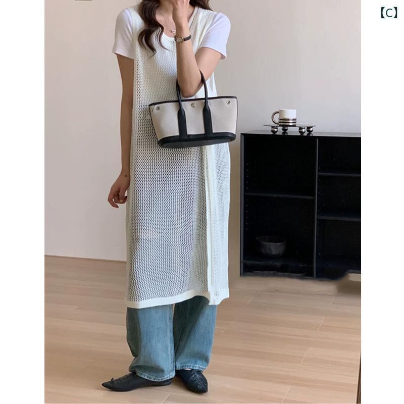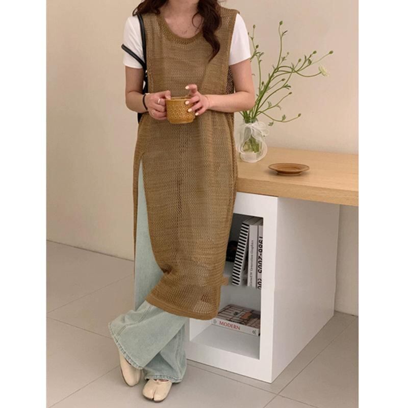 ワンピース レディース 夏 カジュアル シンプル 無地 クルーネック ノースリーブ ゆったり 透かし編み スリット入り ミディ丈 ポリエステル ストレートシルエット 体型カバー