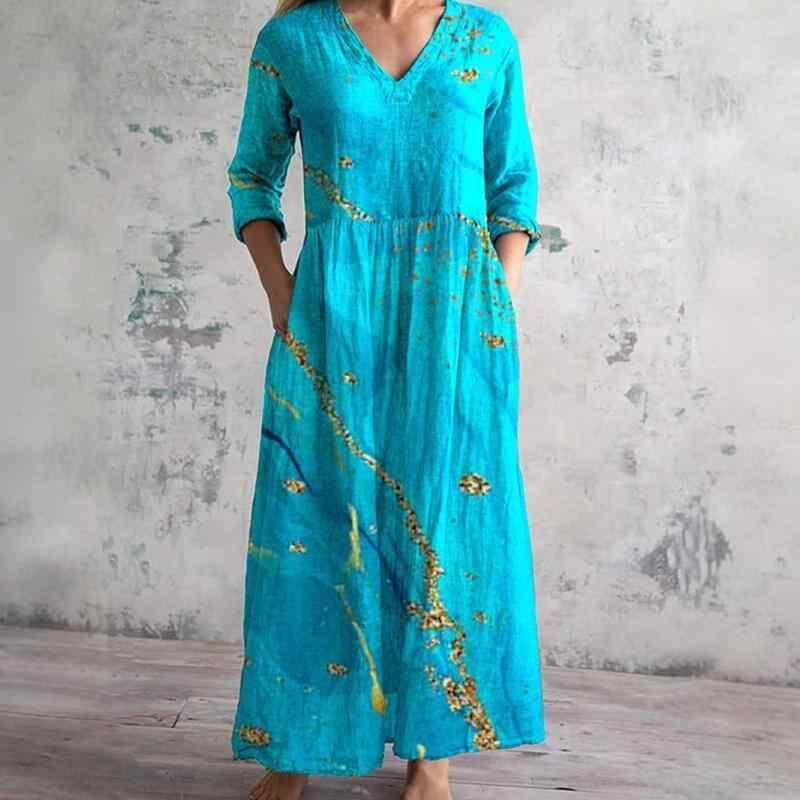 ワンピース レディース 欧米風 3Dプリント 人物柄 Vネック 七分袖 ゆったり ミディ丈 ポリエステル素材 タウンユース カジュアル リラックス