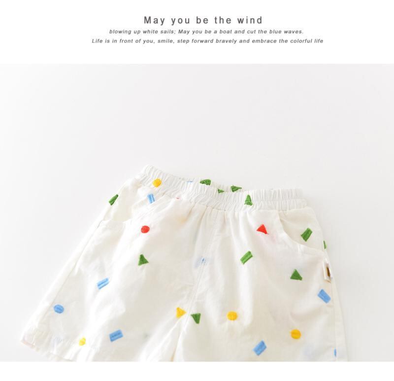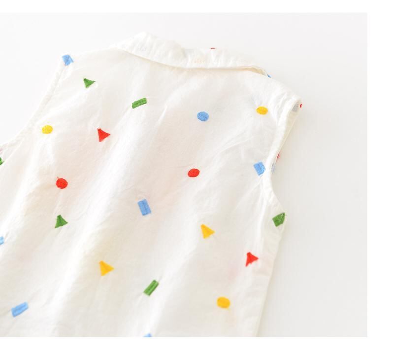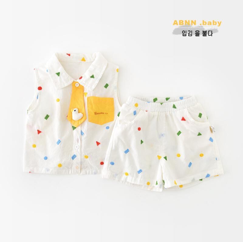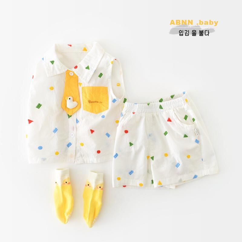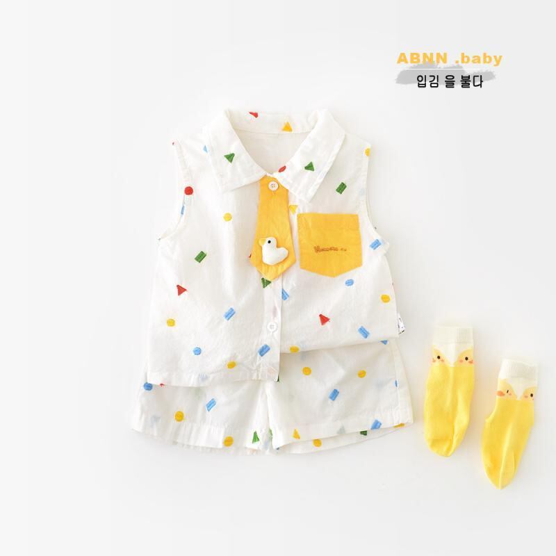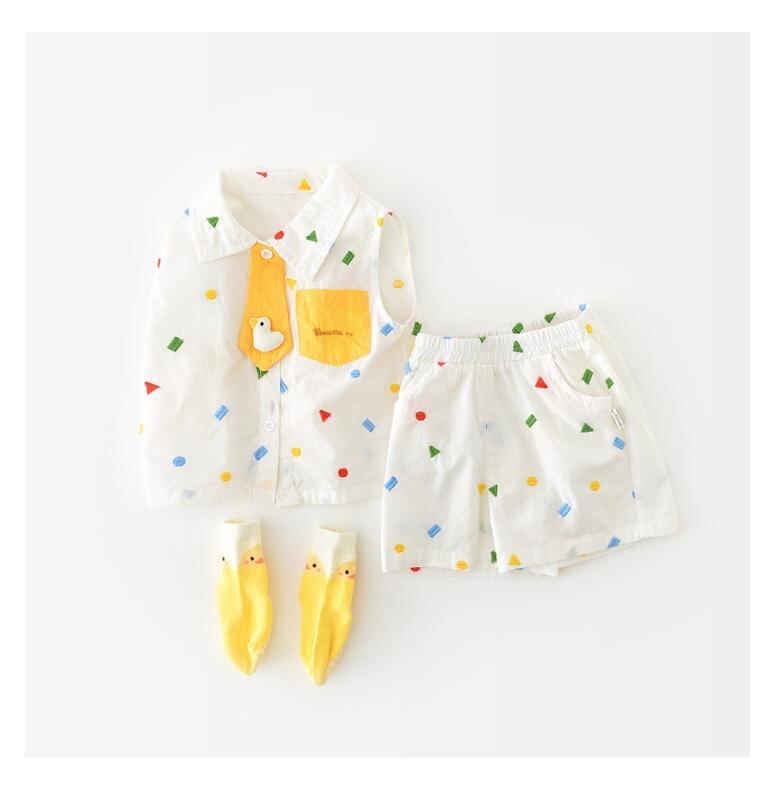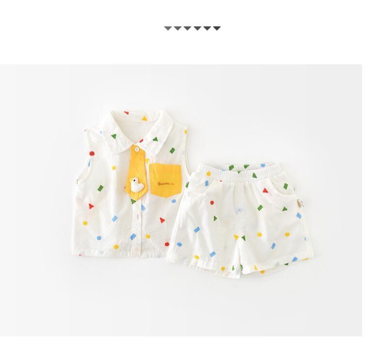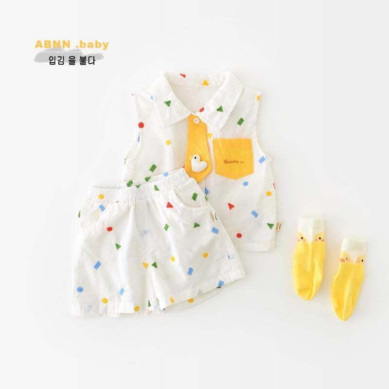 ベビー服 男の子 女の子 夏服 夏用 韓国風 総刺繍 幾何学模様 アヒル柄 カートゥーン柄 襟付き ノースリーブ ベスト ショートパンツ 2点セット 前開き 綿素材 柔らかい 薄手 肌触り ソフトタッチ カジュアル 普段着