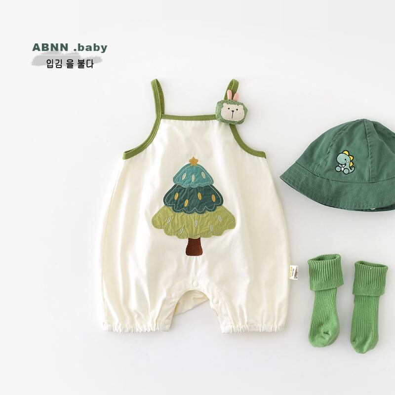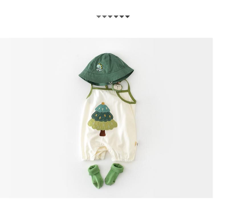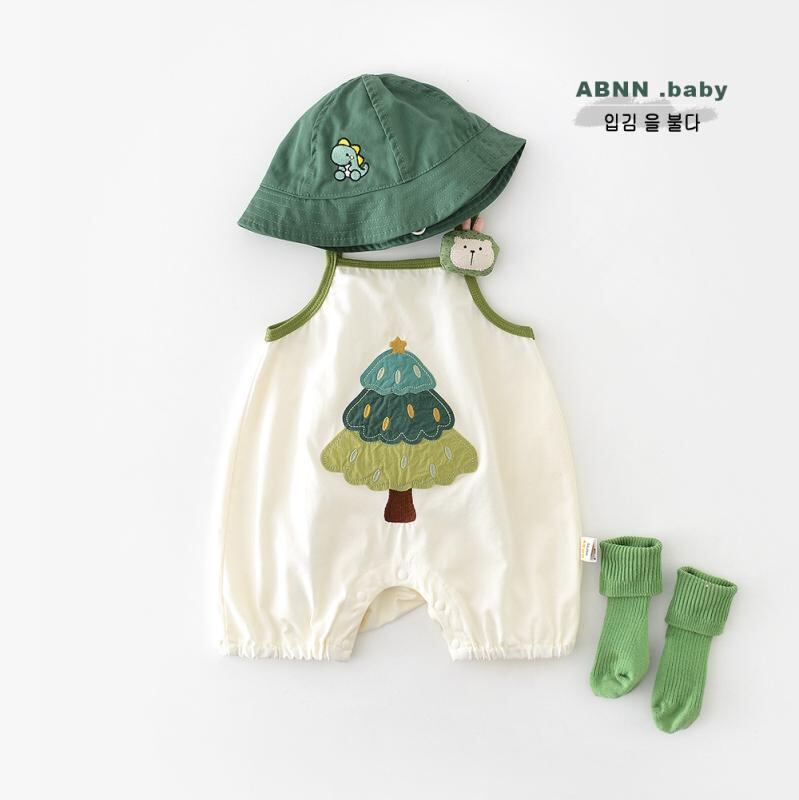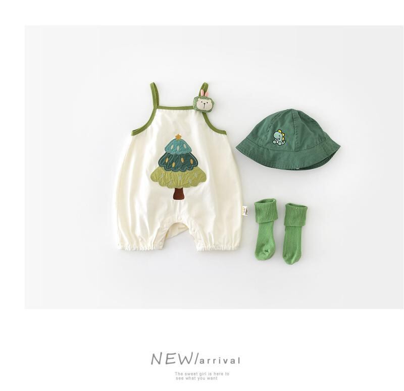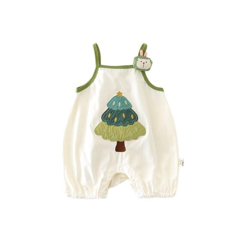 ロンパース カバーオール ベビー キッズ 男女兼用 かわいい カートゥーン ツリー柄 アップリケ 刺繍 ノースリーブ キャミソール 綿混 薄手 涼しい 夏物 部屋着 普段着 縫い目フラット アイボリー