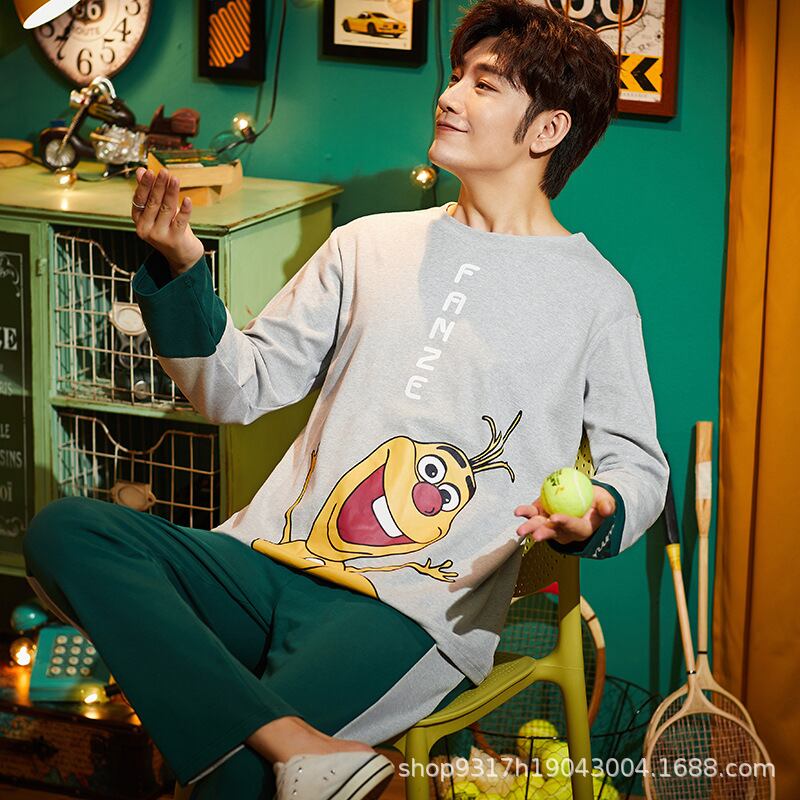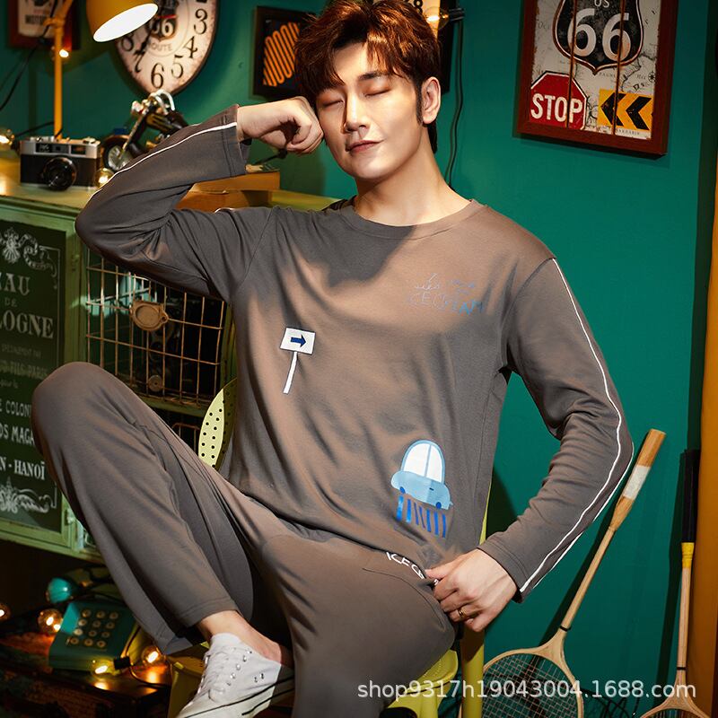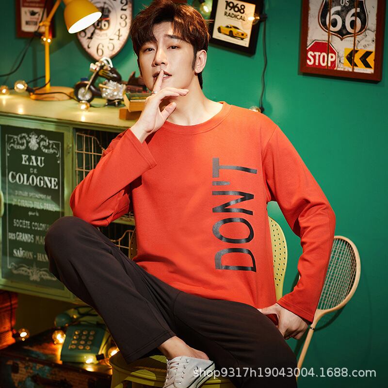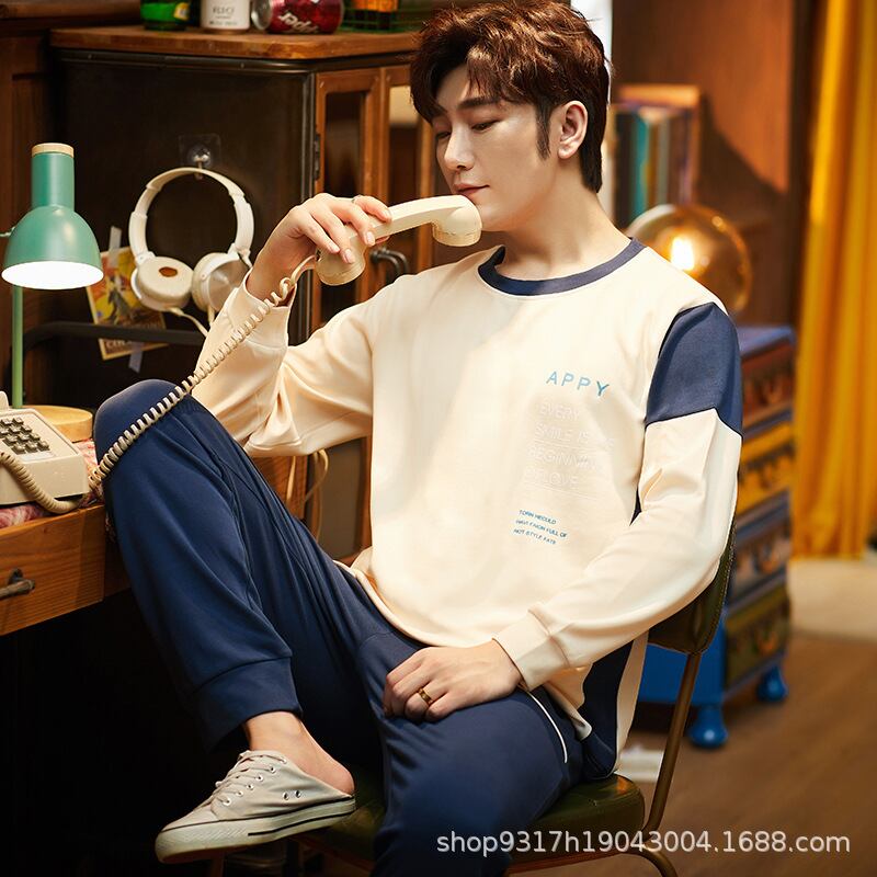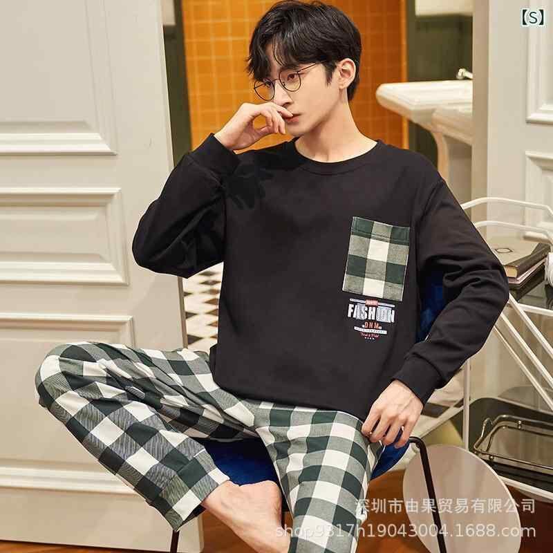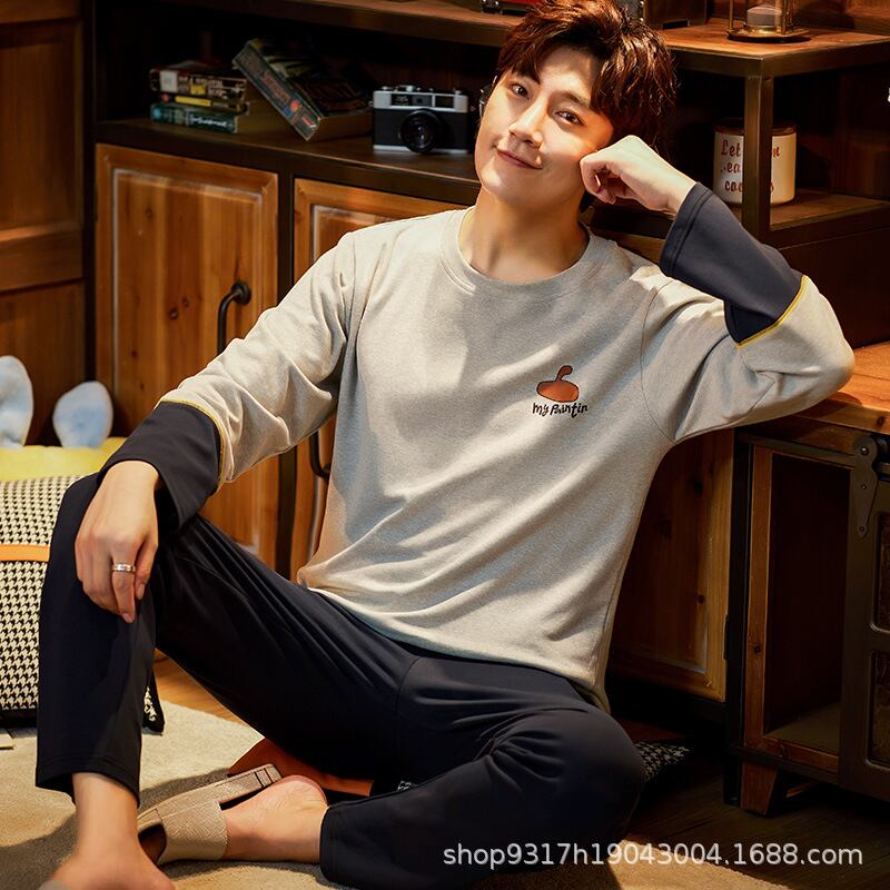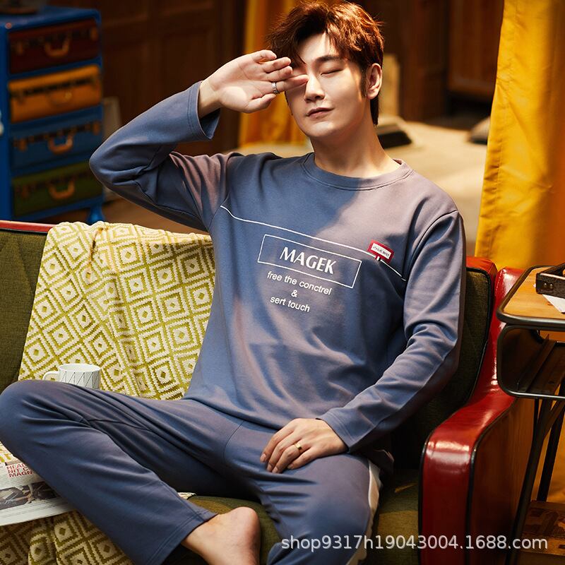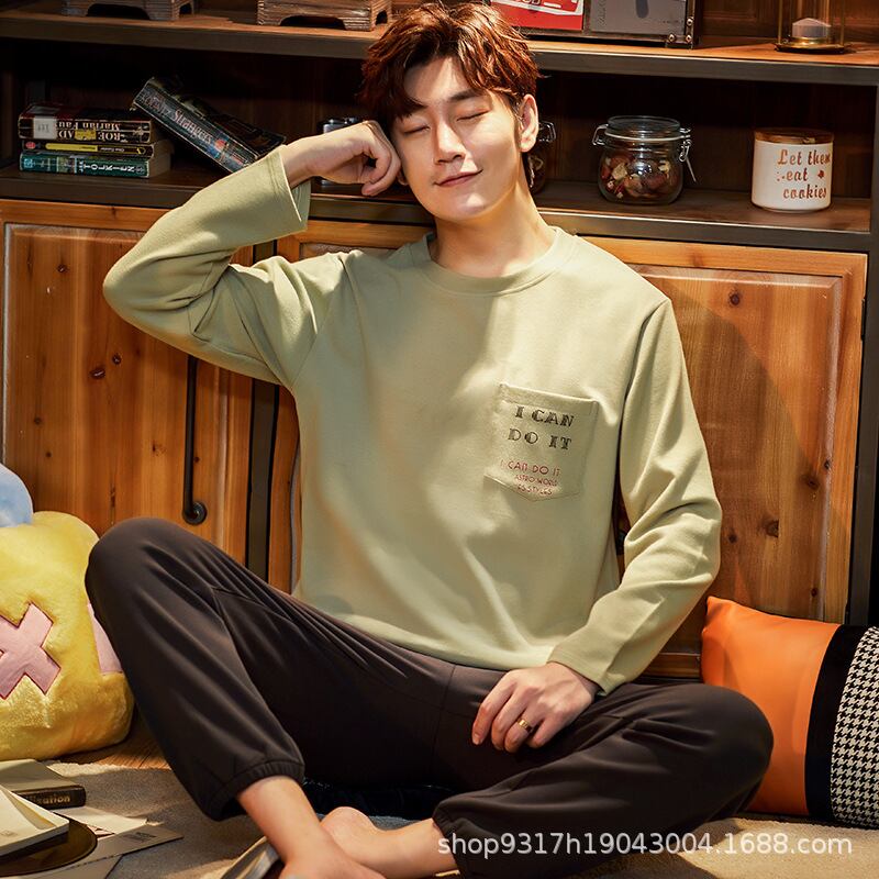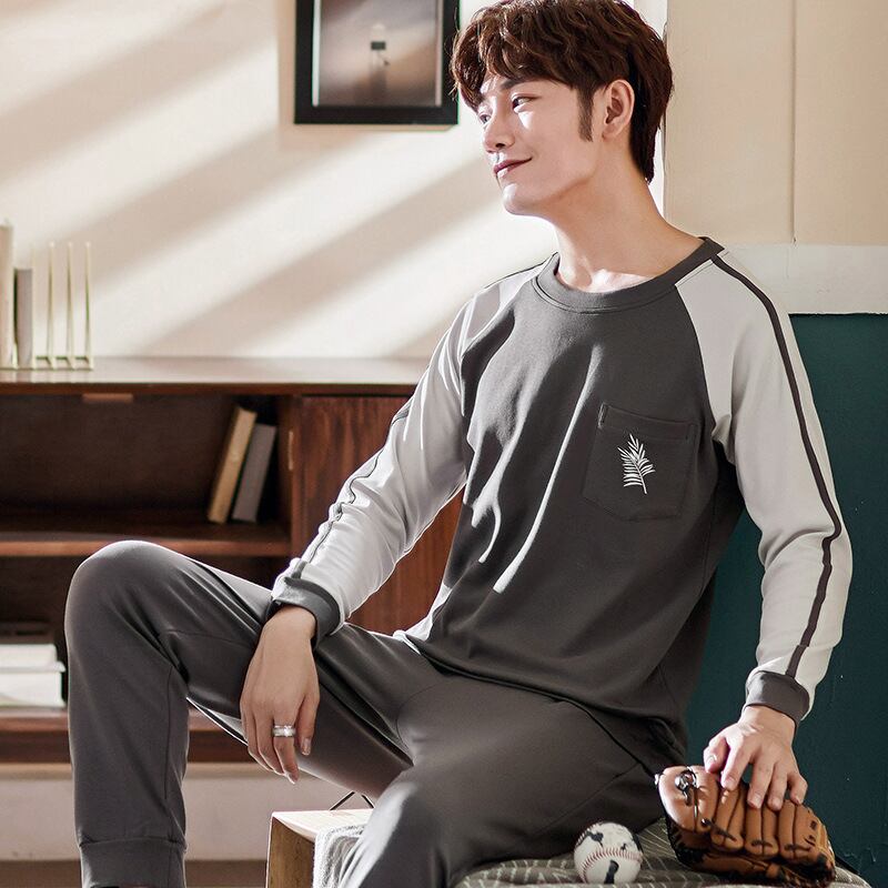 パジャマ メンズ ルームウェア 綿100% コットン クルーネック 丸首 長袖 ロングスリーブ プルオーバー ロングパンツ 上下セット 部屋着 普段使い 通気性 快適 抗菌防臭 春 秋 オールシーズン