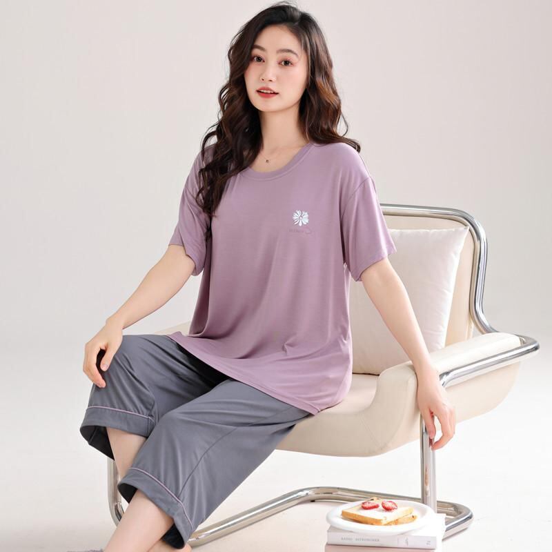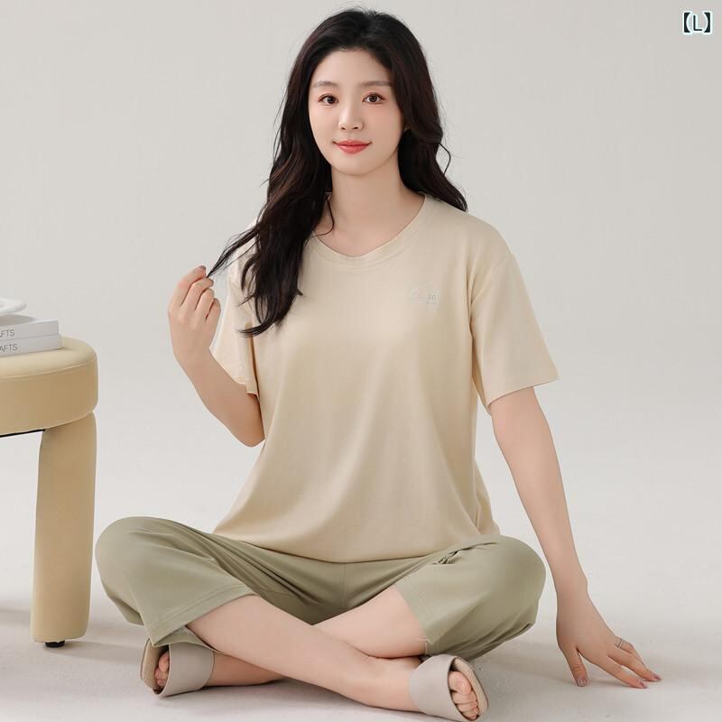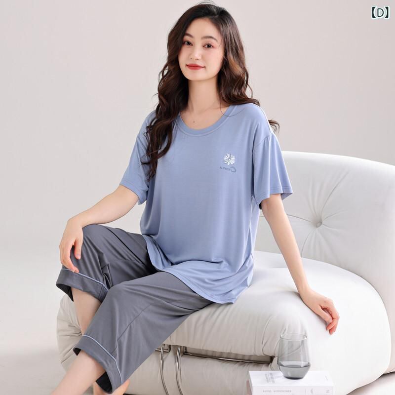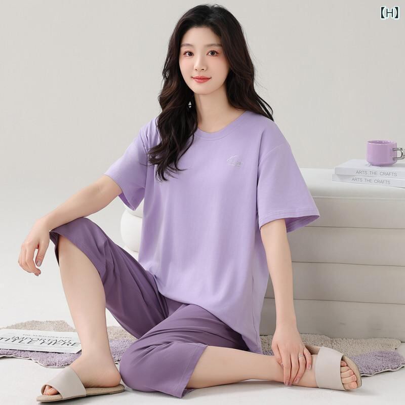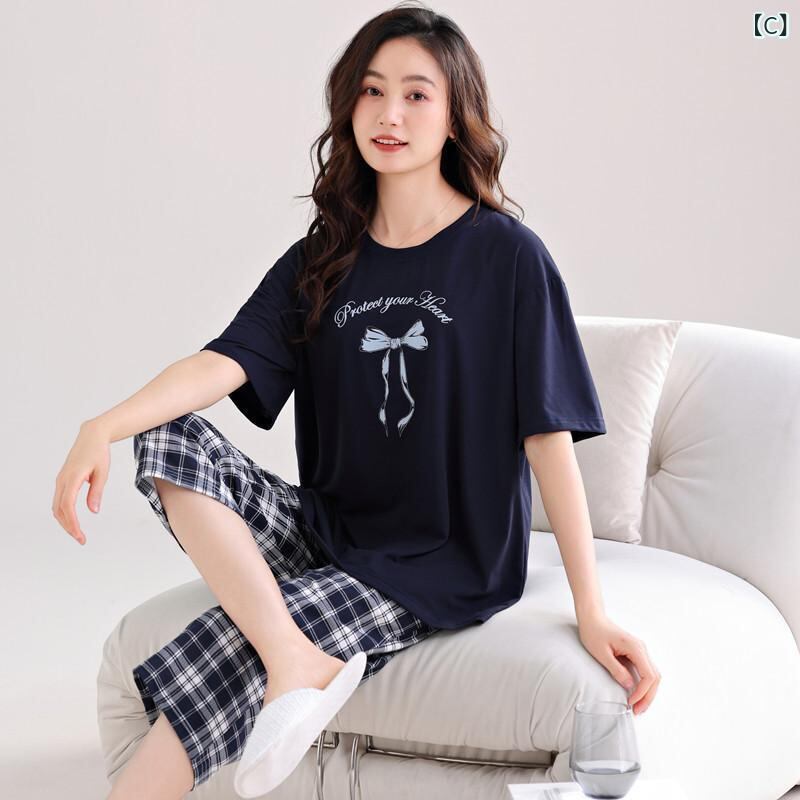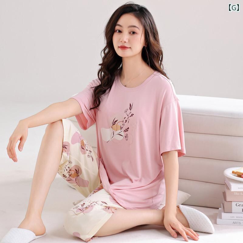 パジャマ ルームウェア レディース 大きいサイズ 半袖 七分丈パンツ 上下セット ゆったり リラックスフィット 薄手 涼しい 接触冷感 モダール ポリエステル ラウンドネック 部屋着 外出着 夏