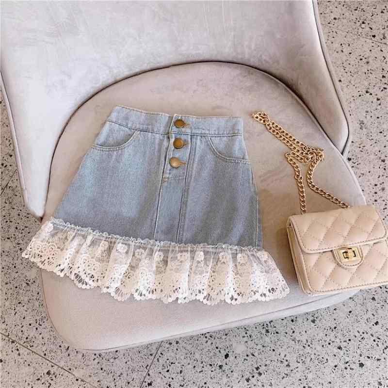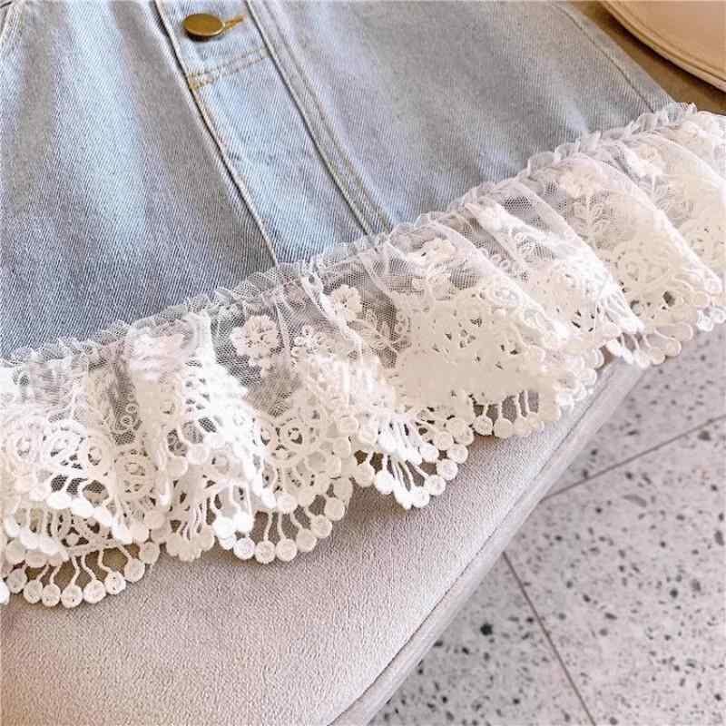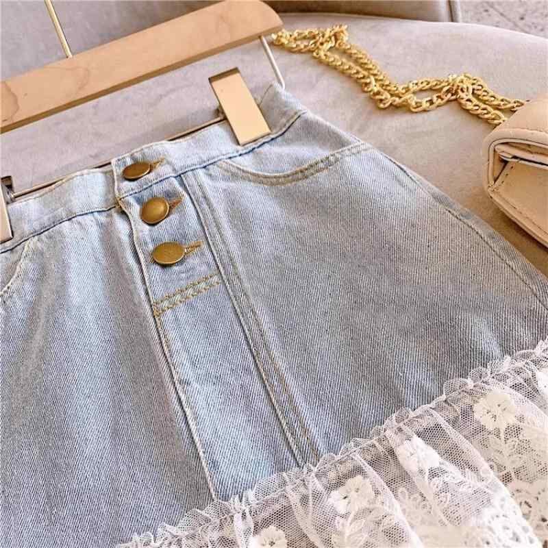 スカート キッズ 女の子 デニム マーメイドスカート 夏用 ミニ丈 レースフリル Aライン コットンブレンド ブルー かわいい おしゃれ 普段着 お出かけ 通学