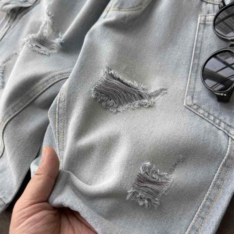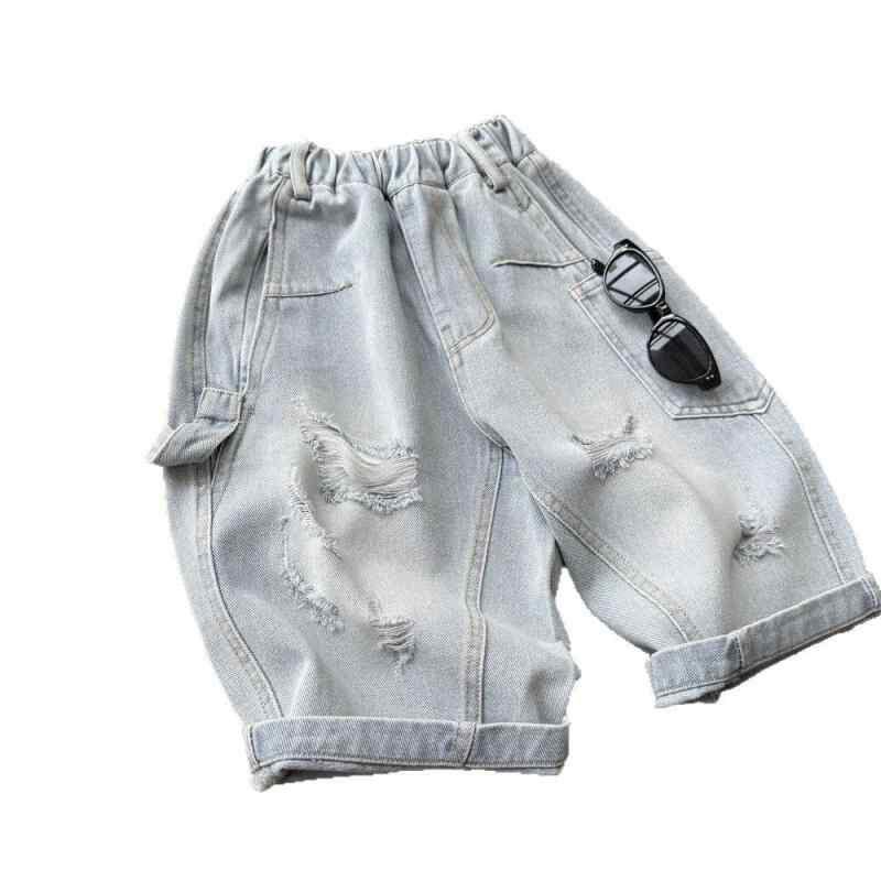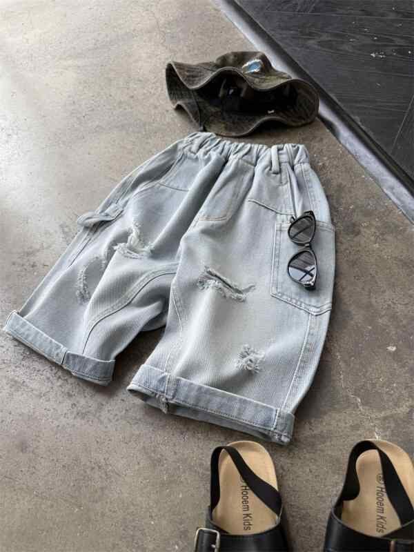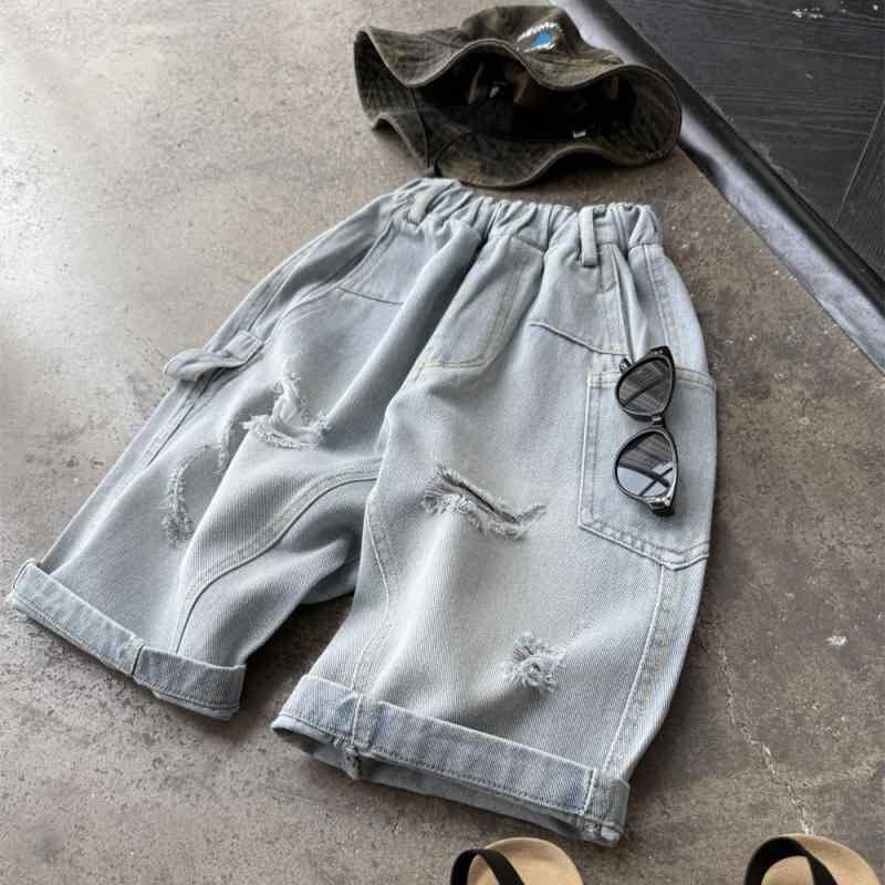 キッズ 男の子 デニムパンツ ダメージ加工 七分丈 薄手 軽量 夏用 カジュアル アメカジ 綿素材 ライトブルー クロップドパンツ ウエストゴム 普段使い 通学