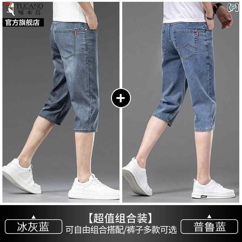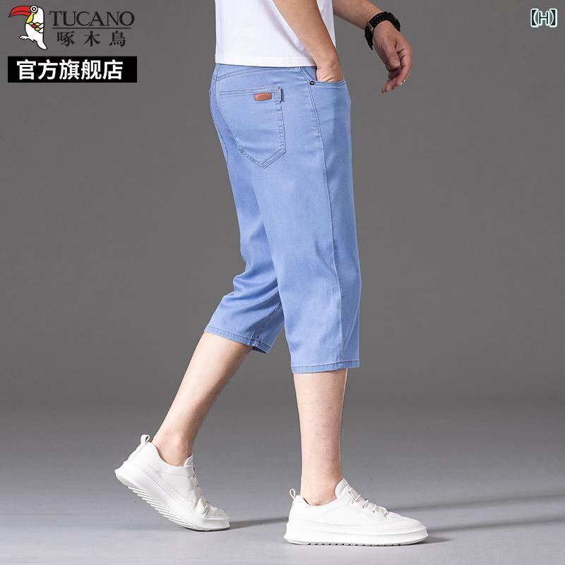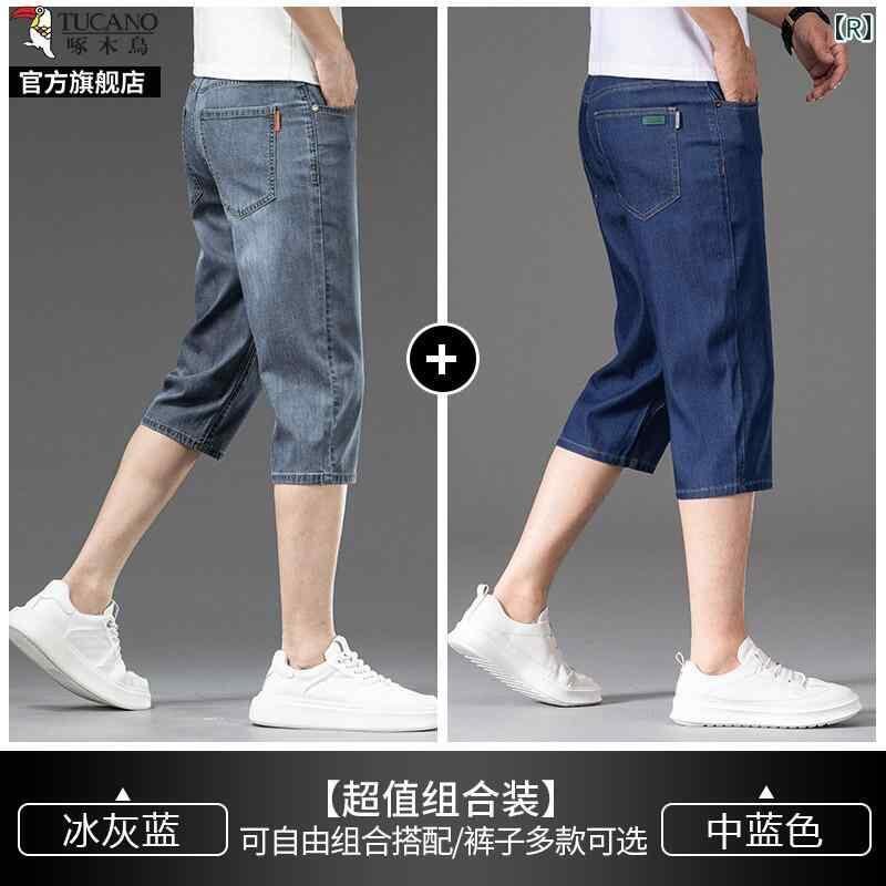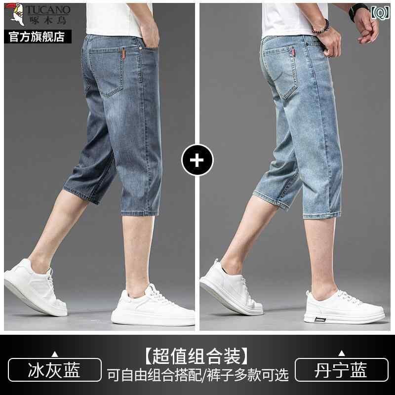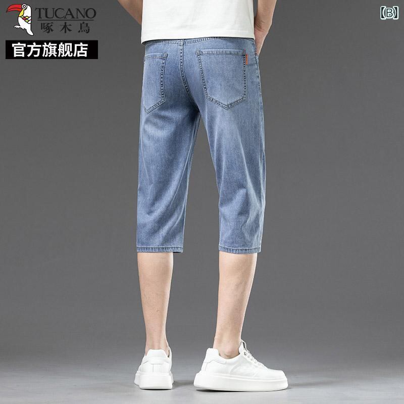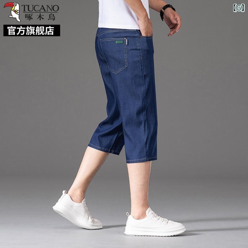 デニムパンツ メンズ 男性用 七分丈 クロップド丈 夏用 薄手 軽量 接触冷感 微ストレッチ ストレートシルエット ハイウエスト ゆったり ルーズフィット カジュアル 普段使い リラックスウェア ブルー系 青