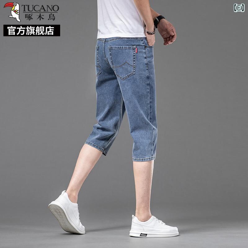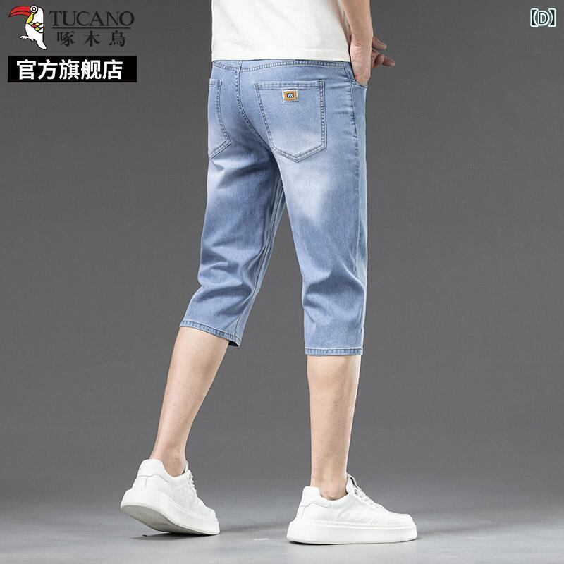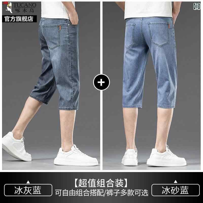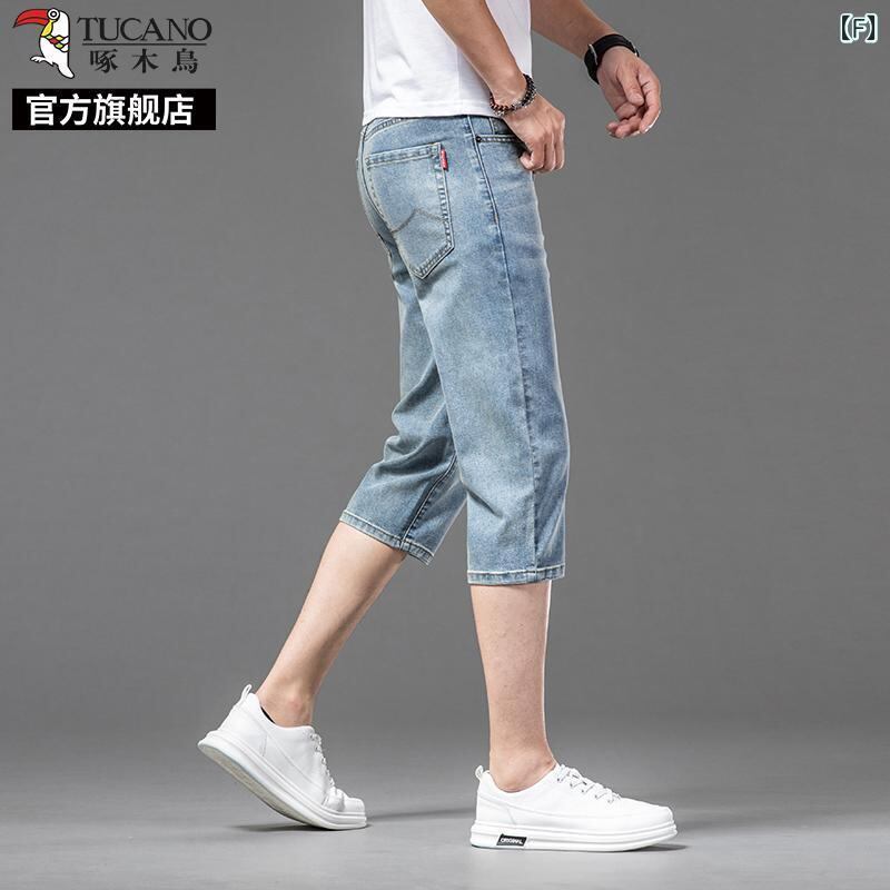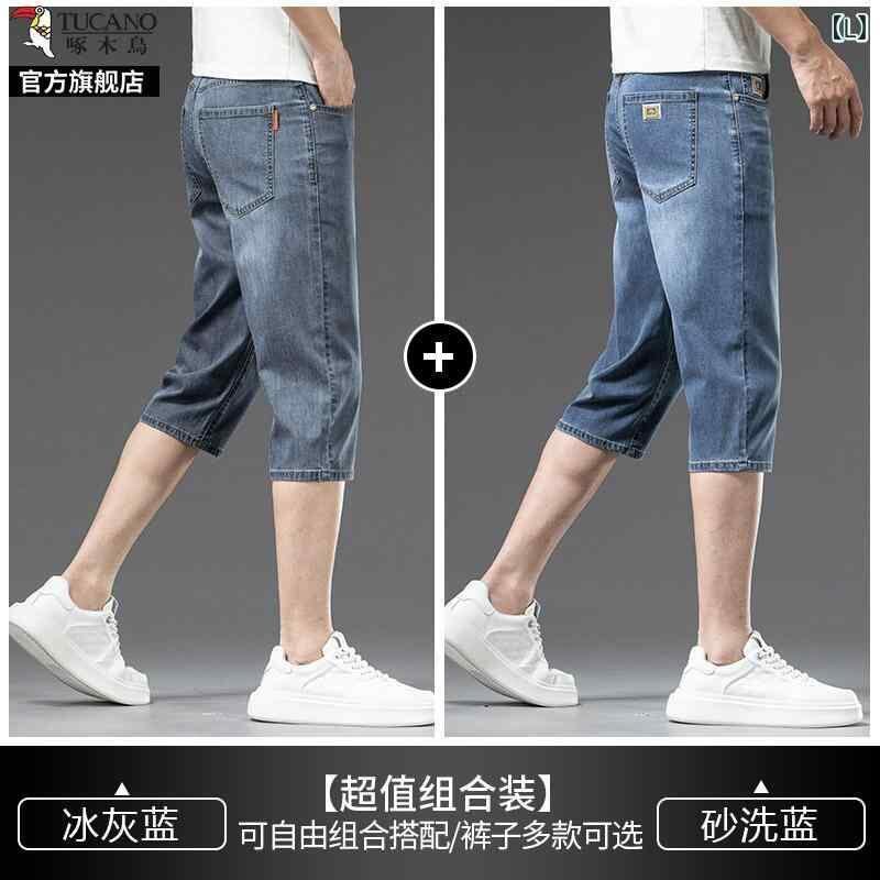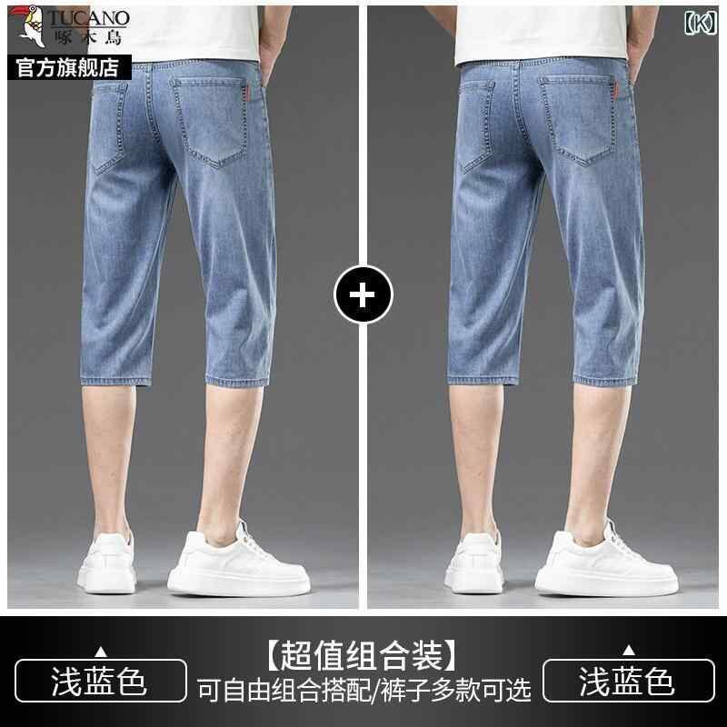 デニムパンツ メンズ 男性用 七分丈 クロップド丈 夏用 薄手 軽量 接触冷感 微ストレッチ ストレートシルエット ハイウエスト ゆったり ルーズフィット カジュアル 普段使い リラックスウェア ブルー系 青