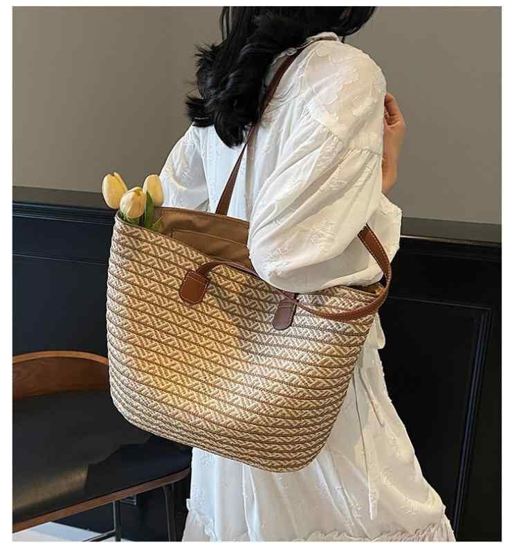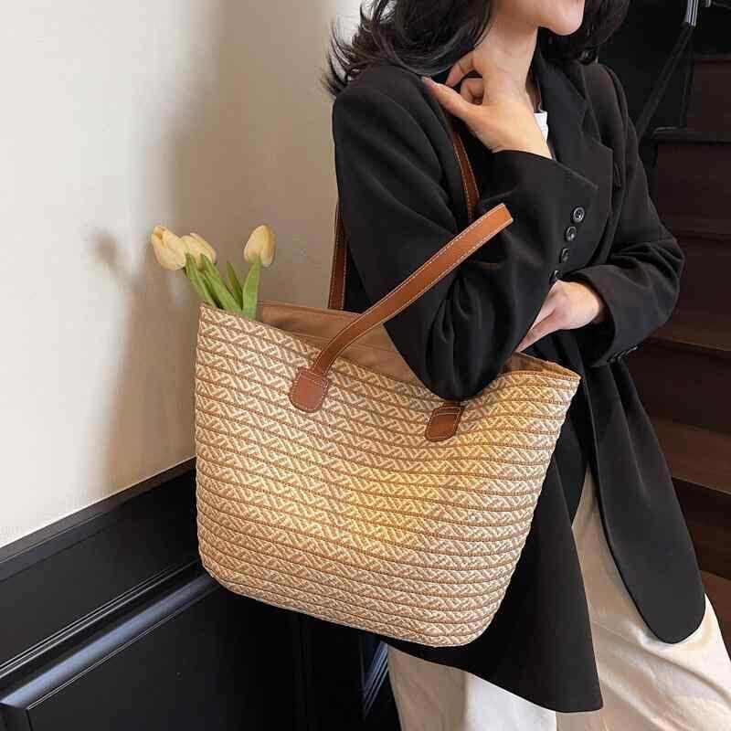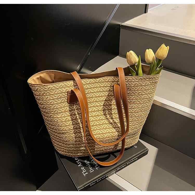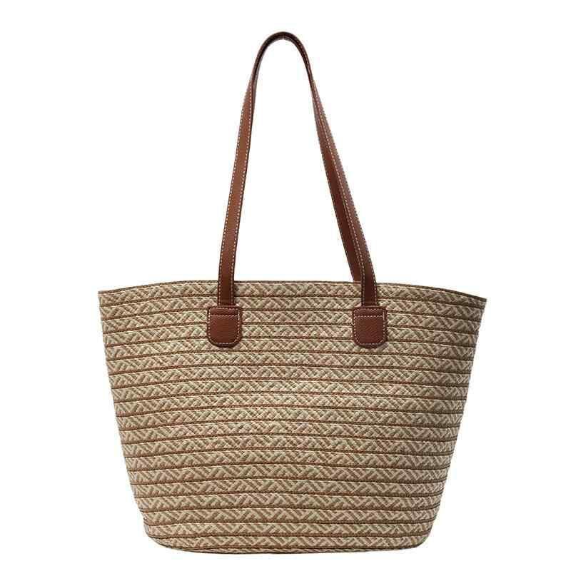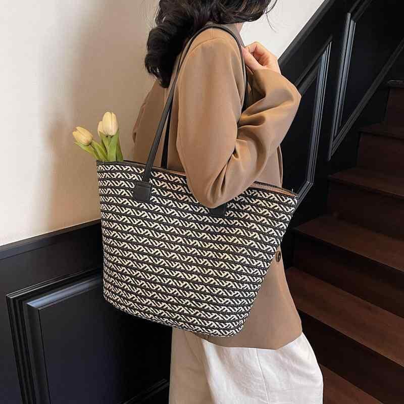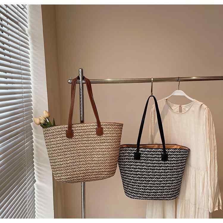 トートバッグ レディース カジュアル 大容量 通勤 鞄 デイリーユース ストロー ペーパーロープ 編み込み バイカラー ストライプ 帆布 横型 スクエア ファスナー開閉