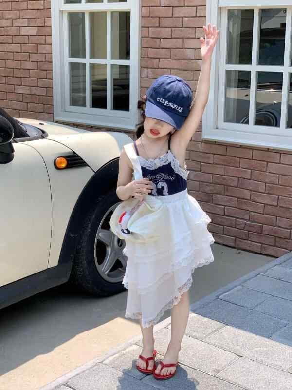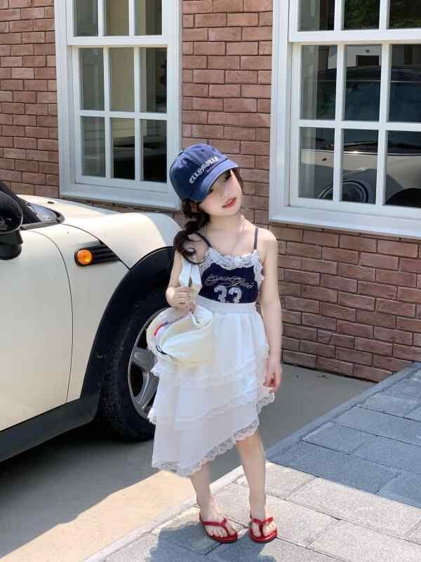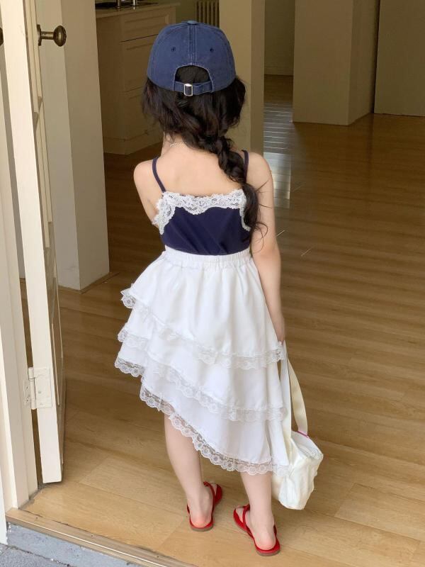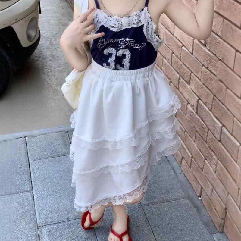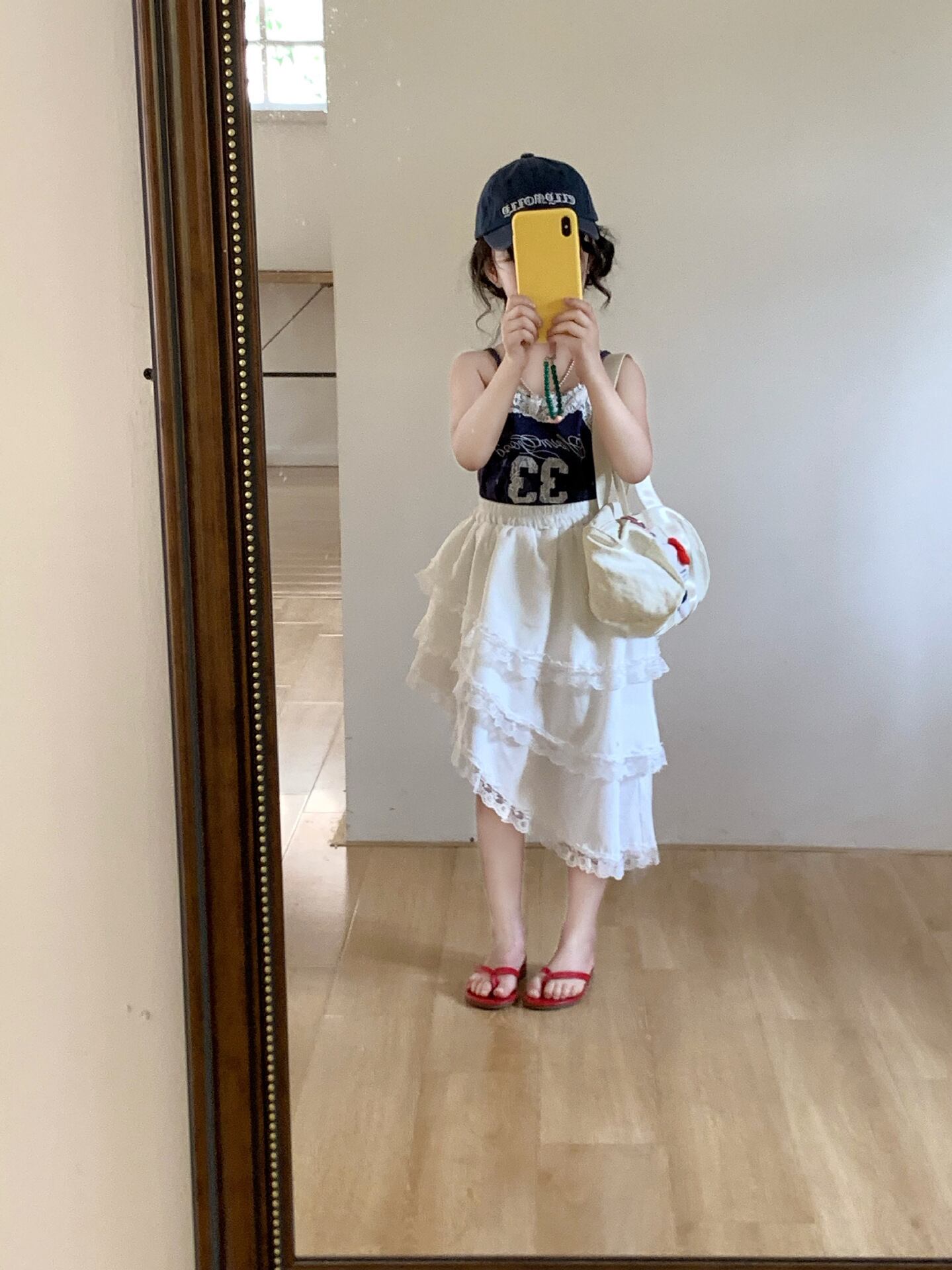 スカート キッズ 女児 デザイン性 アシンメトリー レースフリル ロングフレアスカート 切替 リゾート風 韓国風 ポリエステル 綿裏地 柔らかい 肌触り かわいい ホワイト 夏 普段使い