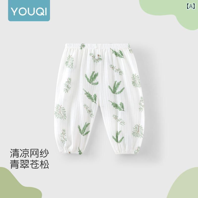 ベビーパンツ 男女兼用 幼児向け 防蚊 薄手 綿100% コットン素材 長ズボン バルーンパンツ 夏用 ルームウェア 普段使い 公園遊び リーフ柄 グリーン系 軽量 快適 通気性 涼しい