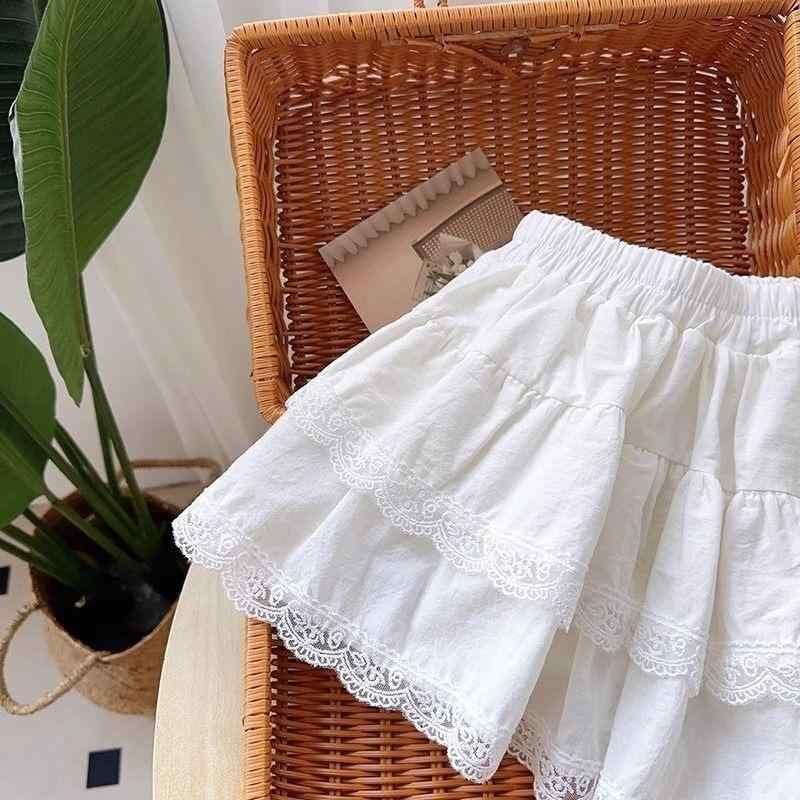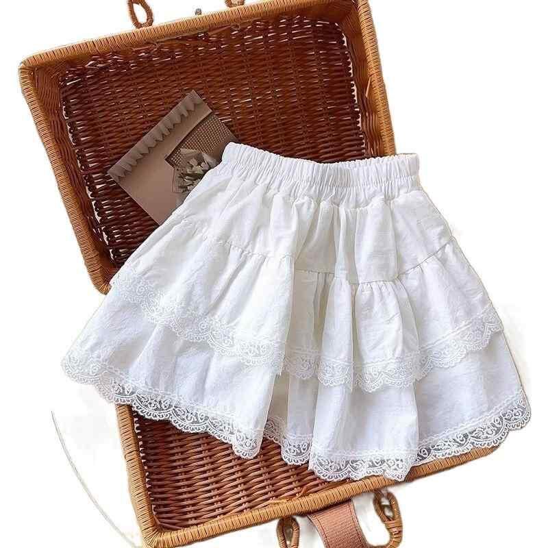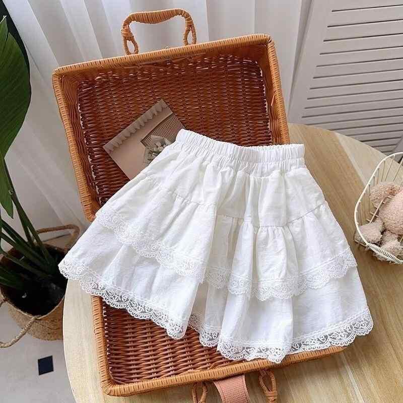 スカート 女の子 ミニ丈 インナーパンツ付き レース ティアード プリーツスカート おしゃれ かわいい 綿混素材 ホワイト オールシーズン