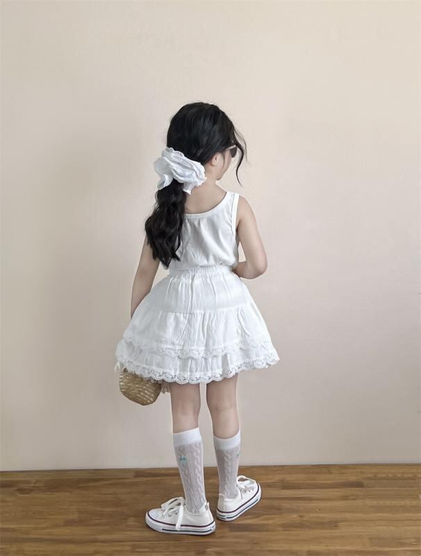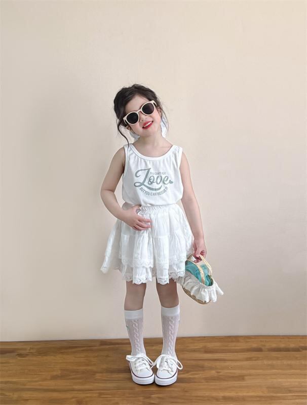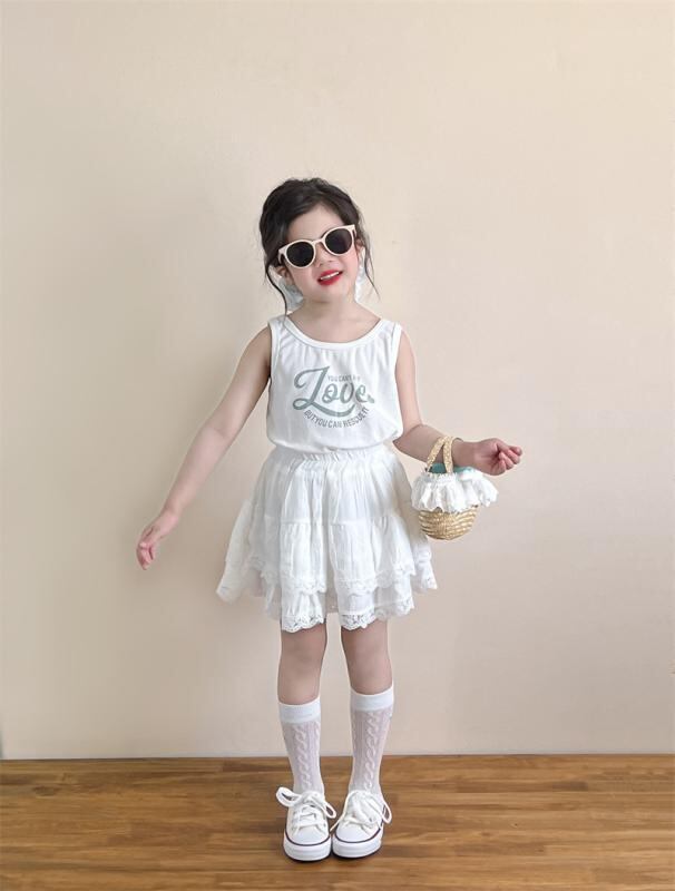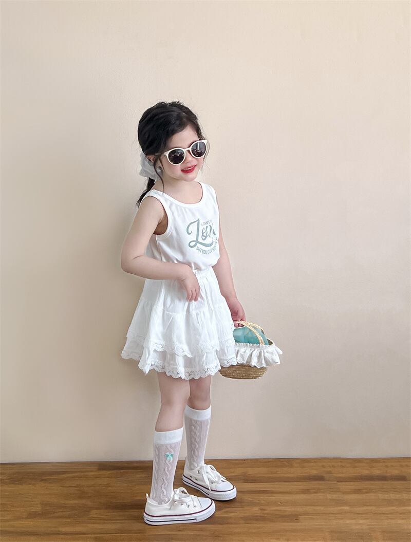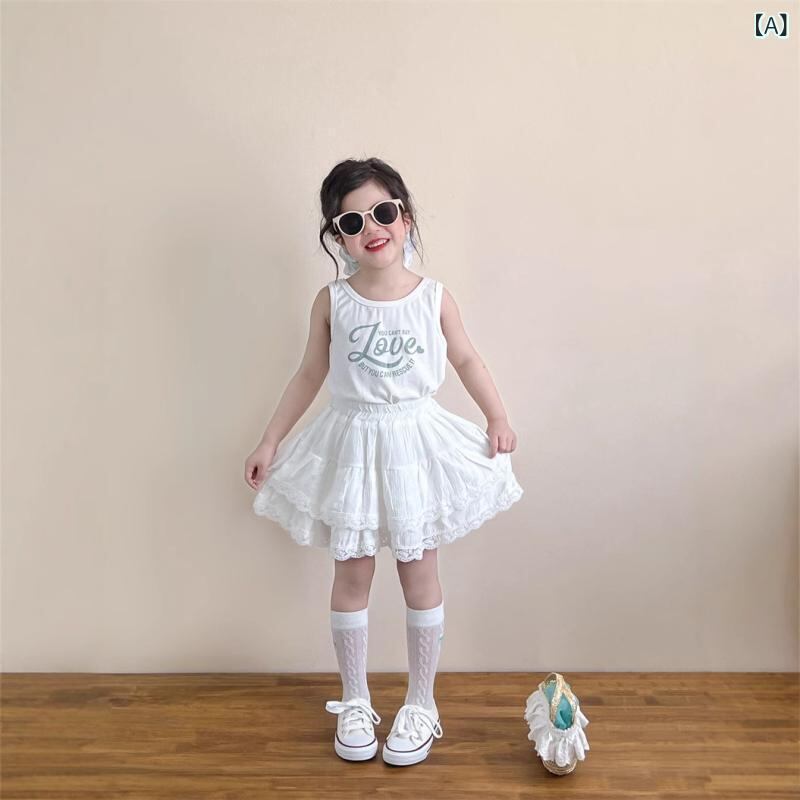 キッズ 女の子 セットアップ 韓国風 かわいい アルファベット ロゴ ノースリーブ タンクトップ レースフリル スカート 綿 コットン 柔らかい素材 Aライン 夏 普段使い