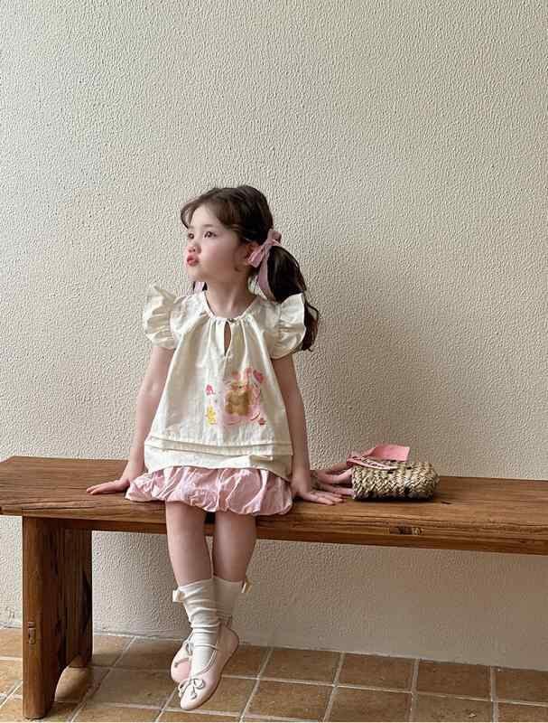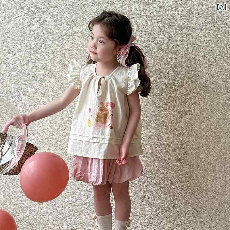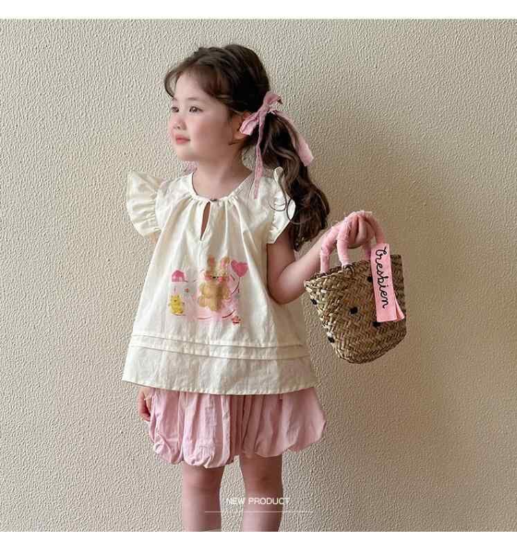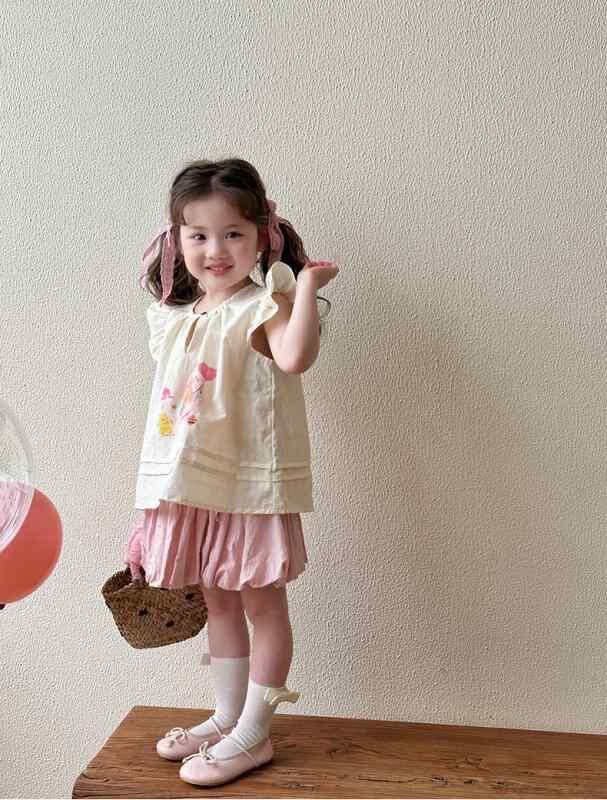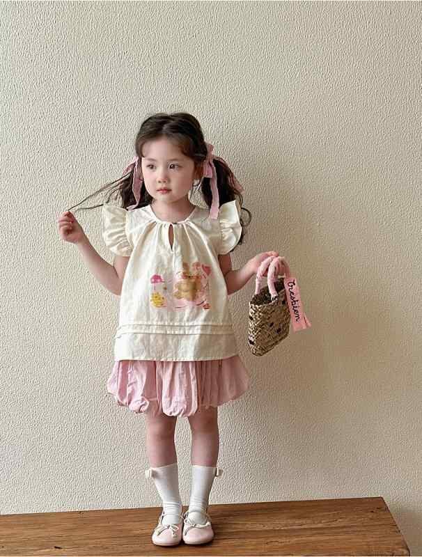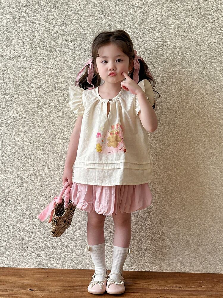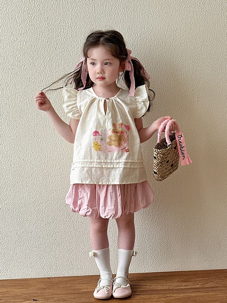 ブラウス キッズ 女の子 子供 ベビー 夏服 ノースリーブ シャツ 韓国風 ドールブラウス おしゃれ かわいい 綿 コットン 柔らかい クルーネック キャラクター プリント アイボリー
