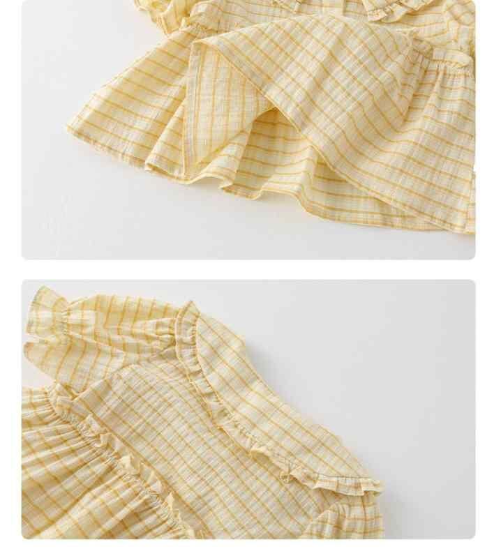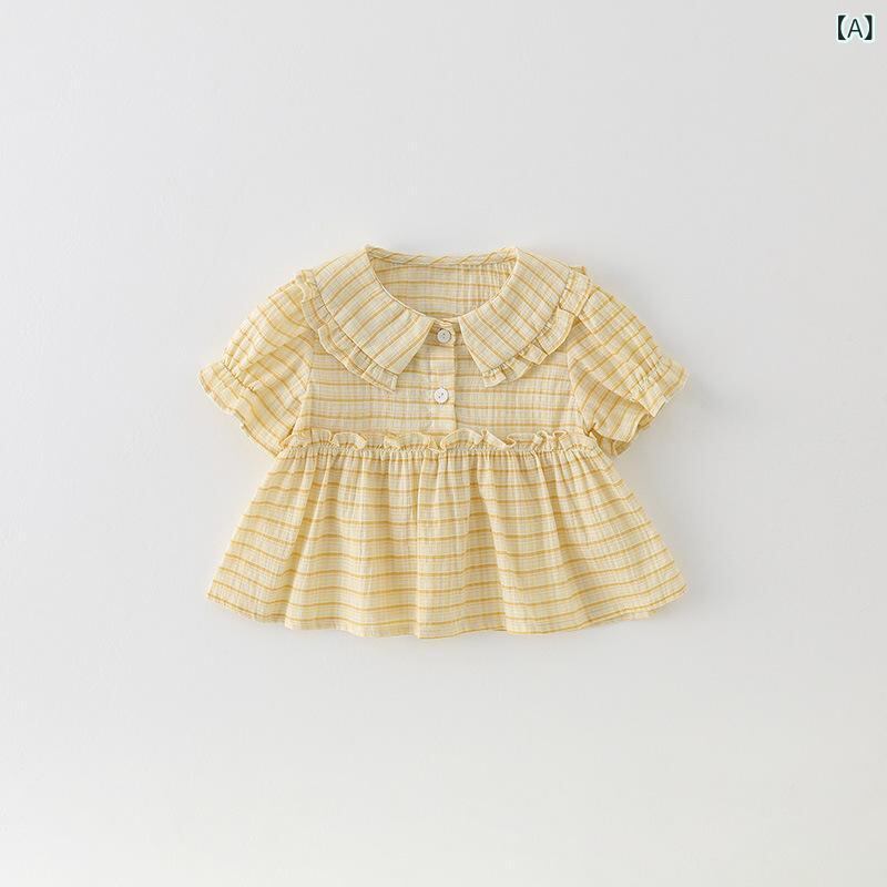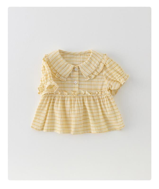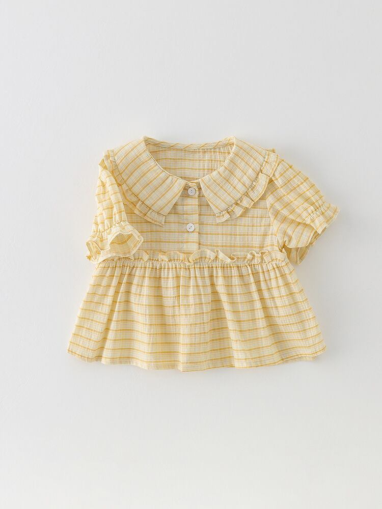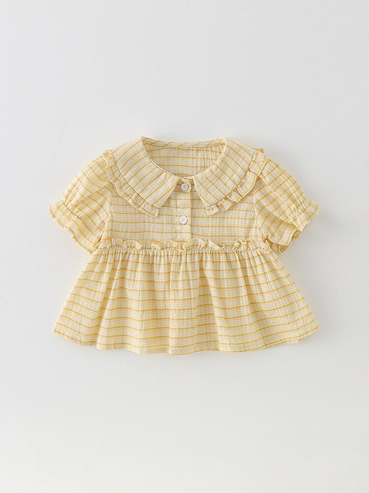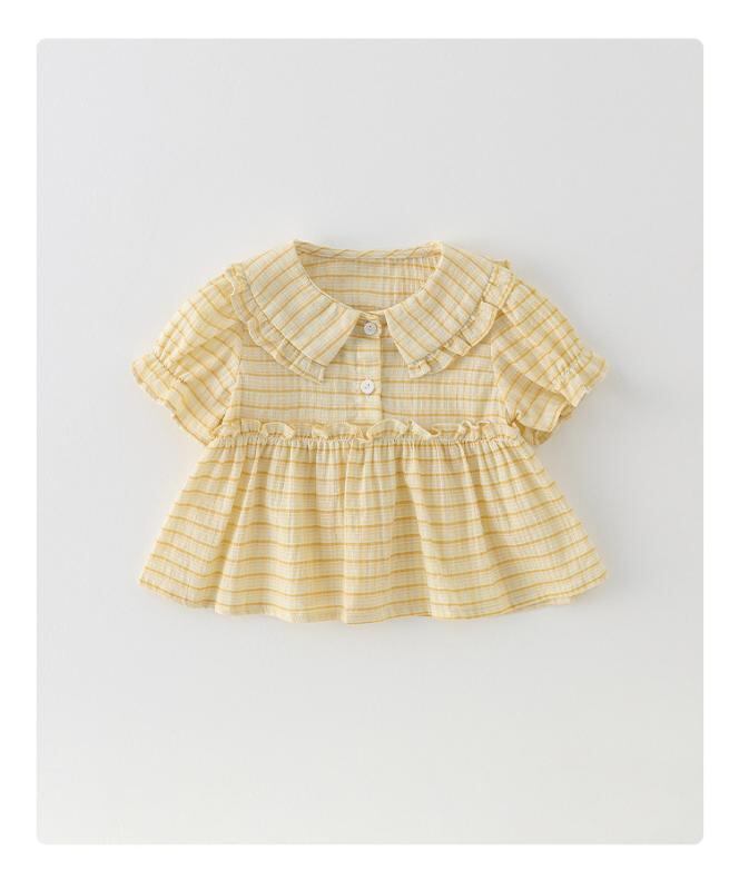 シャツ ベビー 女の子 キッズ ガールズ チェック柄 半袖 丸襟 フリルブラウス 夏用 綿 コットン100% 柔らかい肌触り ドールカラー 普段使い 通園 カジュアル イエロー 黄色