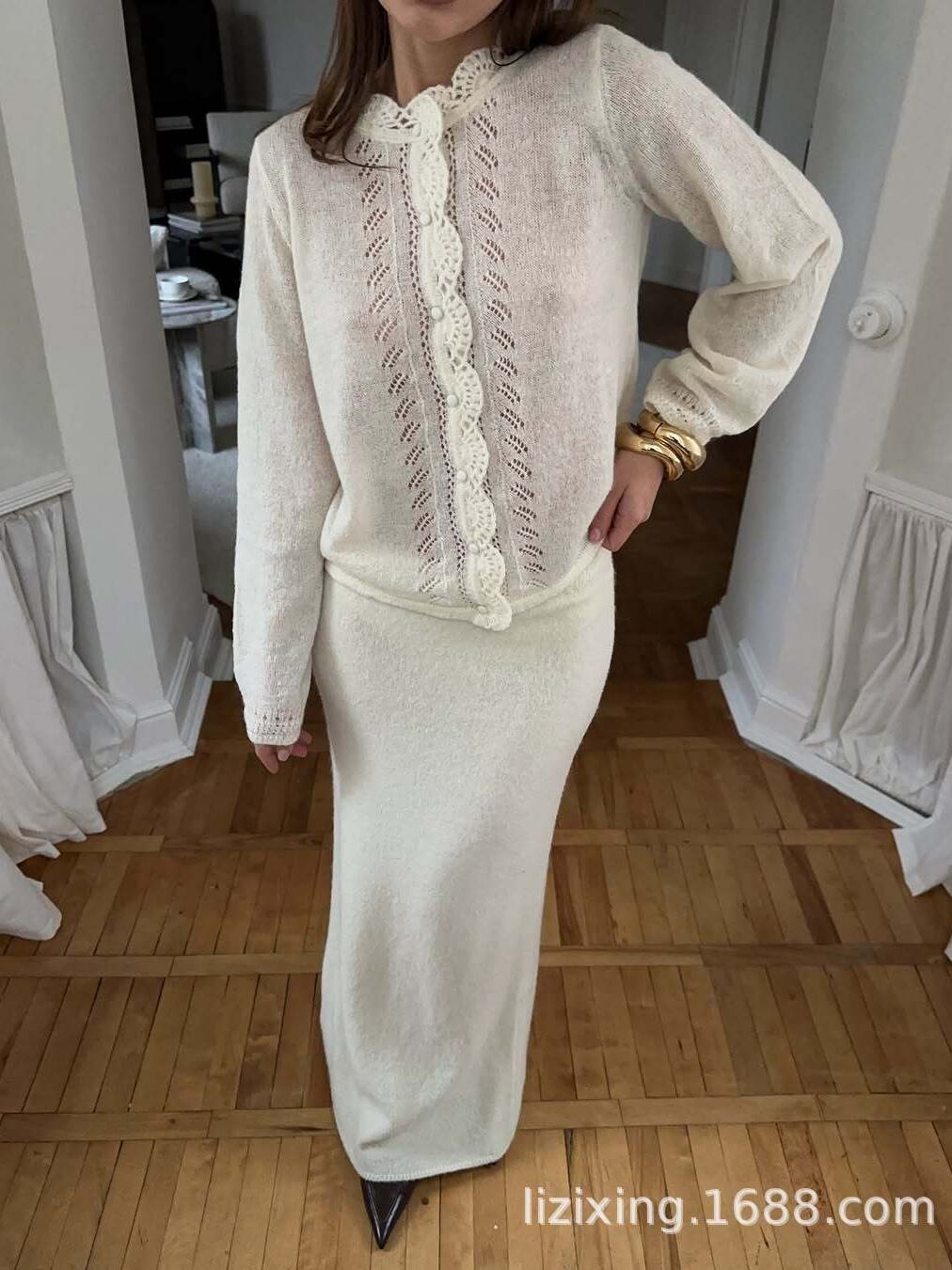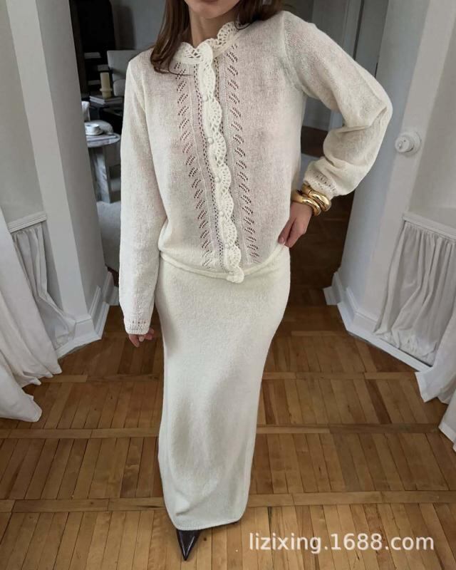カーディガン レディース 欧米風 ラウンドネック 無地 ニットアウター レース 透かし編み 春物 綿アクリル混紡 スリムフィット 羽織り 標準丈 オフホワイト トップス