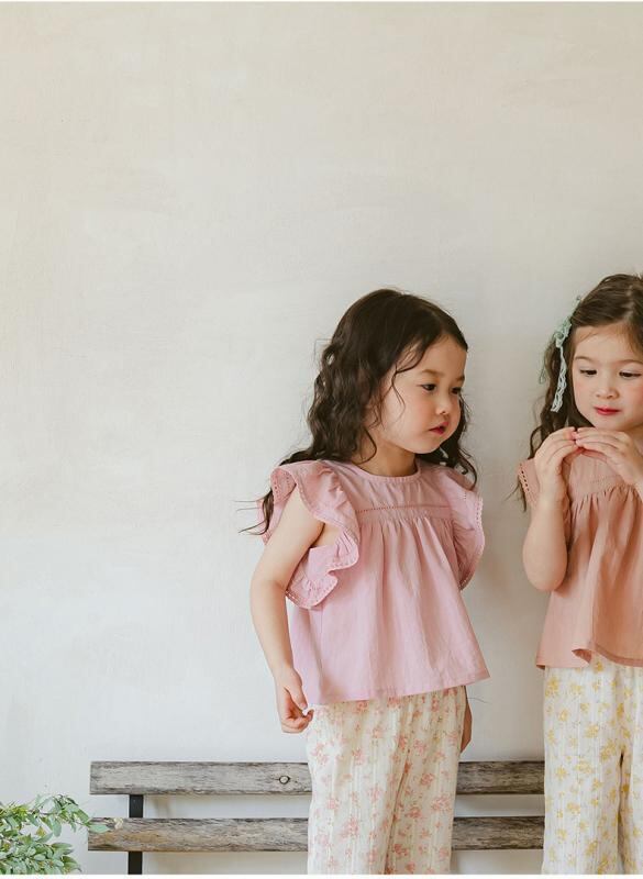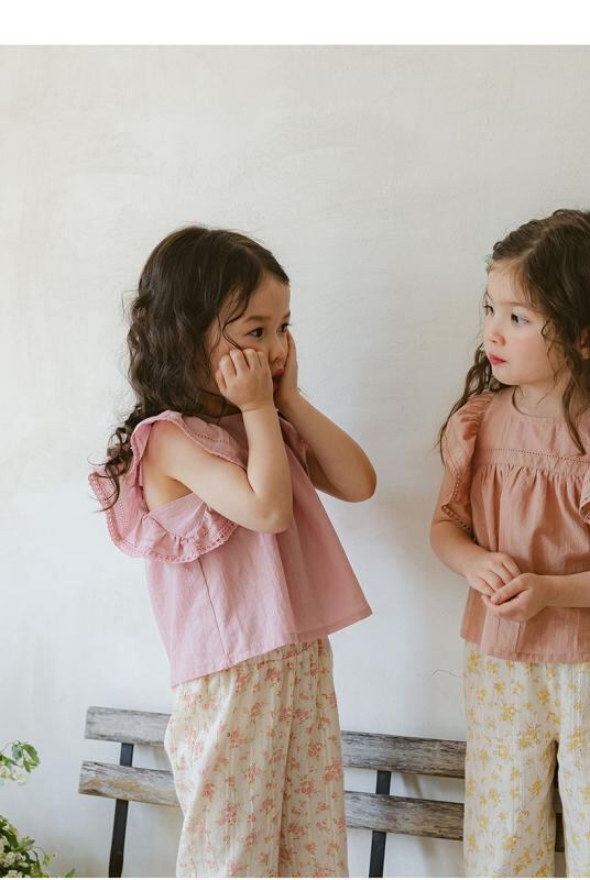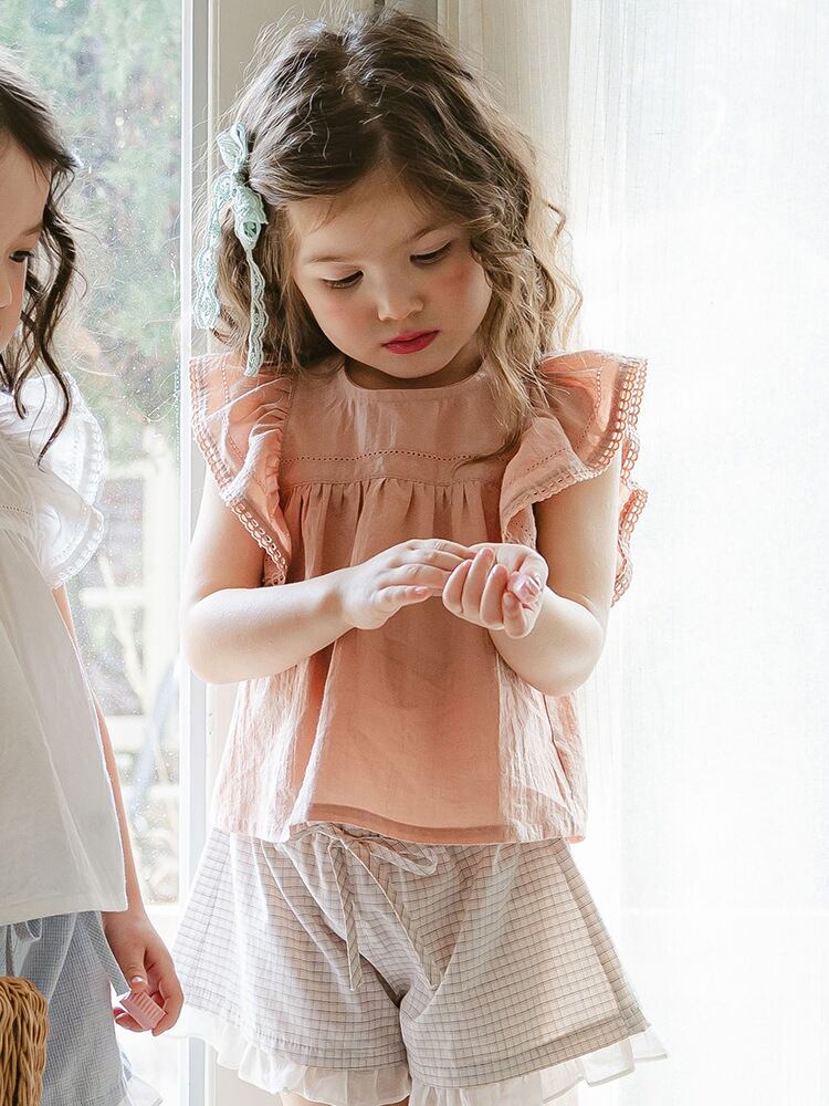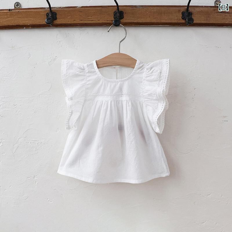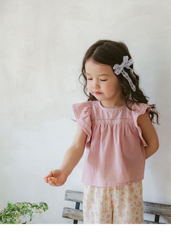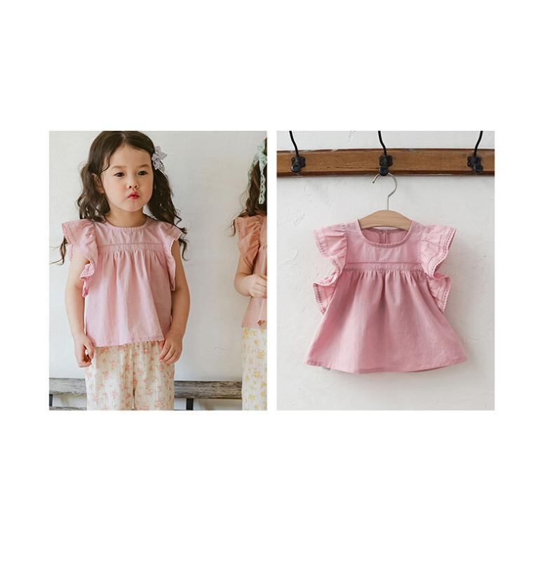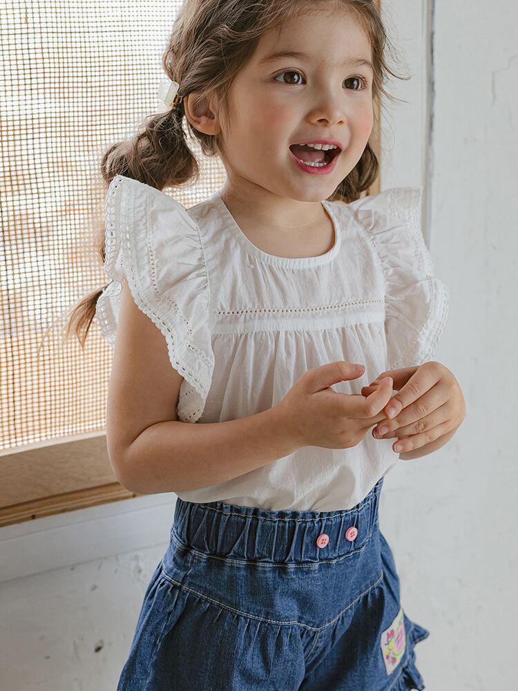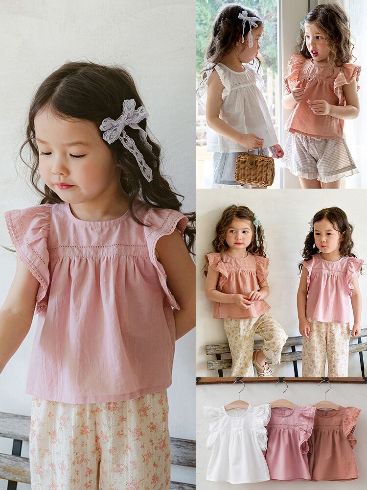 ブラウス キッズ 女の子 薄手 コットン 綿 涼しい 涼感 かわいい スイート フリル袖 半袖 ドールシャツ チュニック Aライン ラウンドネック 丸首 無地 レース プリンセス トレンド カジュアル 夏 普段使い お出かけ ピンク アイボリー