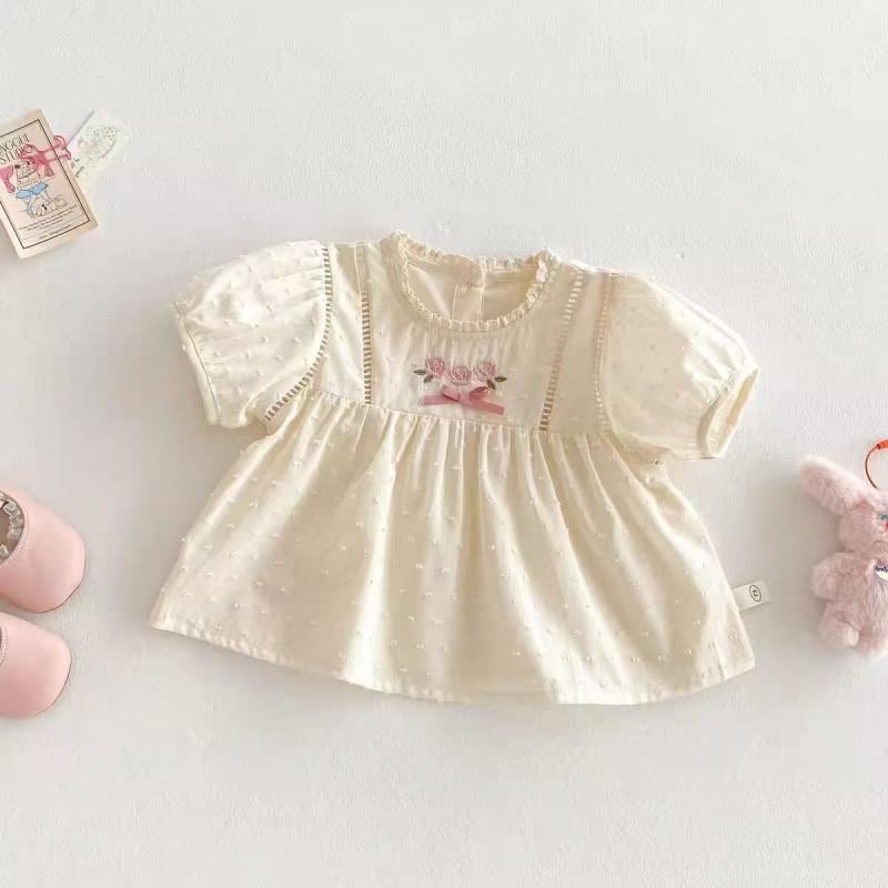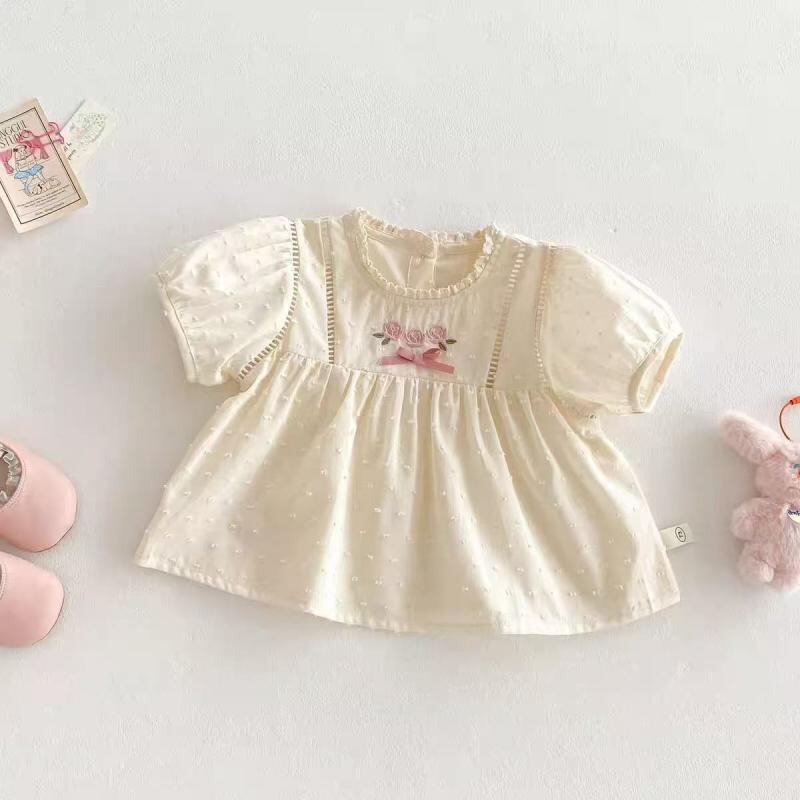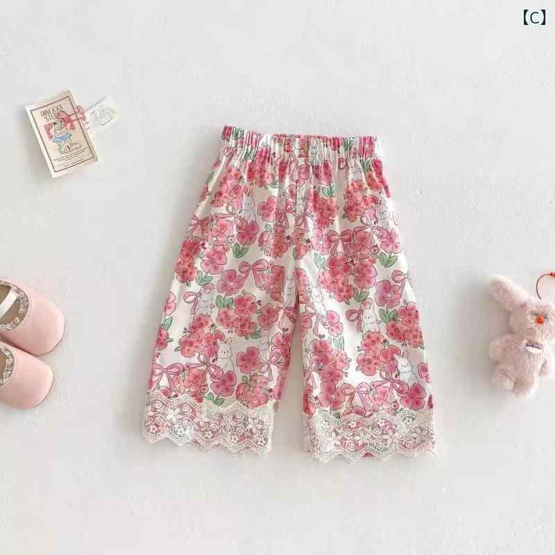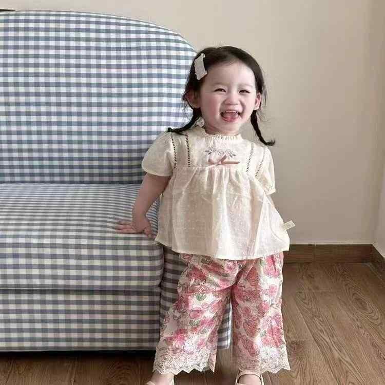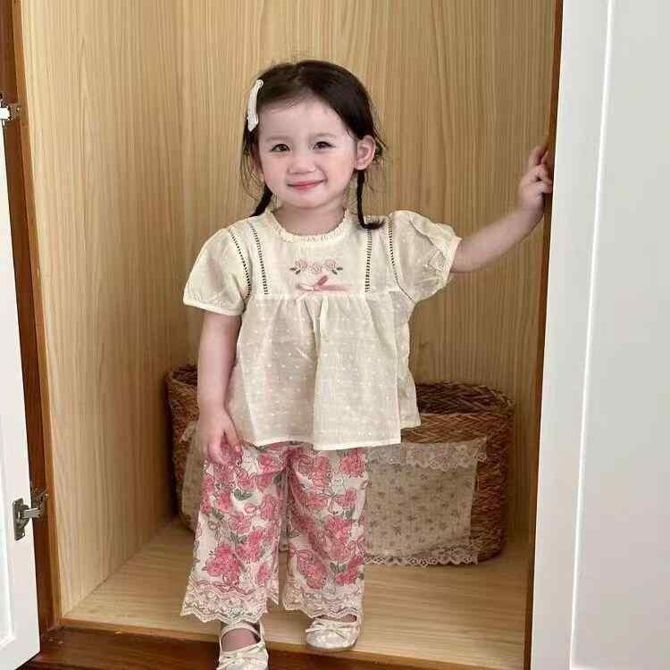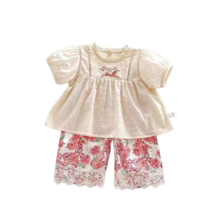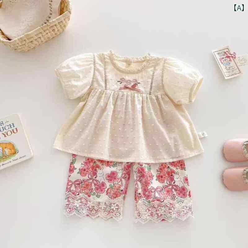ベビー 女の子 ガールズ セットアップ 上下セット 2点セット 夏 韓国風 綿 コットン 半袖 ドールブラウス チュニック プルオーバー 小花柄 ストレートパンツ ロングパンツ 薄手 柔らかい 普段使い お出かけ 通園