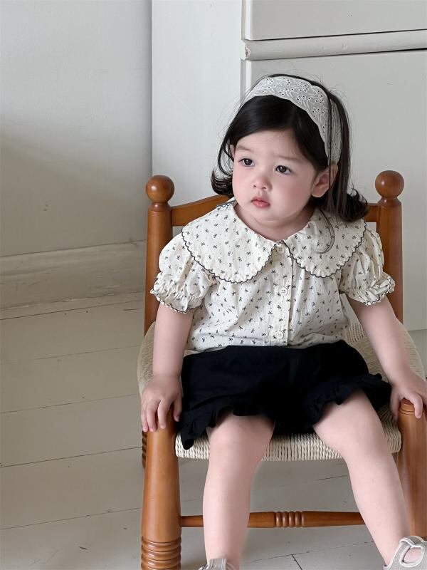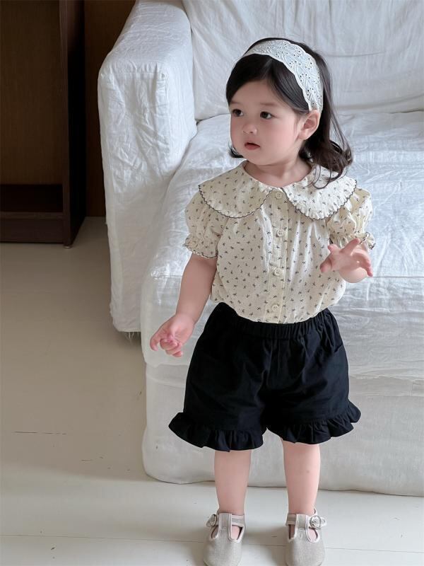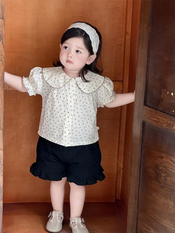 ベビー キッズ 女の子 韓国風 半袖 ドールブラウス ショートパンツ 上下セット 薄手 夏用 綿素材 かわいい フリル 小花柄 柔らか素材 肌触り良い 夏服 お出かけ カジュアル 2点セット