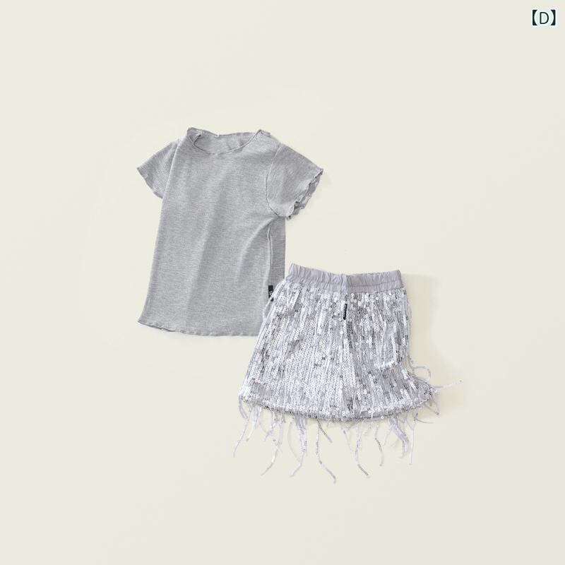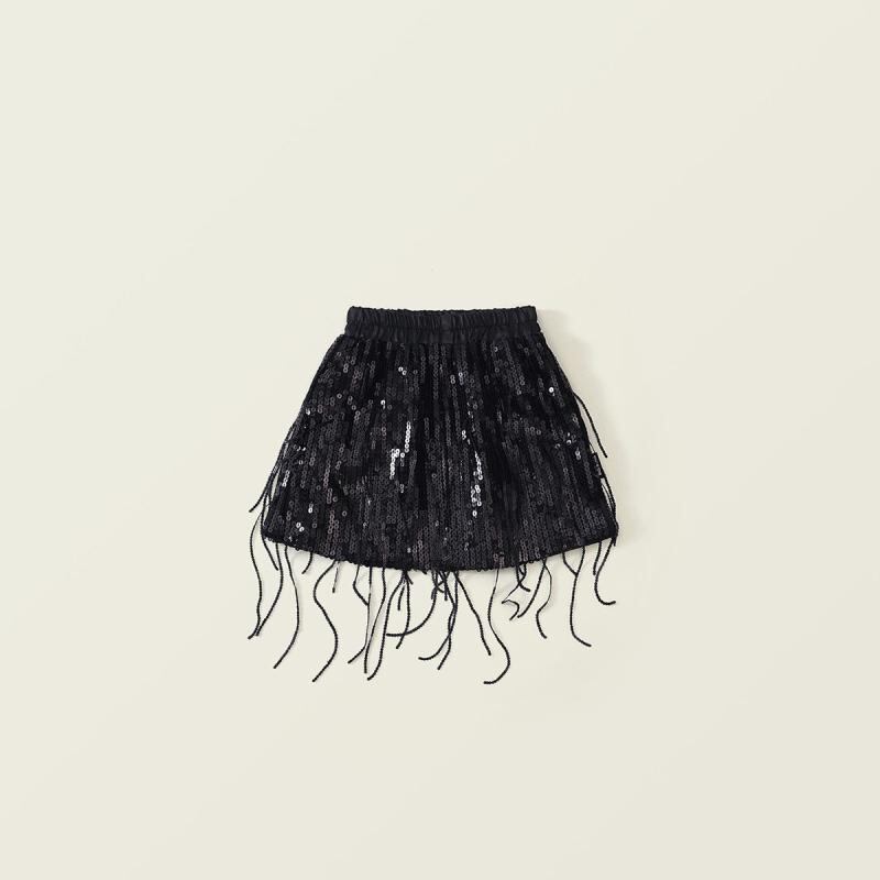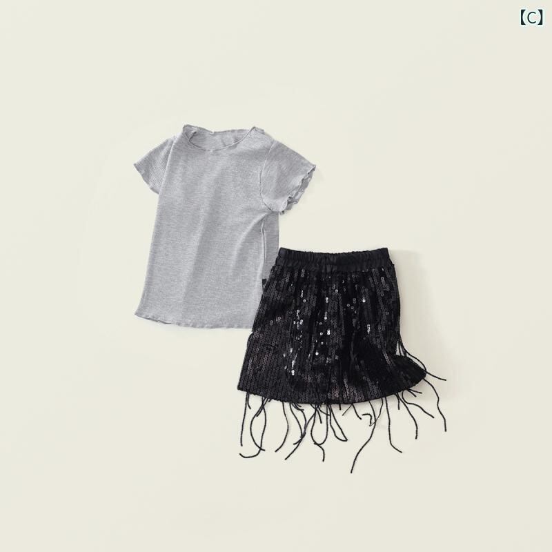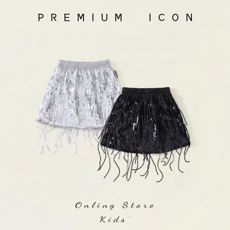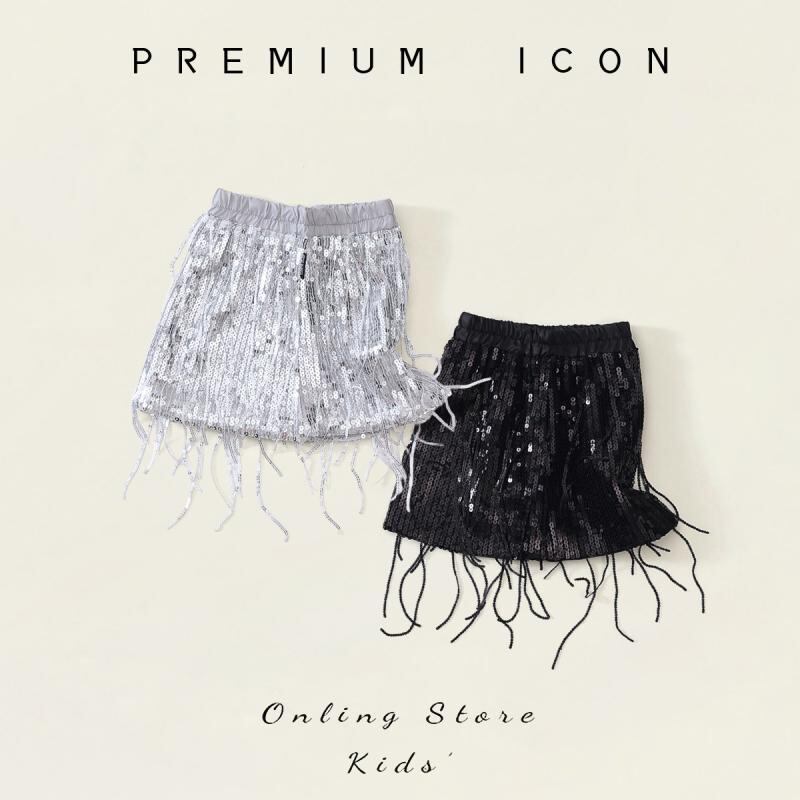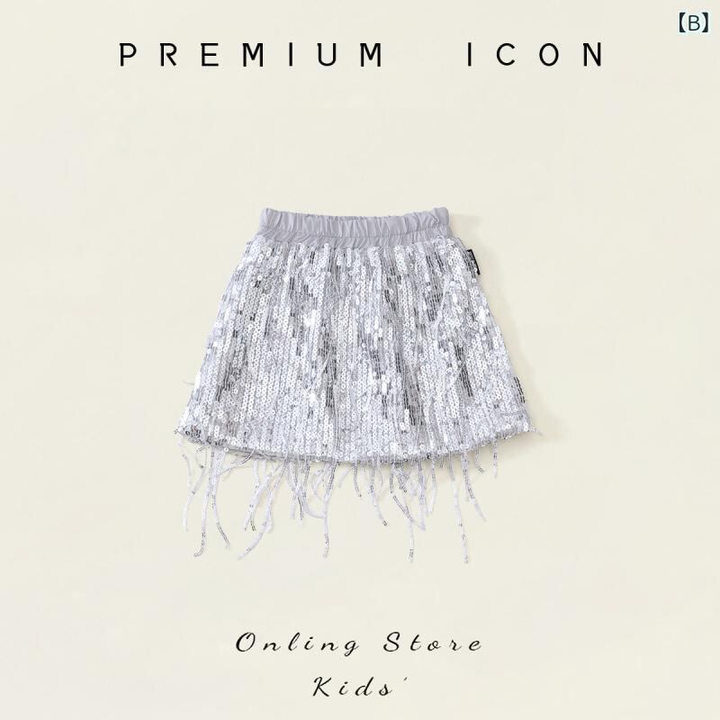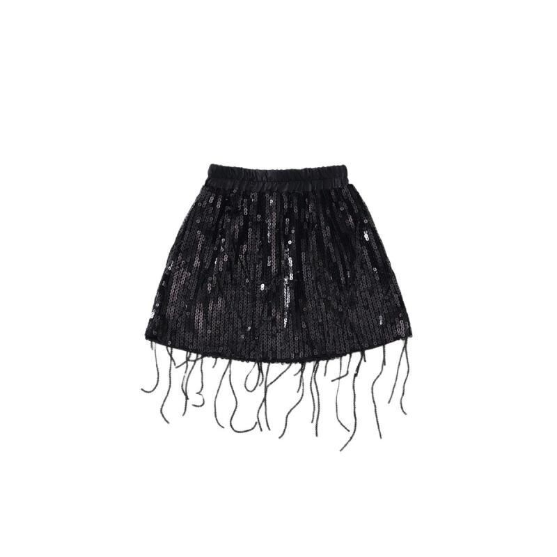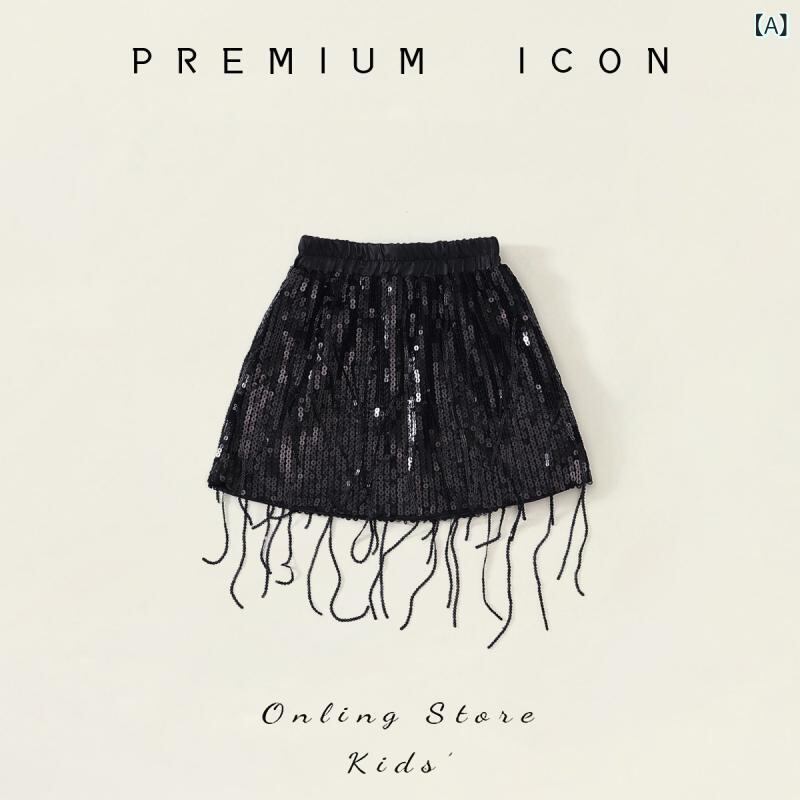 Aラインスカート 女の子 キッズ 韓国風 フリンジ スパンコール 高級感 シフォン ポリエステル 柔らかな肌触り ブラック シルバー 夏物 カジュアル