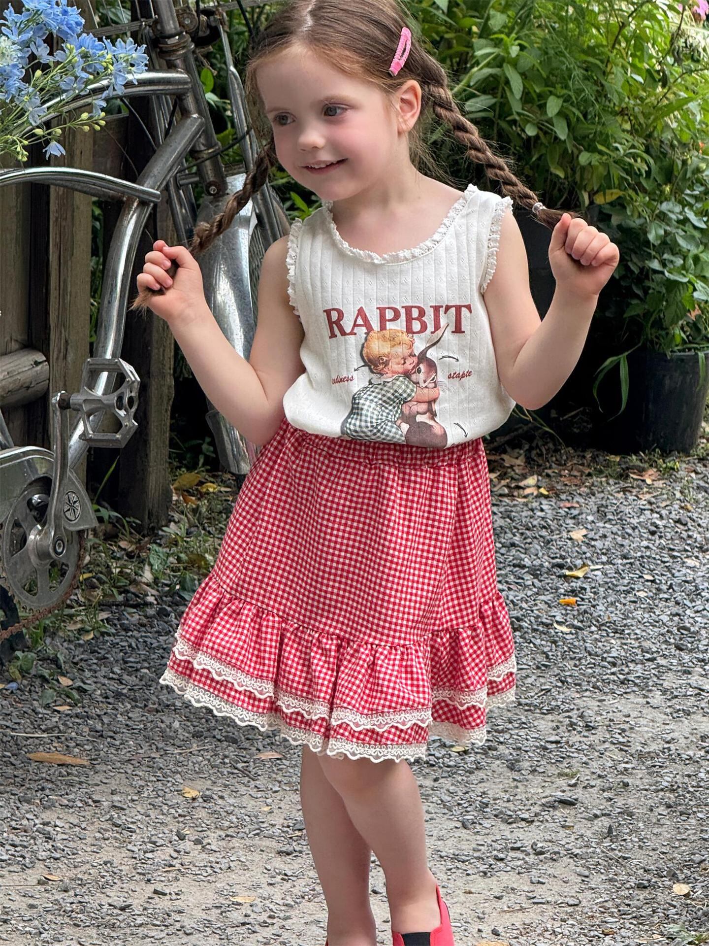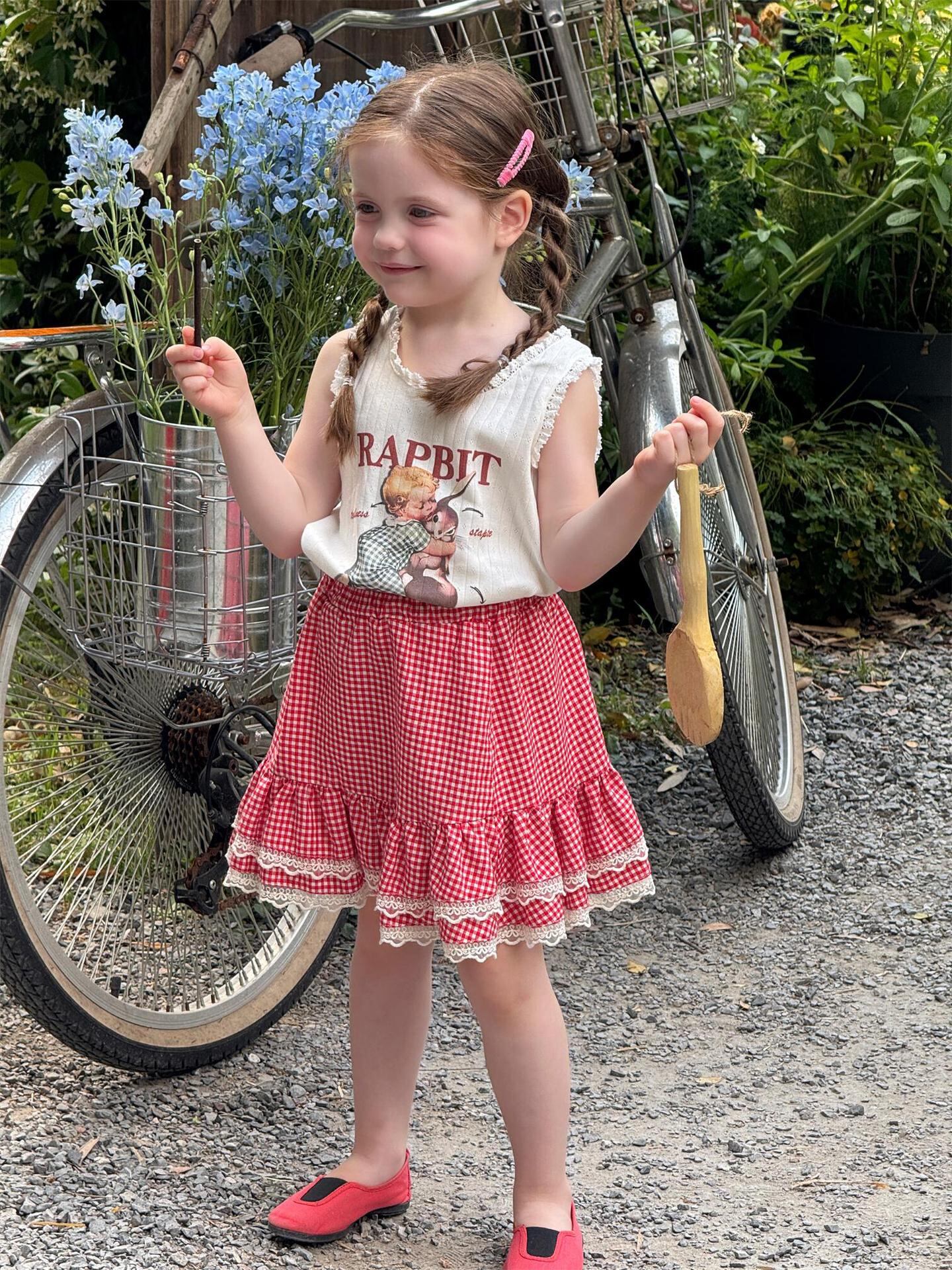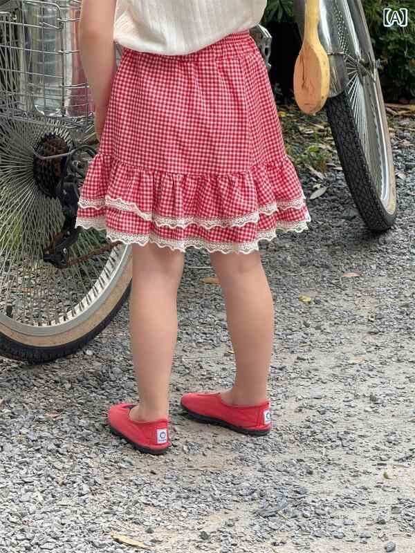 スカート キッズ 女の子 韓国風 赤色 チェック柄 フリル 半身スカート 綿 かわいい 着回し カジュアル 夏物 フレア ティアード ソフトな肌触り