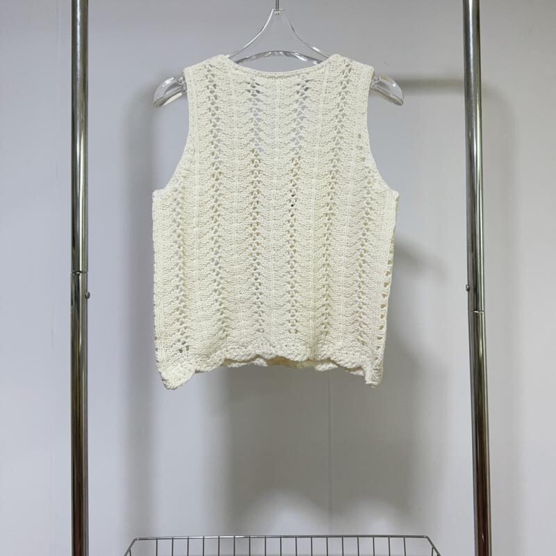 レディース ニットトップス フレンチロマンチック デイジー クロシェ編み 透かし編み ショート丈 ノースリーブ 若見え 着回し 通勤スタイル オフホワイト アイボリー