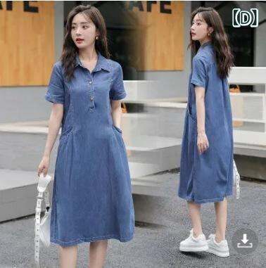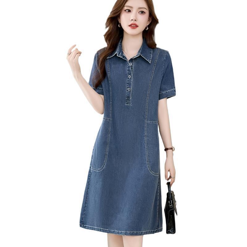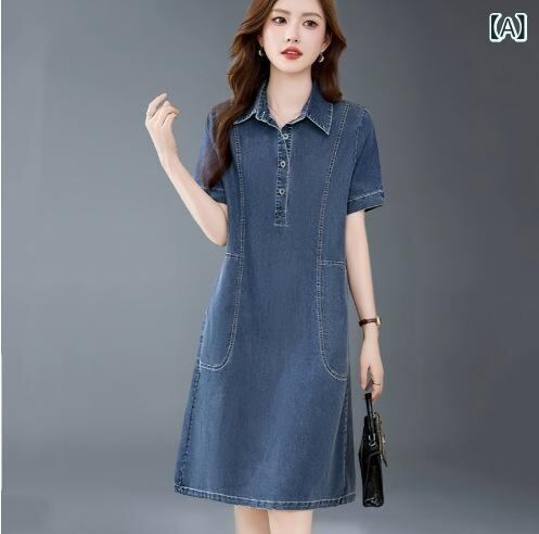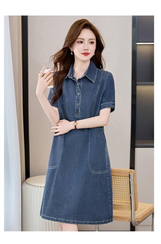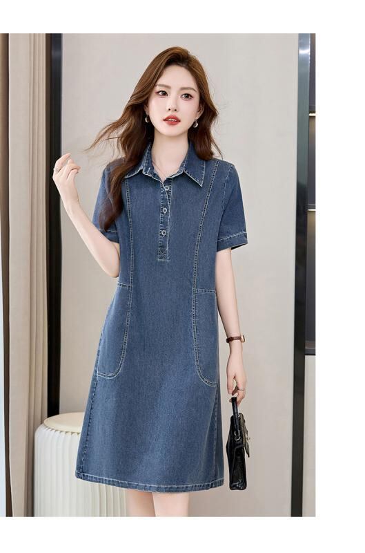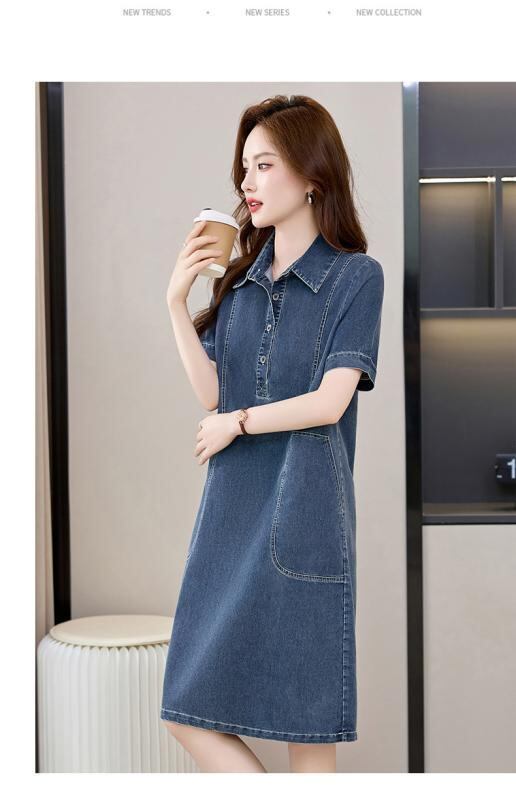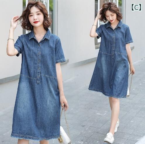 ワンピース レディース デニム シャツワンピース 薄手 半袖 ゆったり ビッグシルエット 体型カバー 大きいサイズ カジュアル コットン ポロ襟 ミモレ丈 デイリーユース