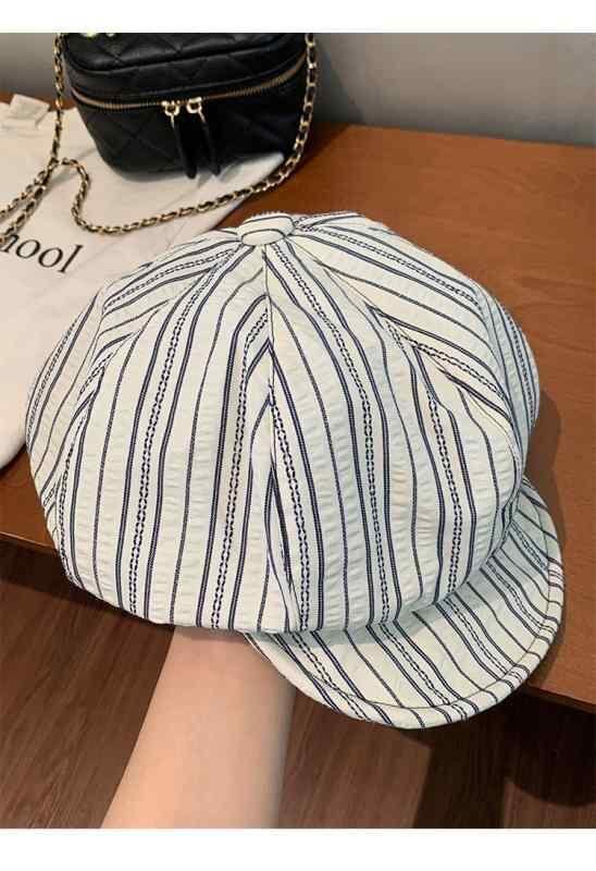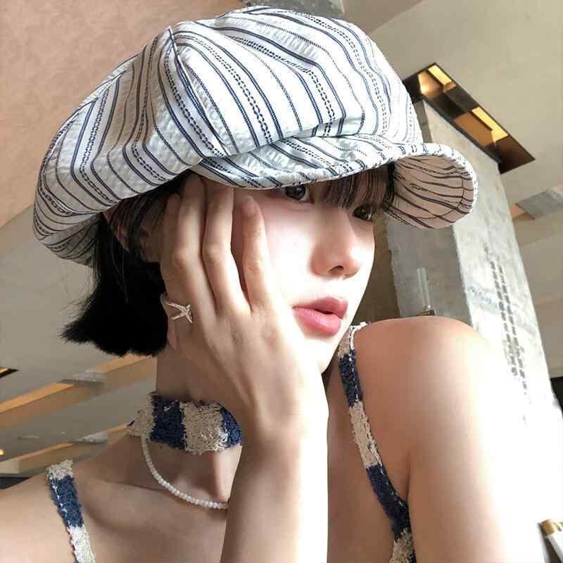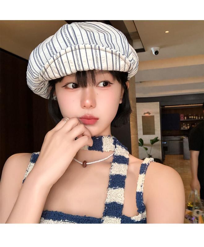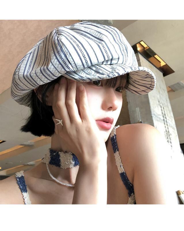 ベレー帽 レディース レトロ ヴィンテージ ストライプ柄 プリーツ加工 アシンメトリー 変形デザイン 小顔効果 夏用 UV対策 日よけ 大きめサイズ 通気性 アクリル素材 画家風 個性的デザイン