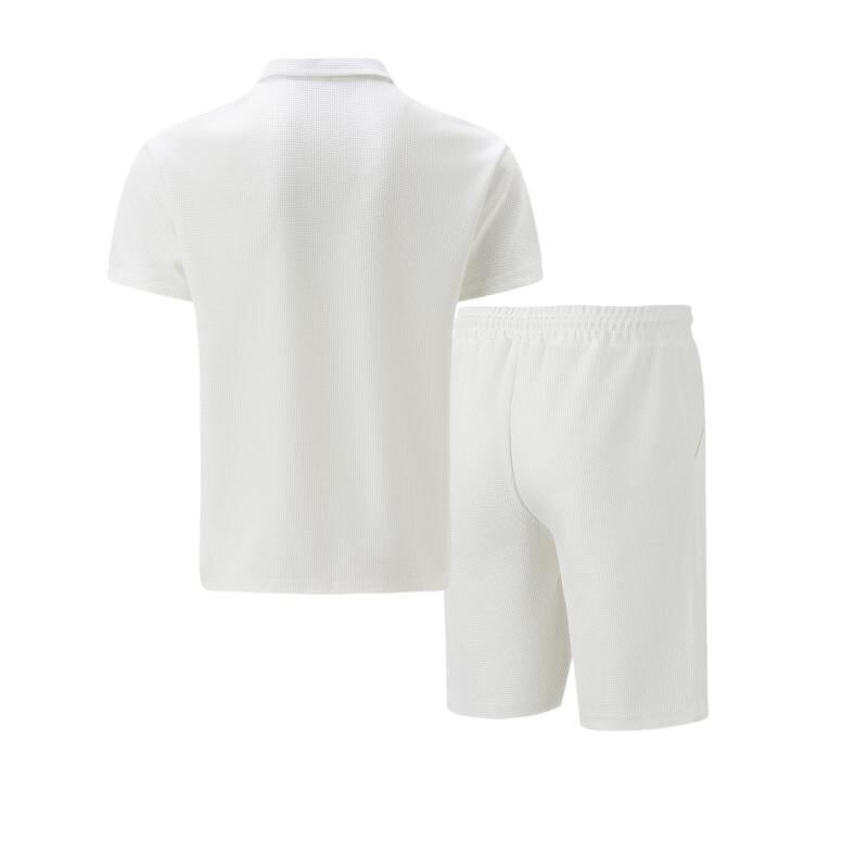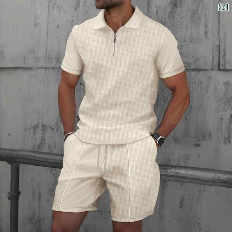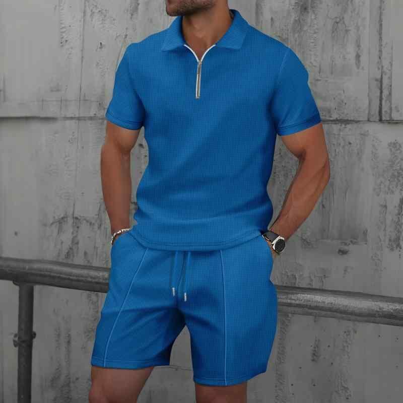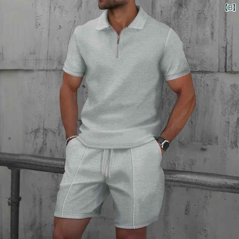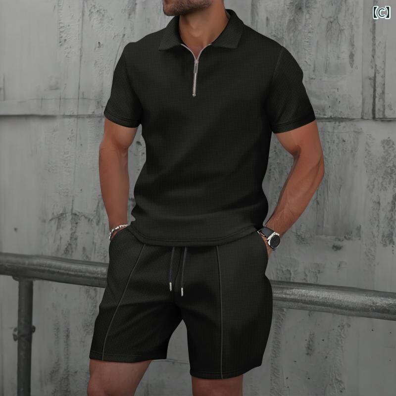 セットアップ メンズ 夏用 ワッフル生地 ジップアップ 無地 襟付き 半袖 Tシャツ ショートパンツ スポーツ カジュアル リラックス 部屋着 ワンマイルウェア 吸湿速乾 ポリエステル混紡