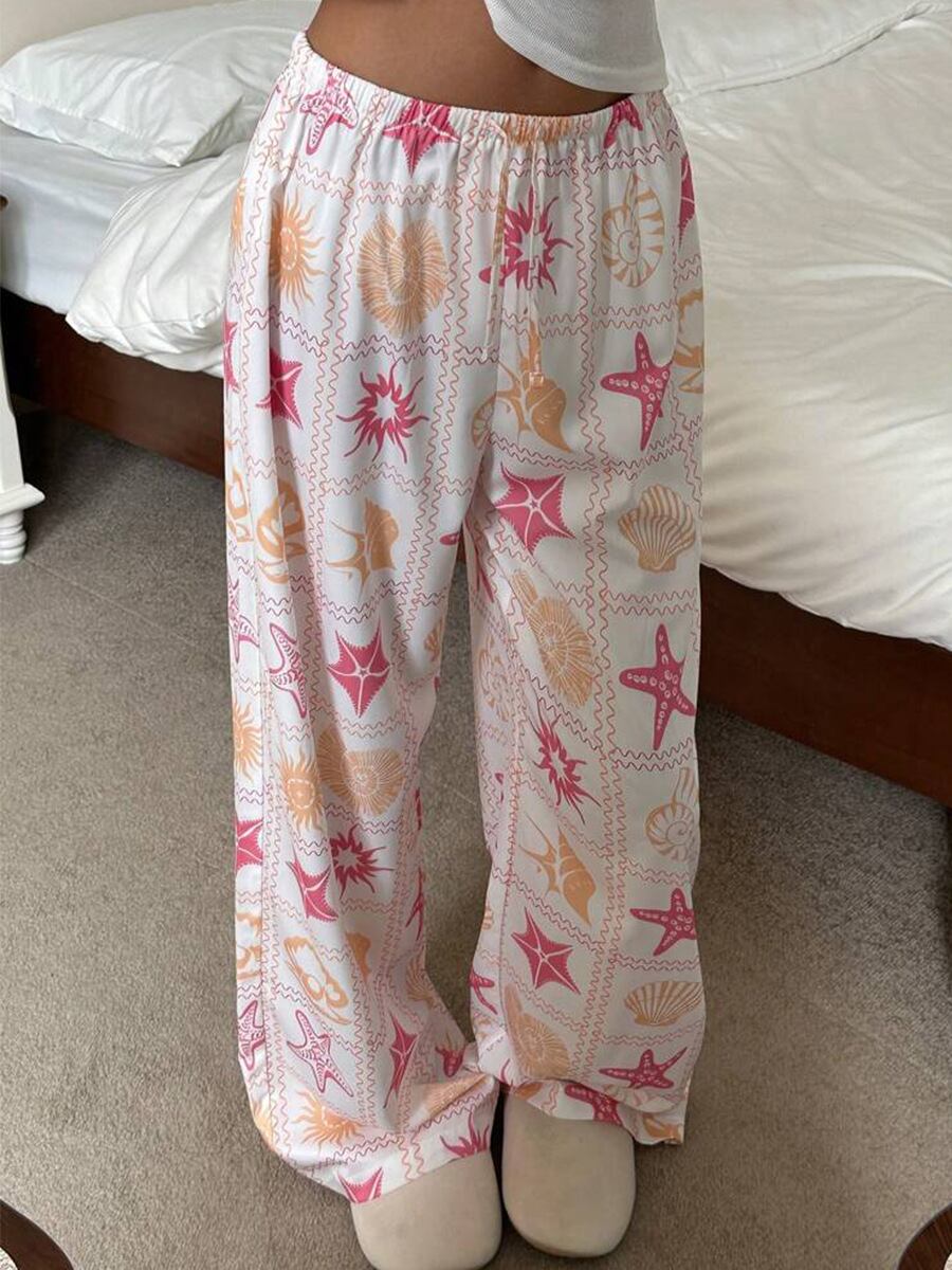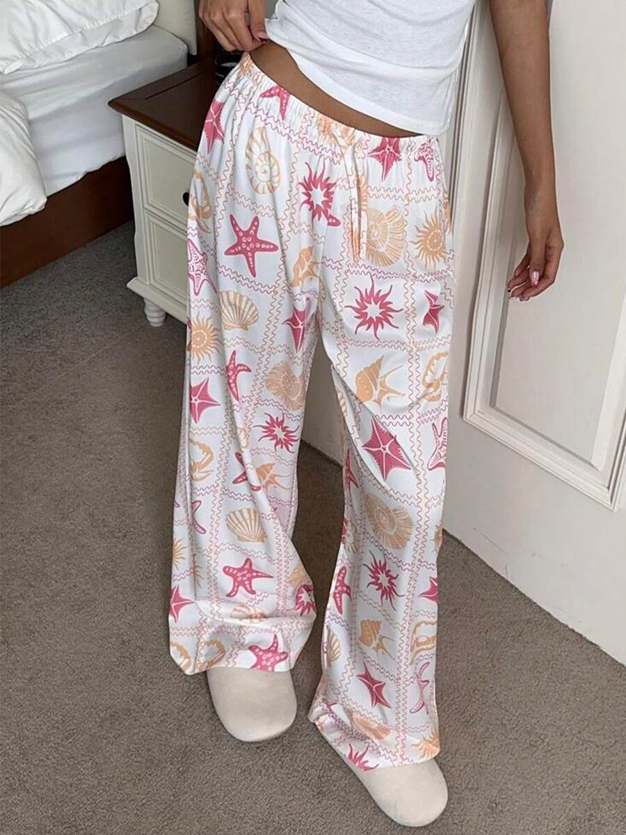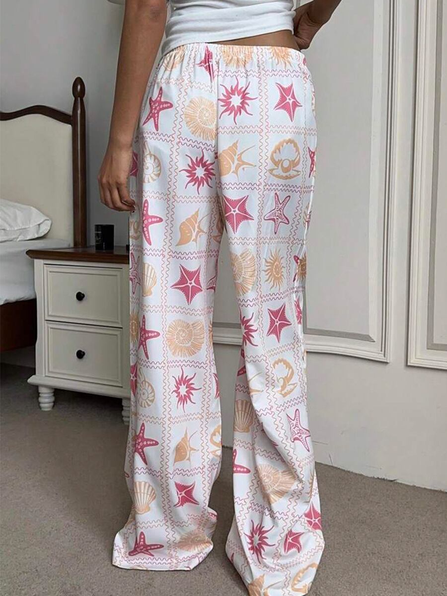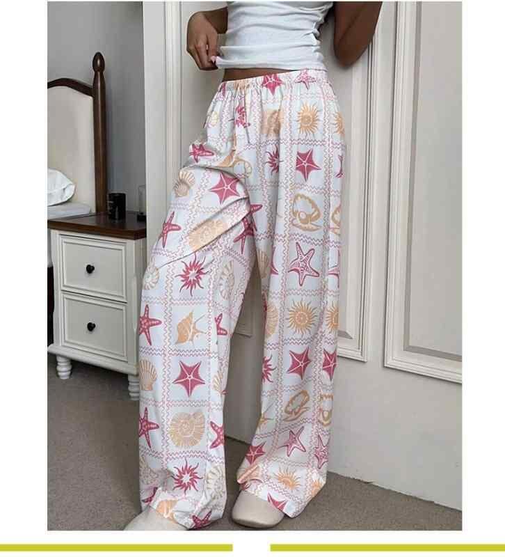 カジュアルパンツ レディース ワイドストレートパンツ フロア丈 ウエストゴム プリント柄 ポリエステル ノンストレッチ きれいめ カジュアル 通勤 デイリーユース リゾート 旅行 着回し万能