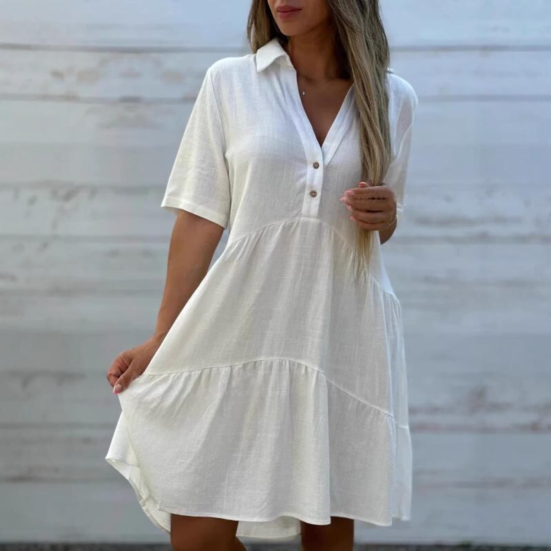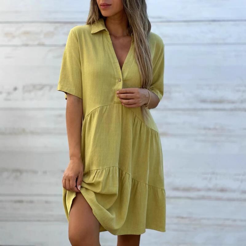 ワンピース レディース カジュアル 普段使い ゆったり 無地 Aライン ミディ丈 ポリエステル 伸縮性 半袖 襟付き ボタン付き