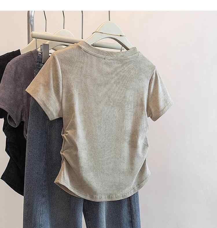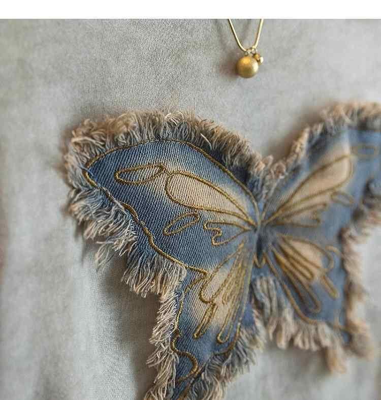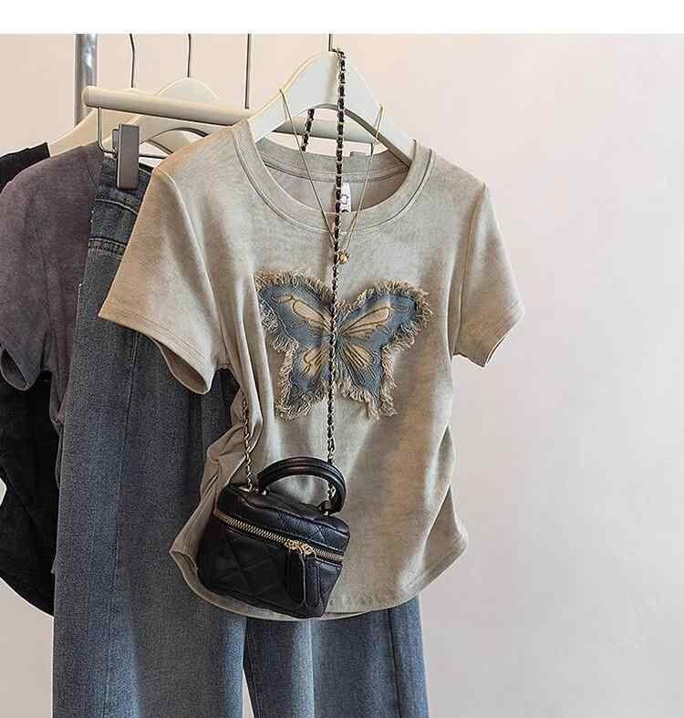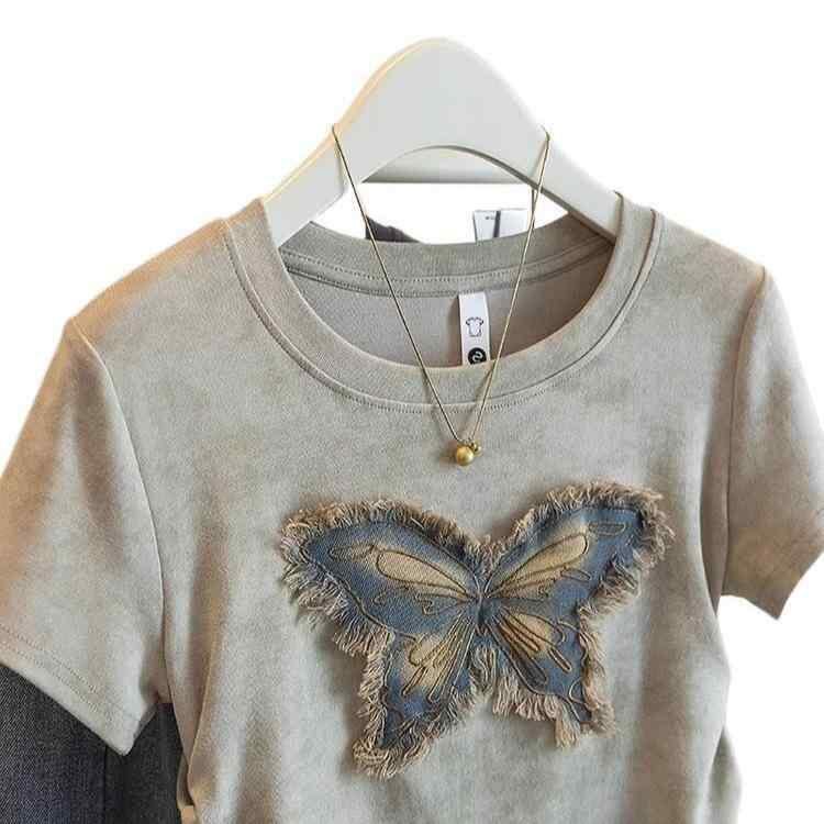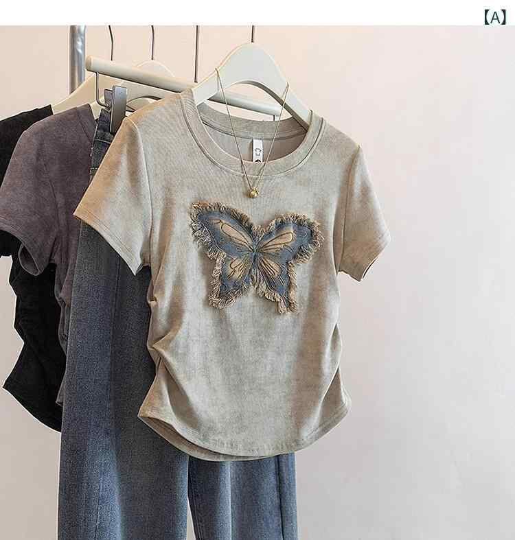 Tシャツ レディース 夏 トレンド 体型カバー 着痩せ効果 若見え 小柄 低身長 大きいサイズ ウエストシェイプ ゆったり 半袖 韓国風 シック 蝶々刺繡 丸首 フリルスリーブ 大人カジュアル