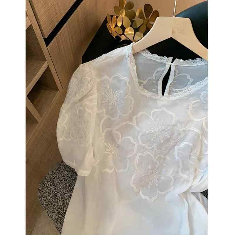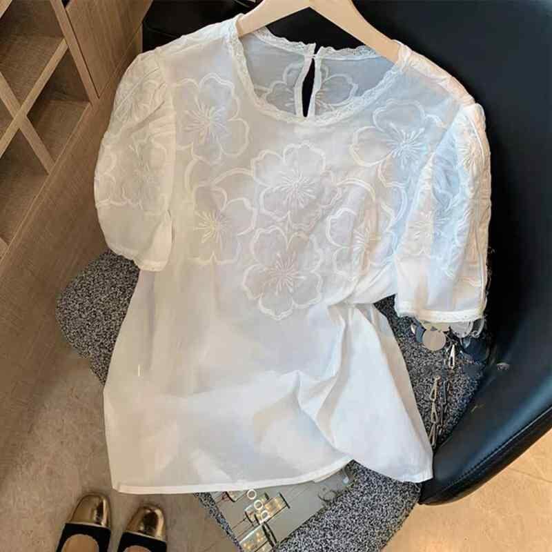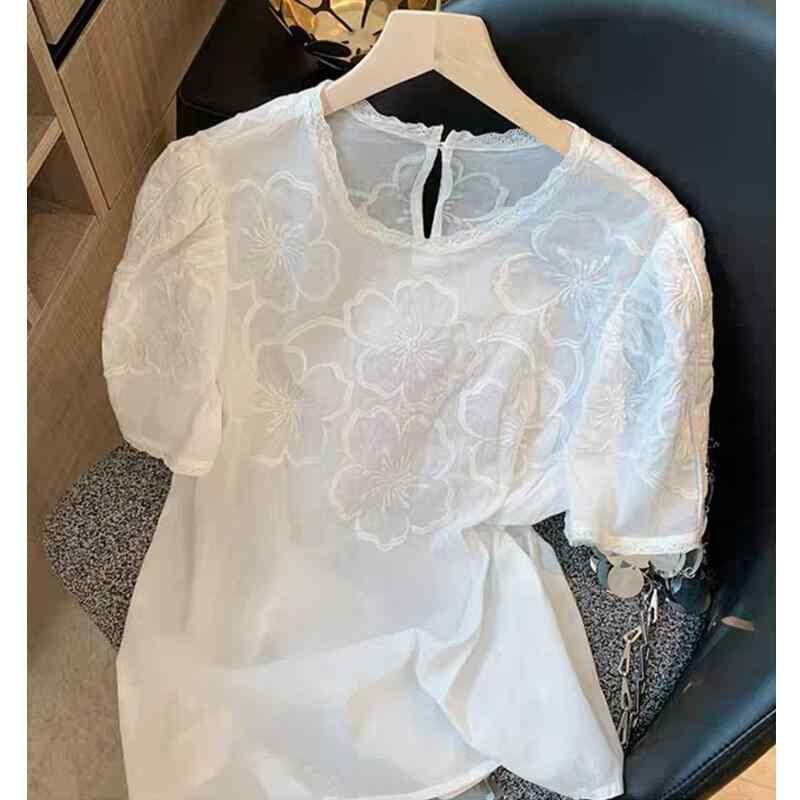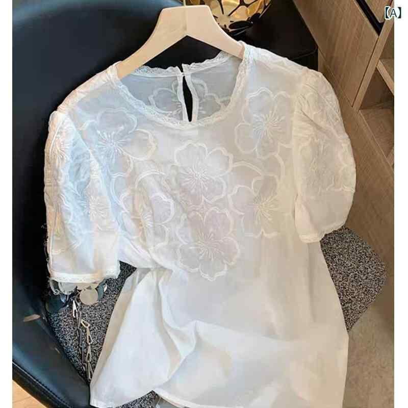 Tシャツ レディース 凝った 花柄 刺繍 半袖 フレンチテイスト 細見え 上品 着回し ブラウス ラウンドネック ポリエステル シンプル 快適 カジュアル