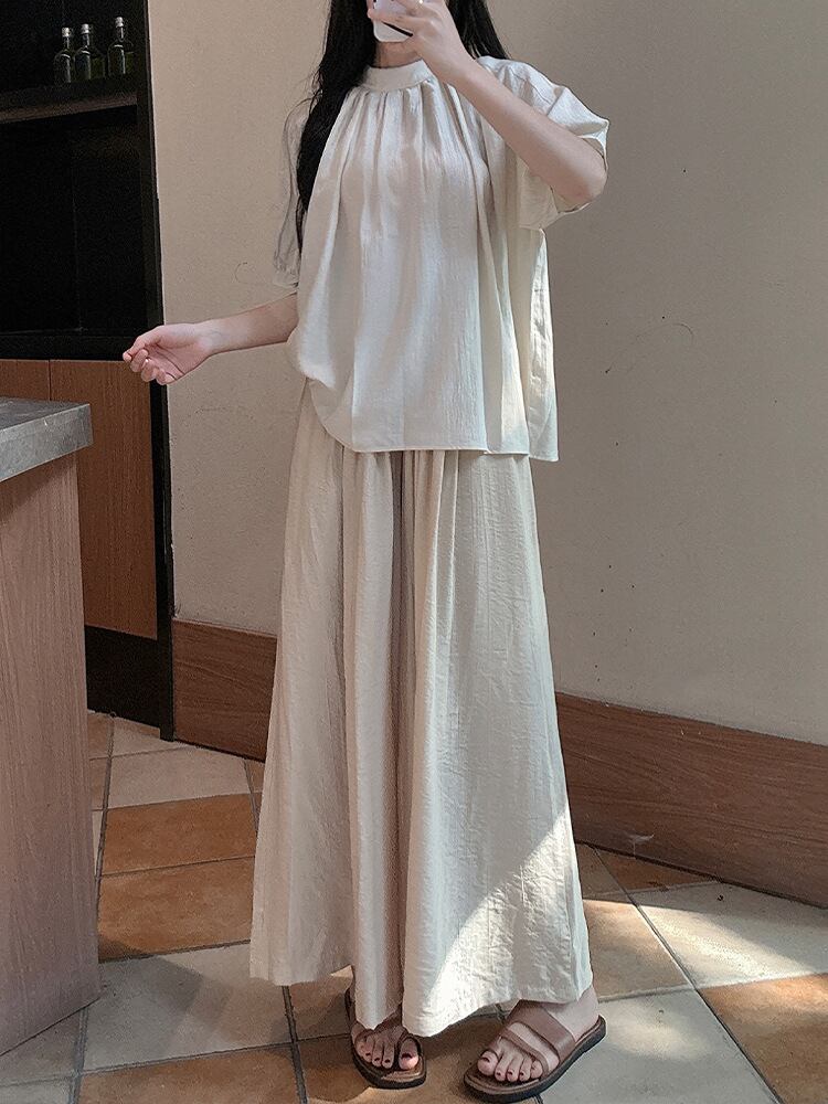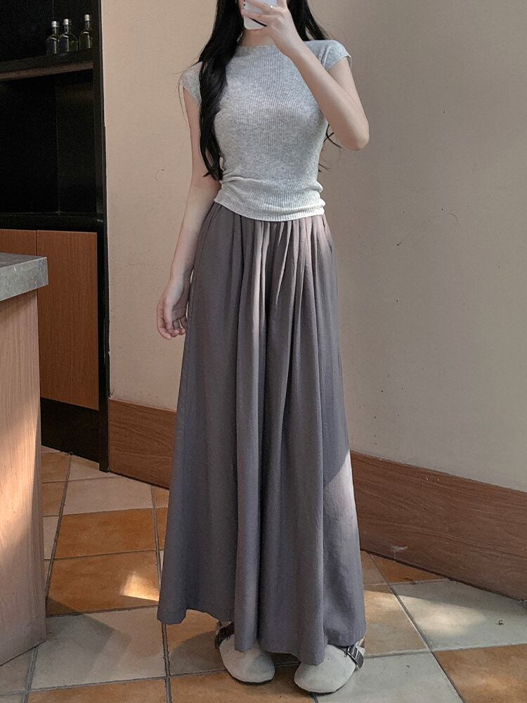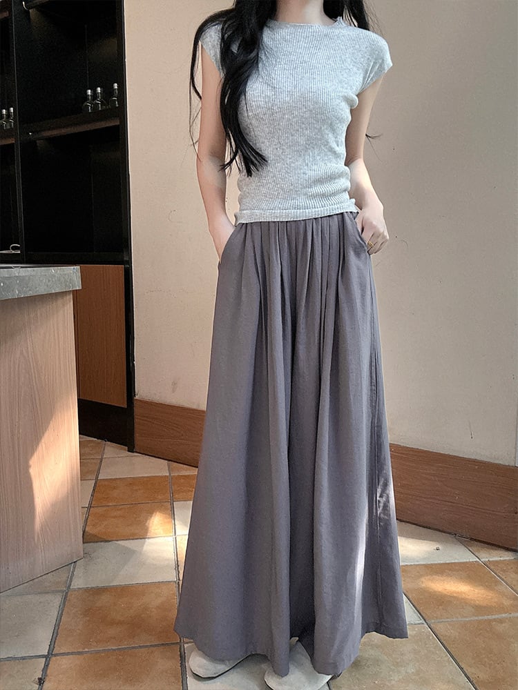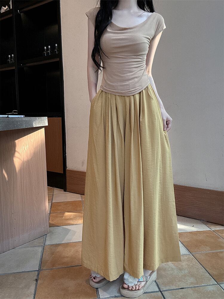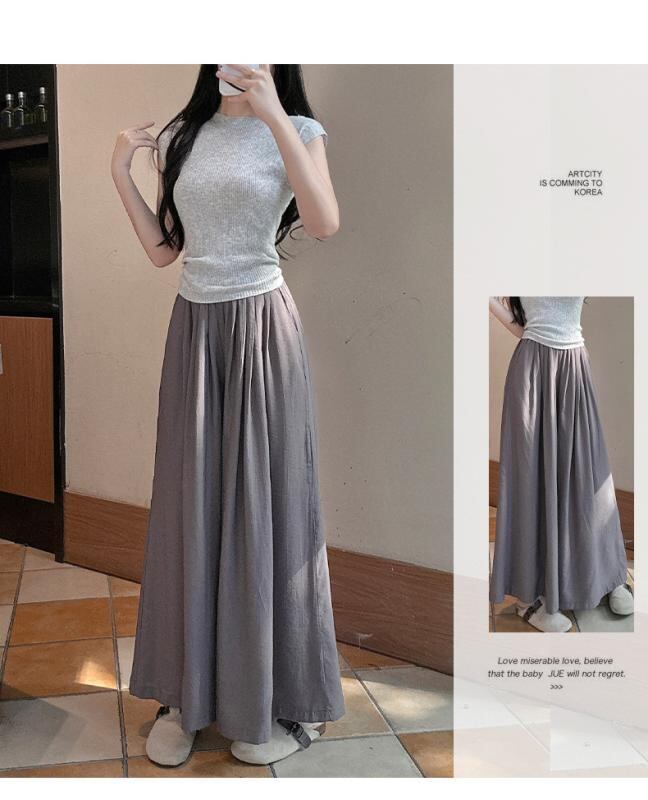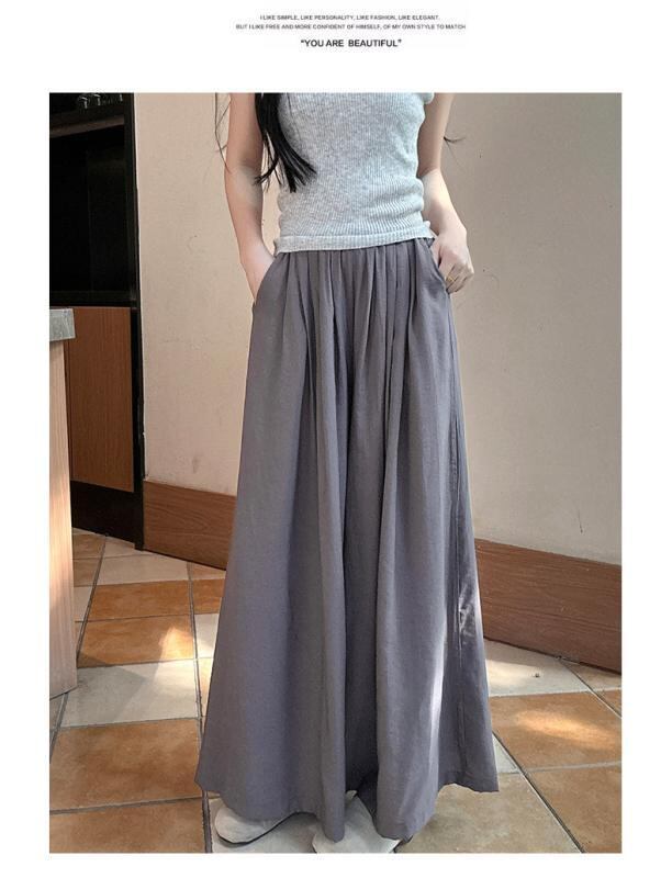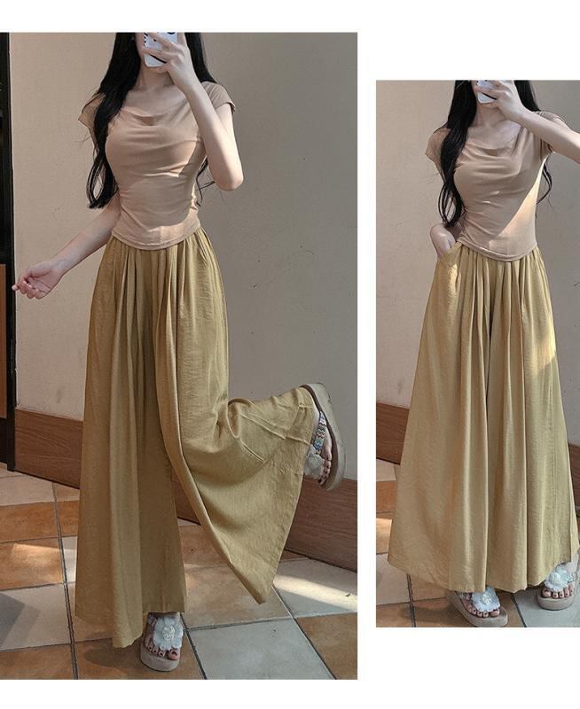 スカーチョ レディース 韓国風 リネン混 ワイド ストレート ウエストゴム ゆったり 体型カバー カジュアル 普段使い リラックス 伸縮性 中厚手 ロング丈パンツ