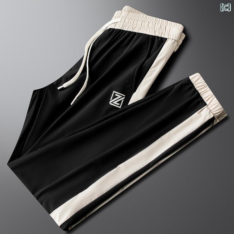 スウェットパンツ メンズ 男性用 高級感 薄手 夏用 配色切り替え プリント ジョガーパンツ テーパード ナイロン素材 吸湿速乾 通気性 耐摩耗性 日常使い カジュアル スポーツウェア ブルー カーキ ブラック ホワイト