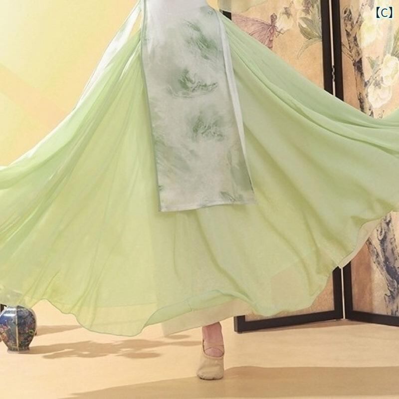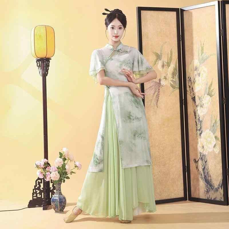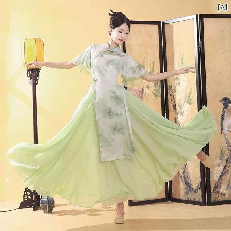 ダンス衣装 メンズ 中国舞踊 クラシカルダンス チャイナ風 旗袍柄 プリント トップス 上下セット 優雅な 練習着 稽古着 舞台衣装 発表会 演出服 ポリエステル素材 グリーン系