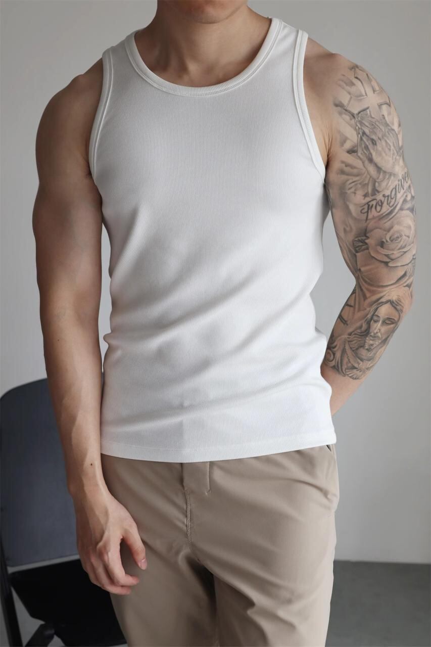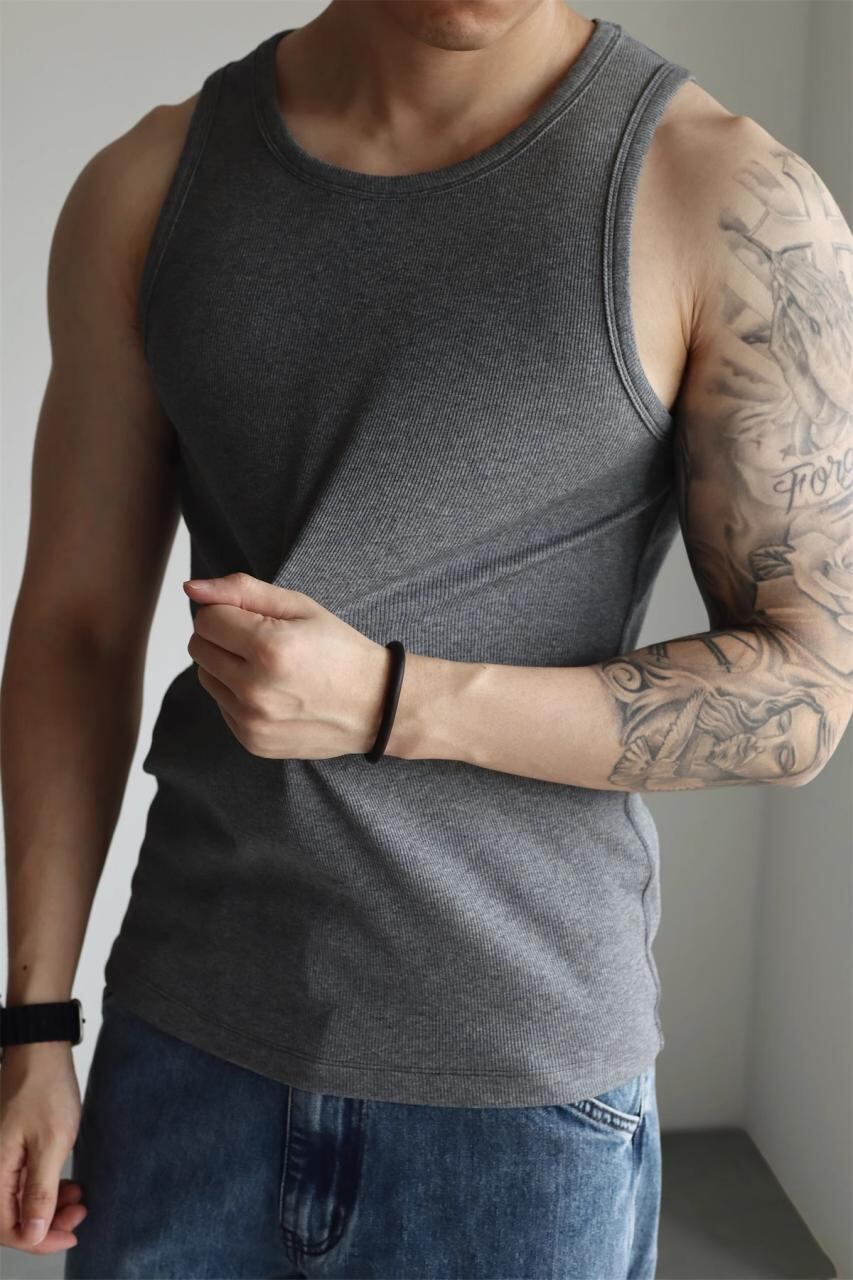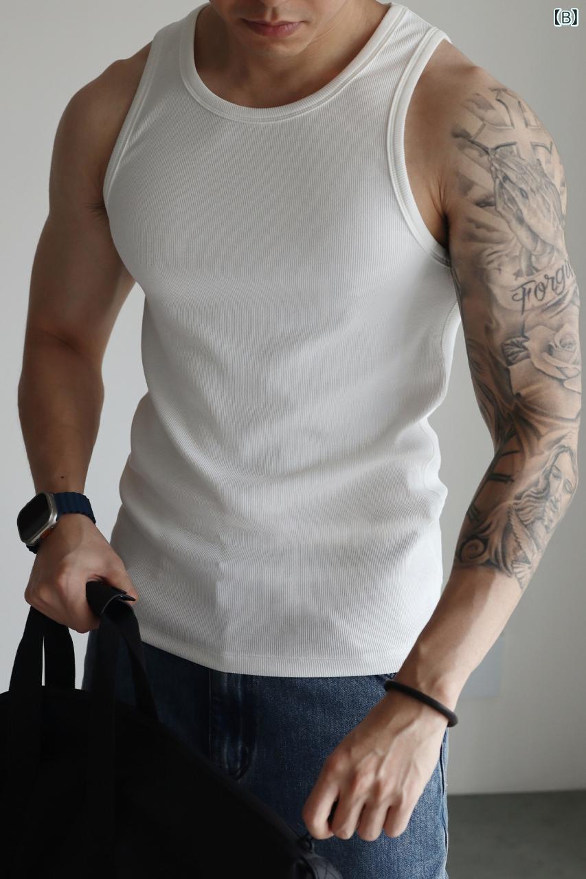 タンクトップ メンズ スリムフィット リブ編み スポーツ トレーニング インナー 280g ヘビーウェイト シルケット加工 モダール コットン スパンデックス混 薄手 夏 カジュアル 普段使い ダークグレー ホワイト ブラック