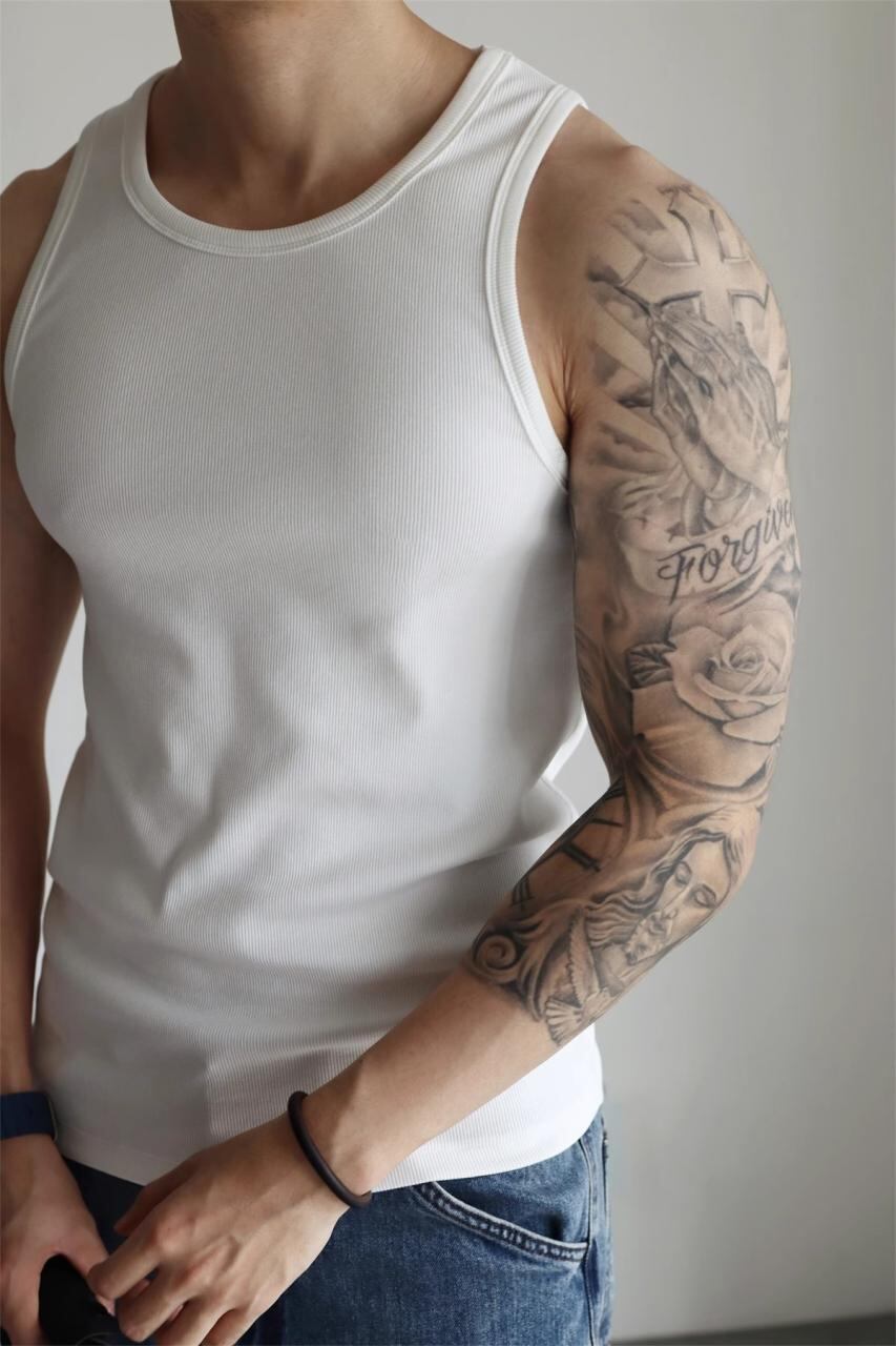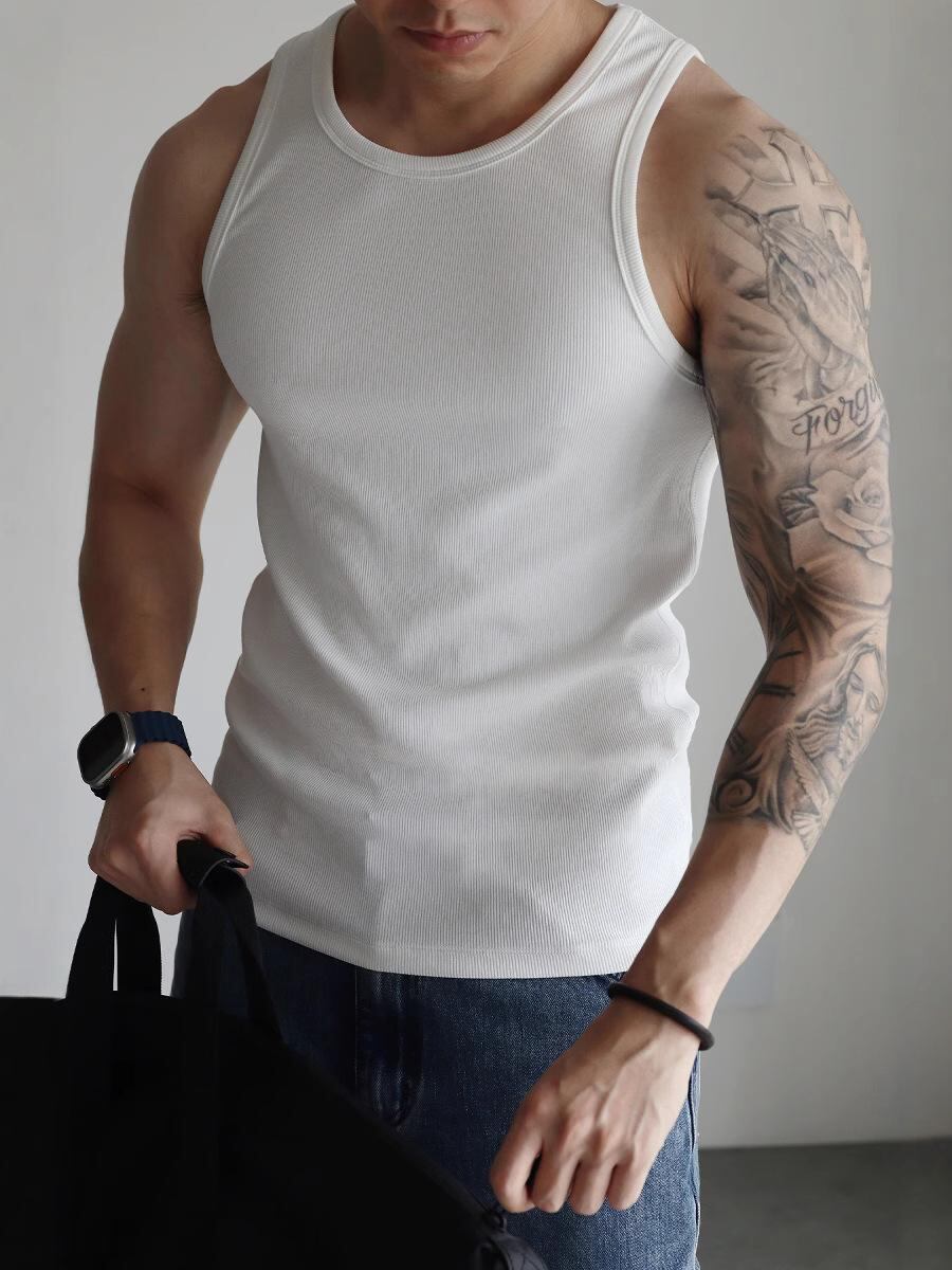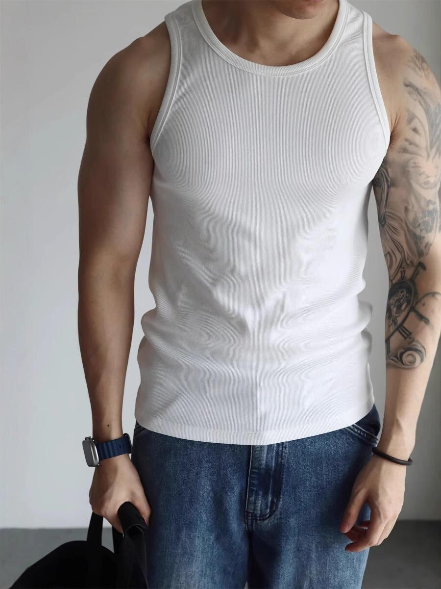 タンクトップ メンズ スリムフィット リブ編み スポーツ トレーニング インナー 280g ヘビーウェイト シルケット加工 モダール コットン スパンデックス混 薄手 夏 カジュアル 普段使い ダークグレー ホワイト ブラック