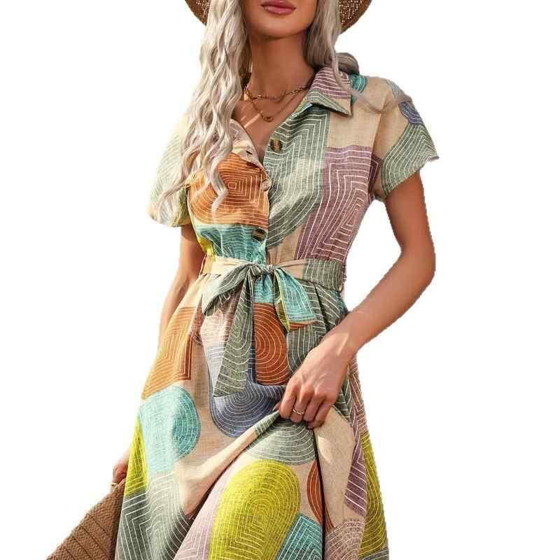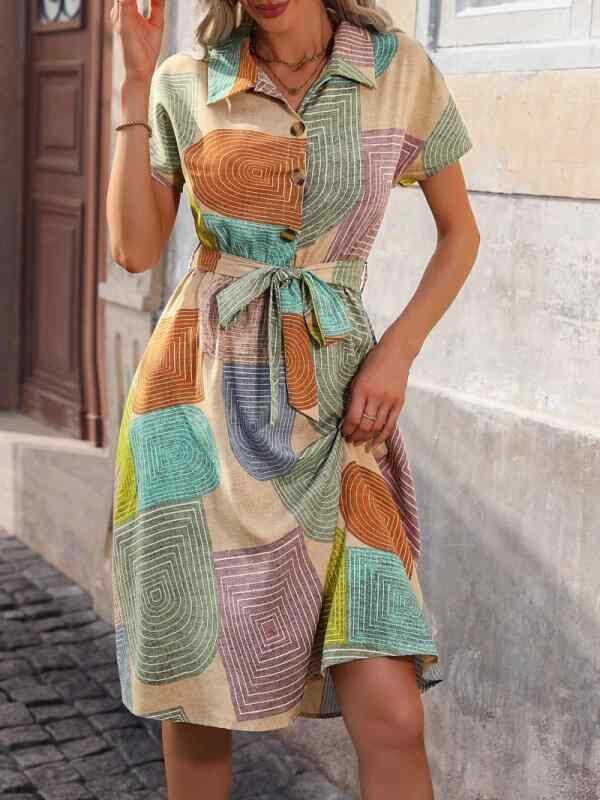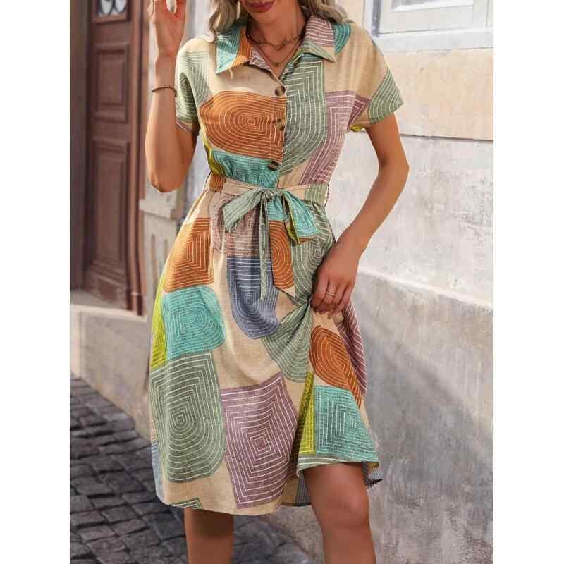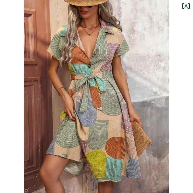 シャツワンピース レディース 襟付き 半袖 幾何学柄 プリント ウエストリボン ミディ丈 ゆったり リラックスフィット ポリエステル混 カジュアル きれいめ エレガント 通勤 オフィスカジュアル ライトアプリコット