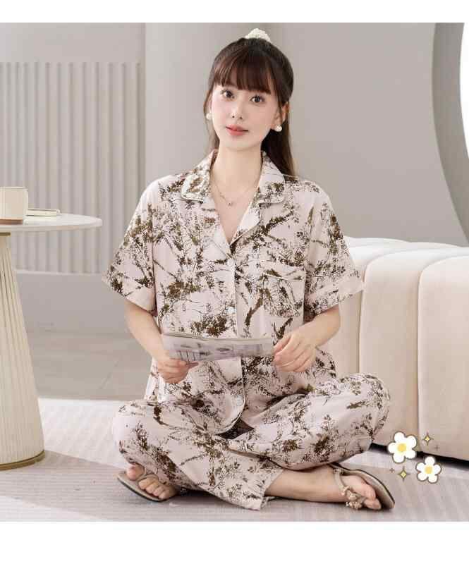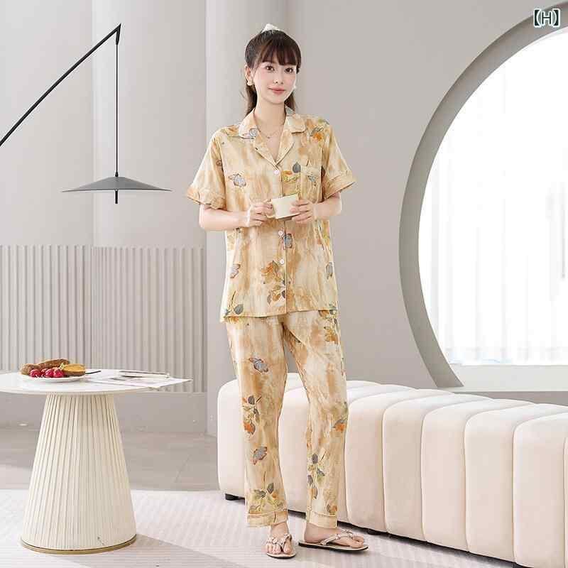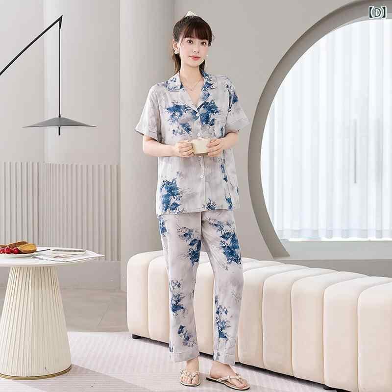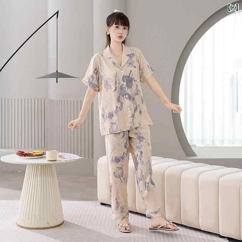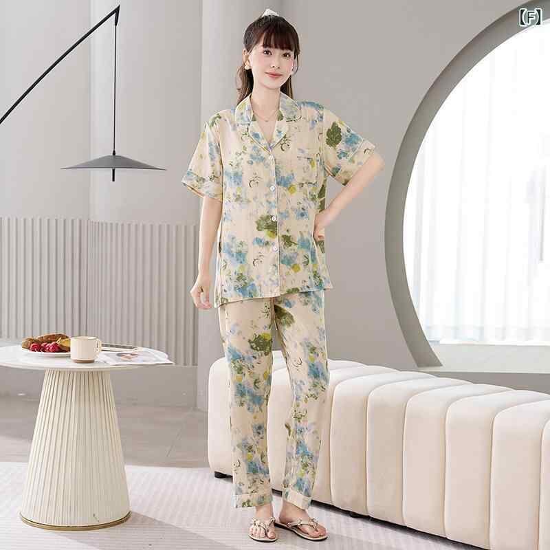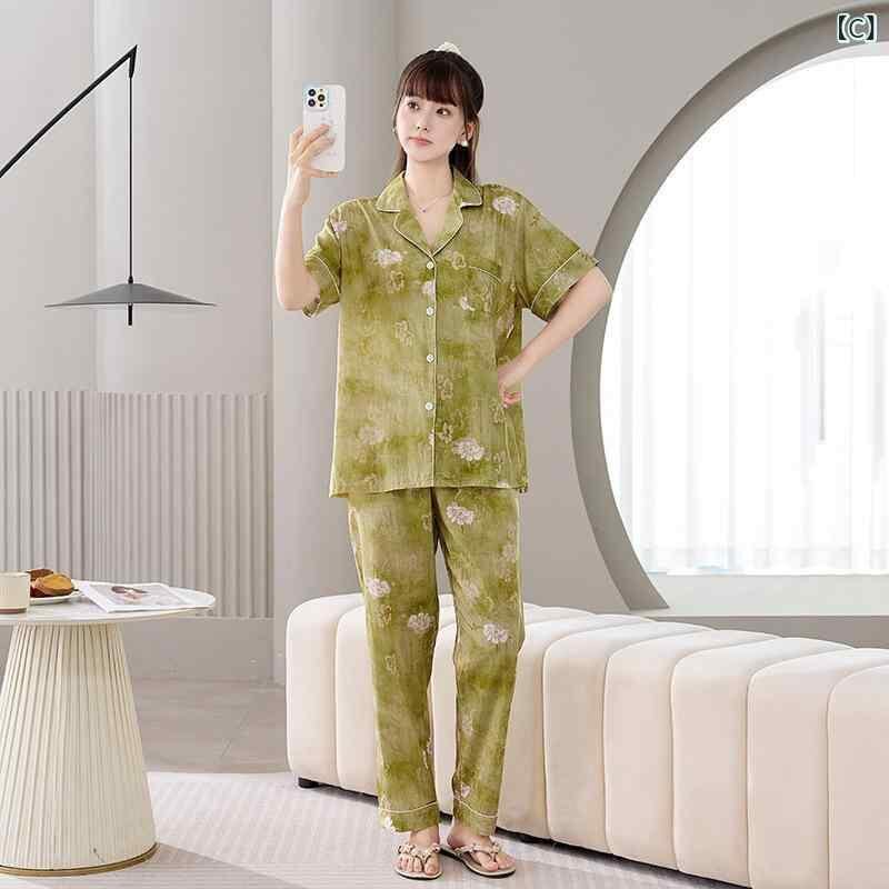 パジャマ レディース 半袖 長ズボン 上下セット ルームウェア ワンマイルウェア 薄手 高級感 開襟 再生繊維 通気性 快適 リラックス 夏用 総柄