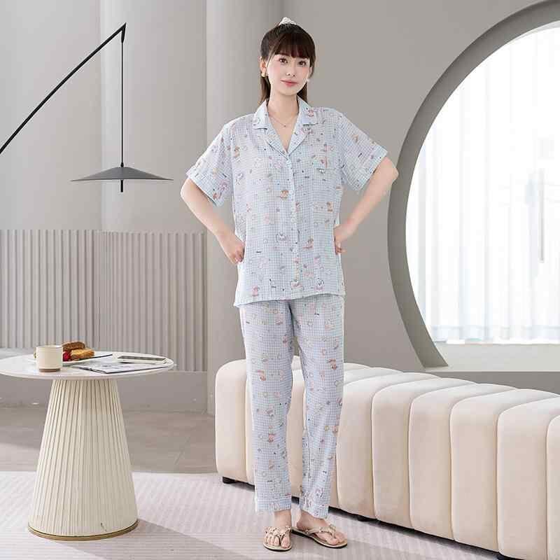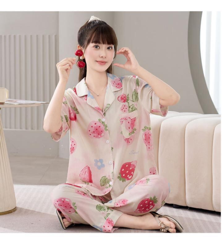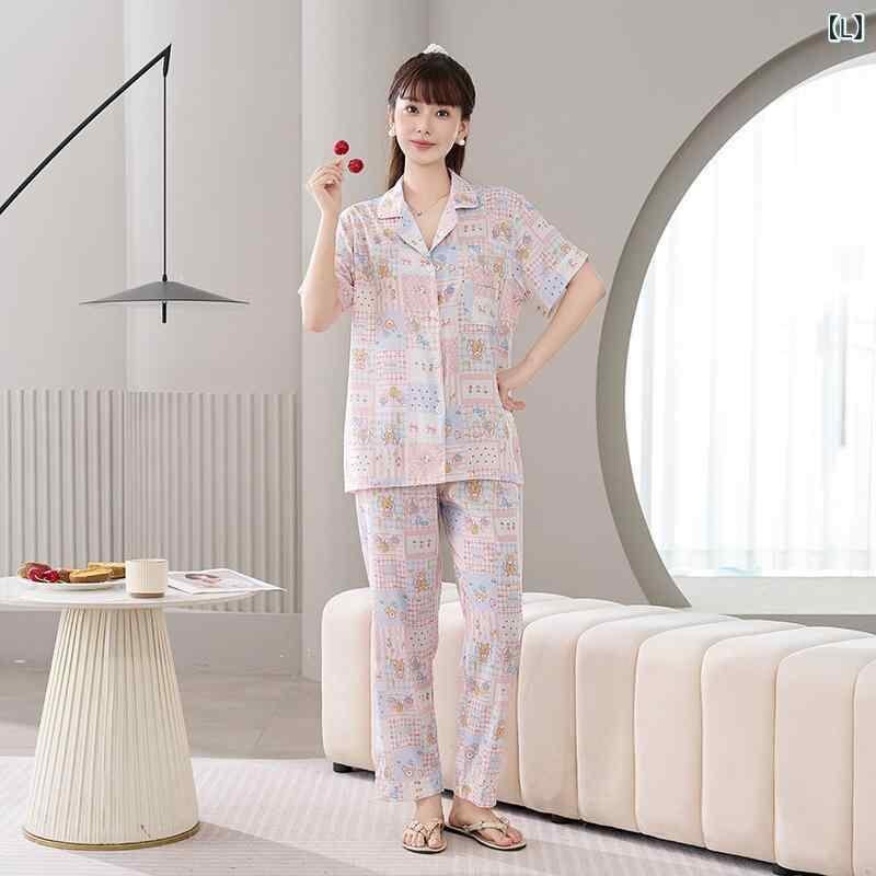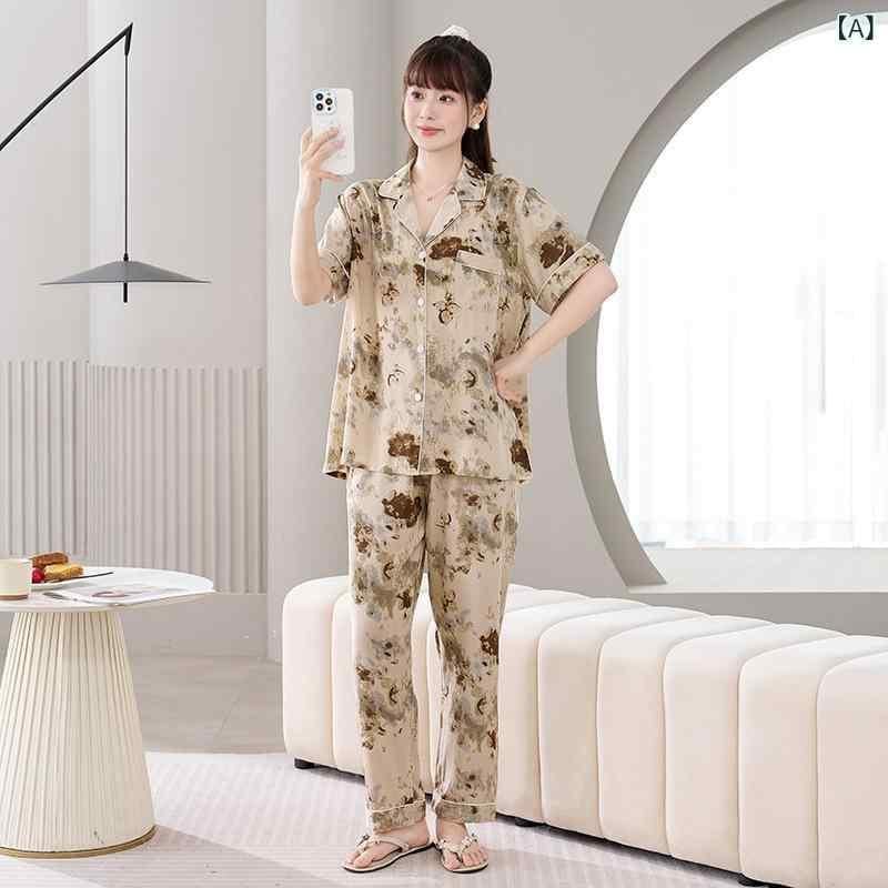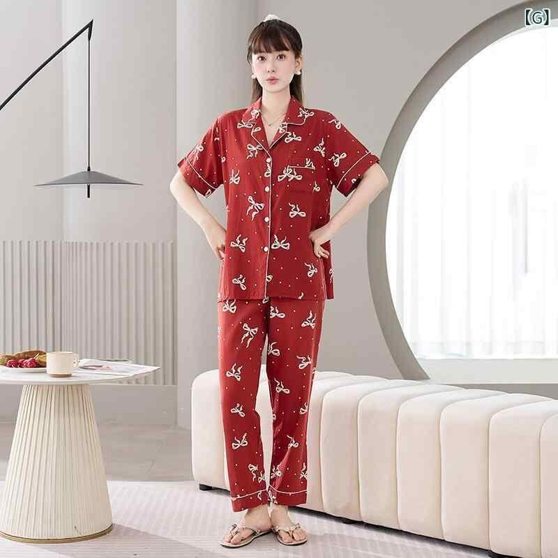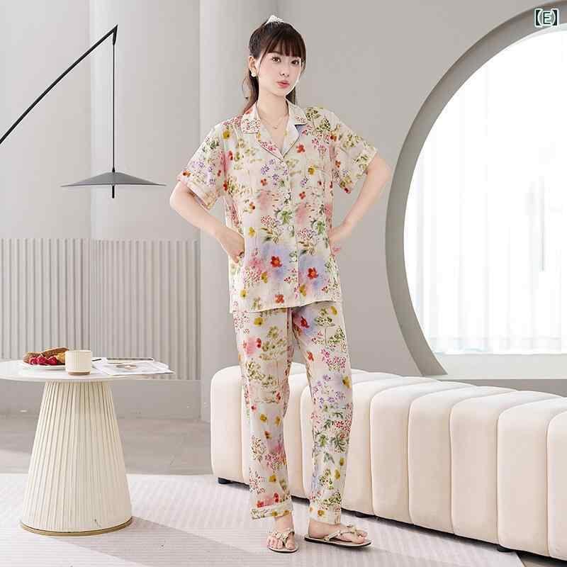 パジャマ レディース 半袖 長ズボン 上下セット ルームウェア ワンマイルウェア 薄手 高級感 開襟 再生繊維 通気性 快適 リラックス 夏用 総柄