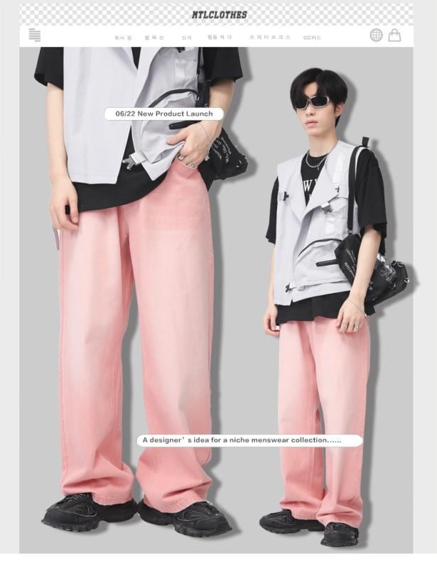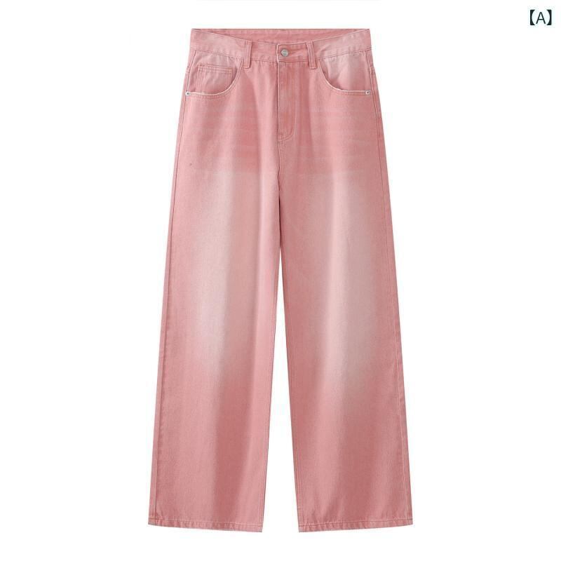 デニムパンツ メンズ ピンク ストレート ワイドレッグ ゆったり ルーズフィット 綿混紡 ウォッシュ加工 韓国ファッション オールシーズン 普段使い
