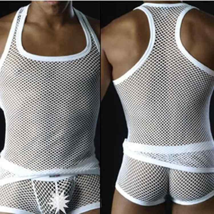 タンクトップ メンズ 男性用 透明 超薄 メッシュ 通気性 セクシー ぴったりフィット ボディシェイプ 加圧 シームレス Uネック インナー 春夏 ナイロン ポリエステル ブラック ホワイト