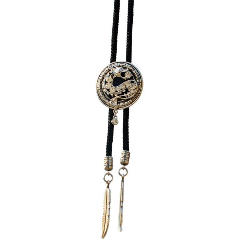 ボロタイ メンズ ループタイ 男性用 ネックレス 宝石付き ペンダント 韓国ファッション トレンド PUレザーコード アローヘッド型 カジュアルスタイル 高品質クリスタル 龍モチーフ